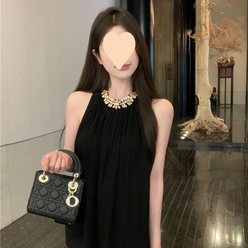 여성을위한 블랙 홀터넥 민소매 쉬폰 셔츠 2025 여름 새로운 스타일 헤비 드릴 체인 루즈 슬리밍 셔츠 핫 소녀 탑
