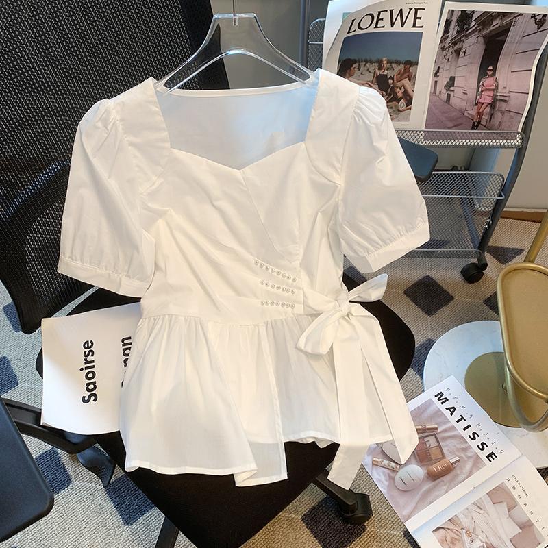 여름 흰색 짧은 쉬폰 셔츠 여성 여름 착용 2025 새로운 탑 반팔 허리 셔츠 세련되고 세련된스토어 가기