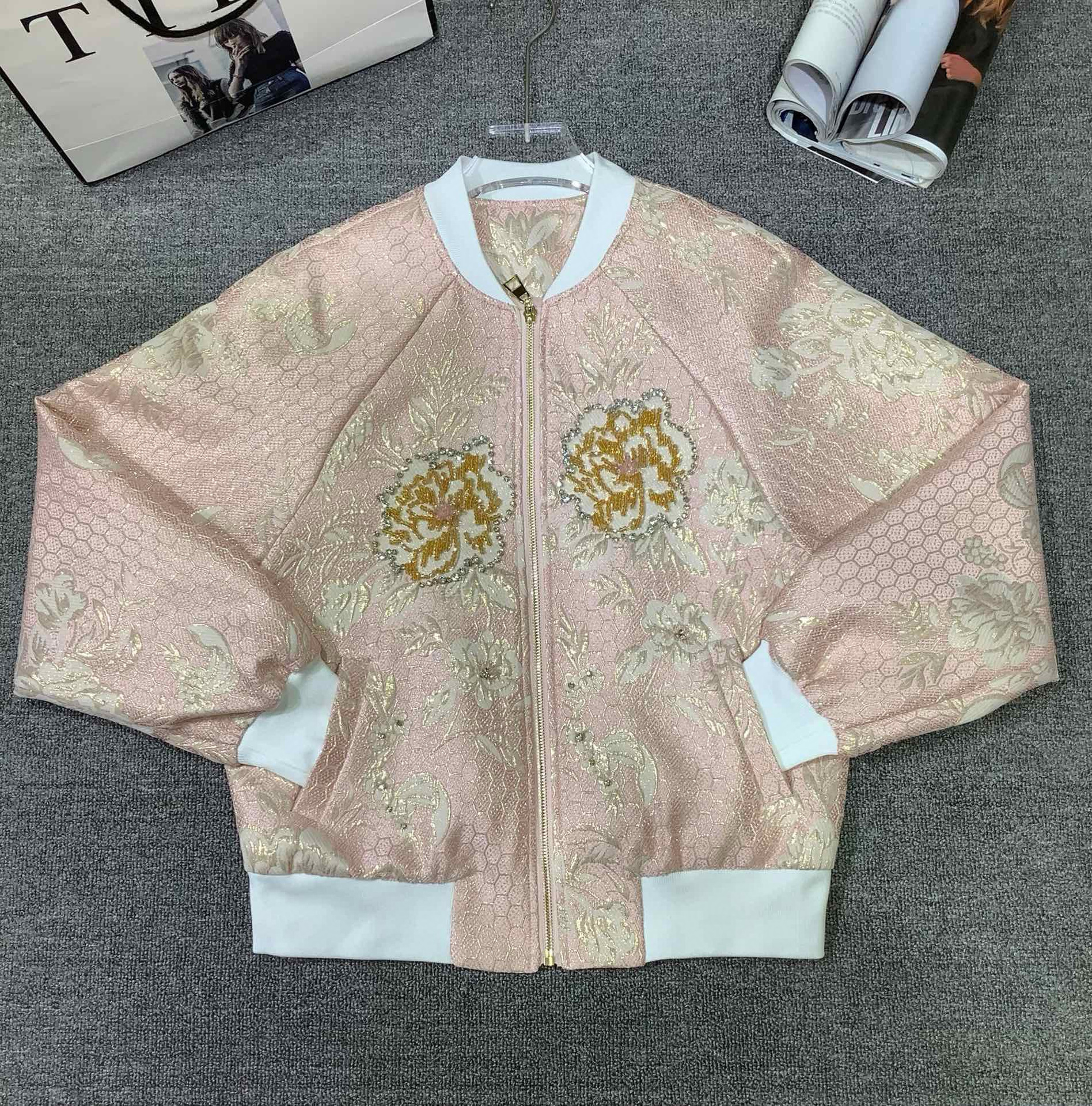 새로운 중국 스타일 실크 자켓 라이트 핑크 골드 라인 꽃 자수 짧은 코트 여성 중공업 라인 석 야구 유니폼 2025 트렌드스토어 가기