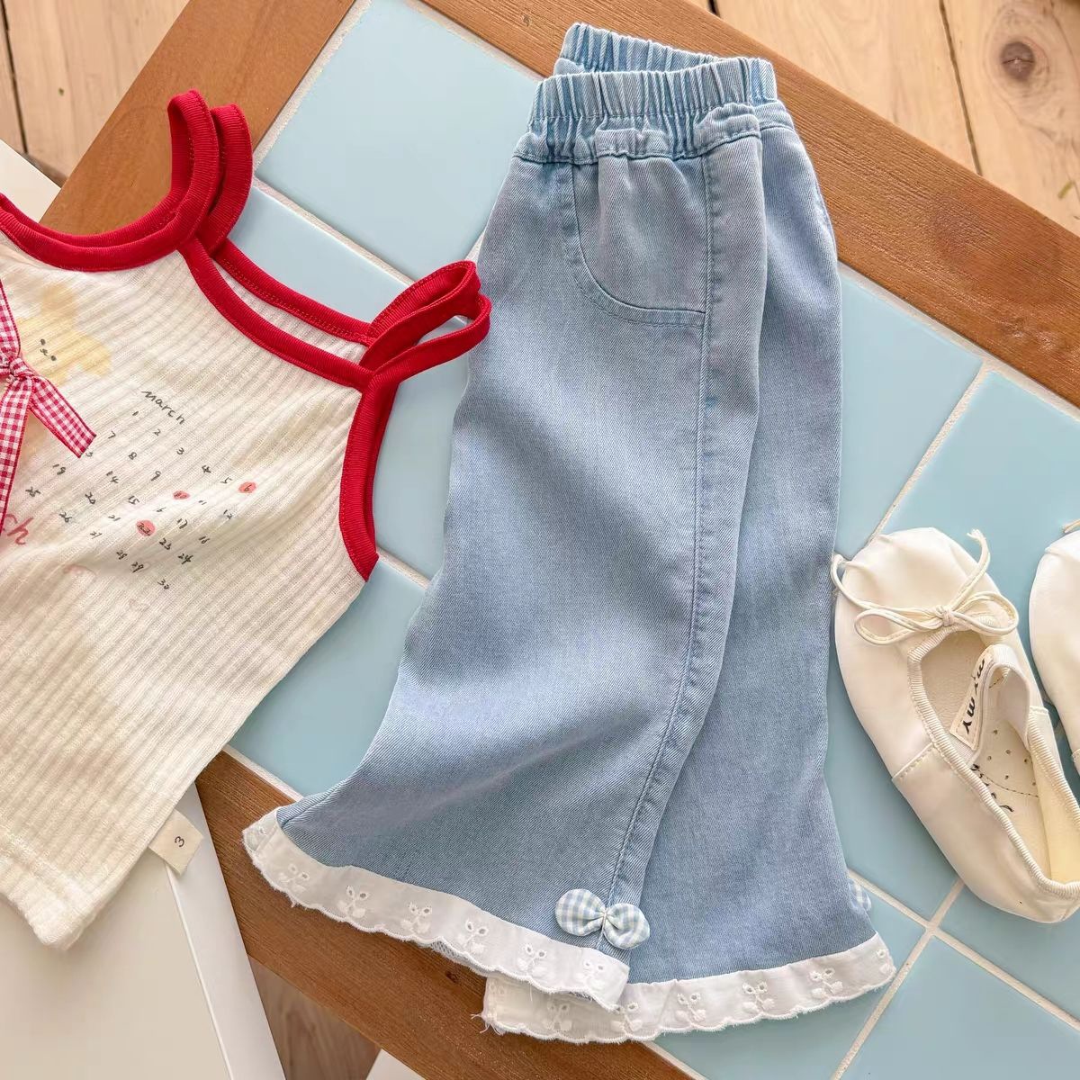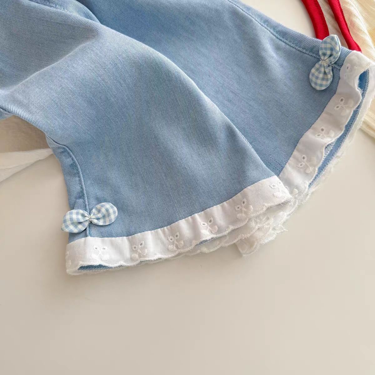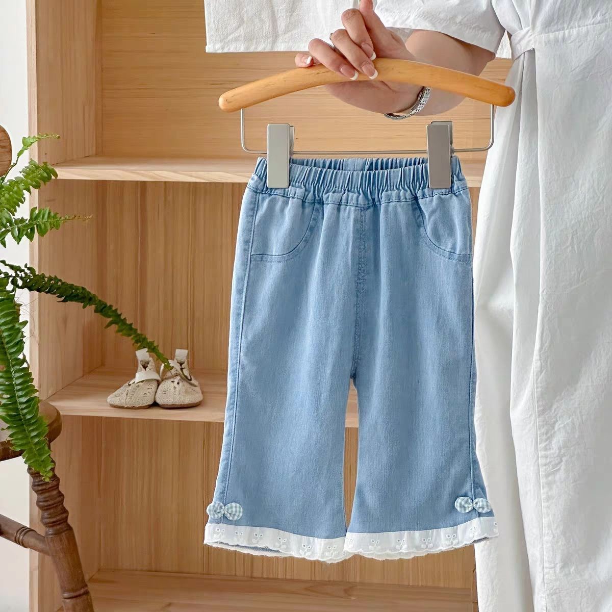 여아 여름 청바지, 유아 패션, 아동 개성 트렌디 한국식 레이스 텐셀 보우 체크 무늬 크롭 팬츠스토어 가기