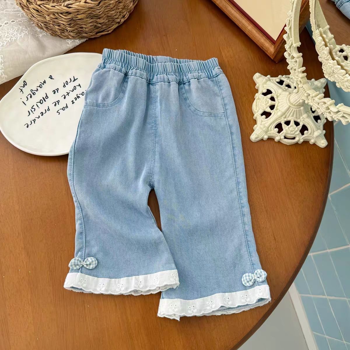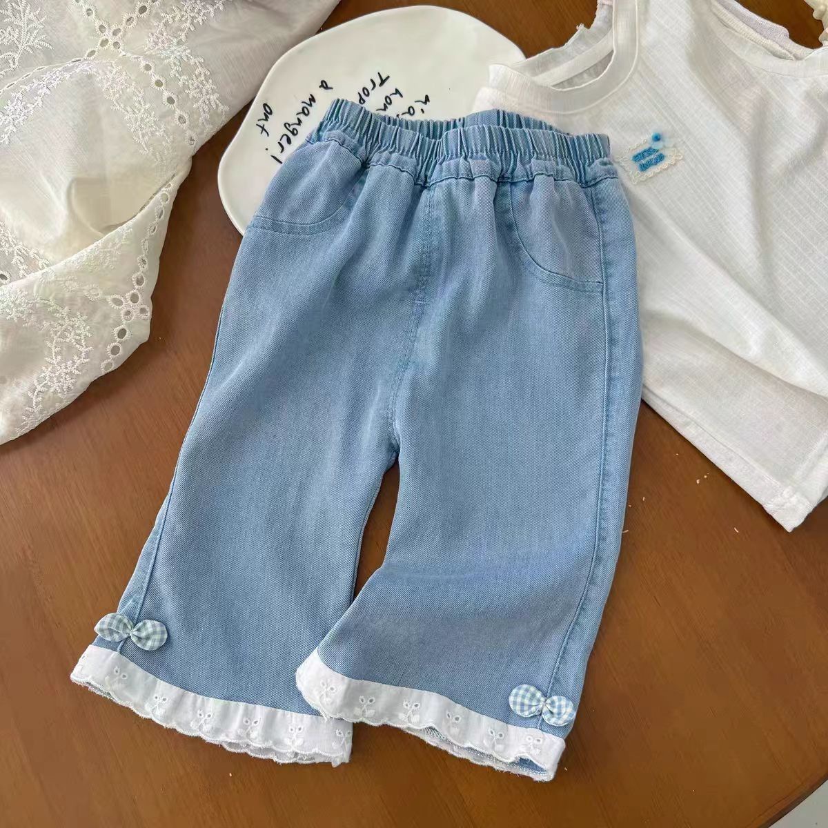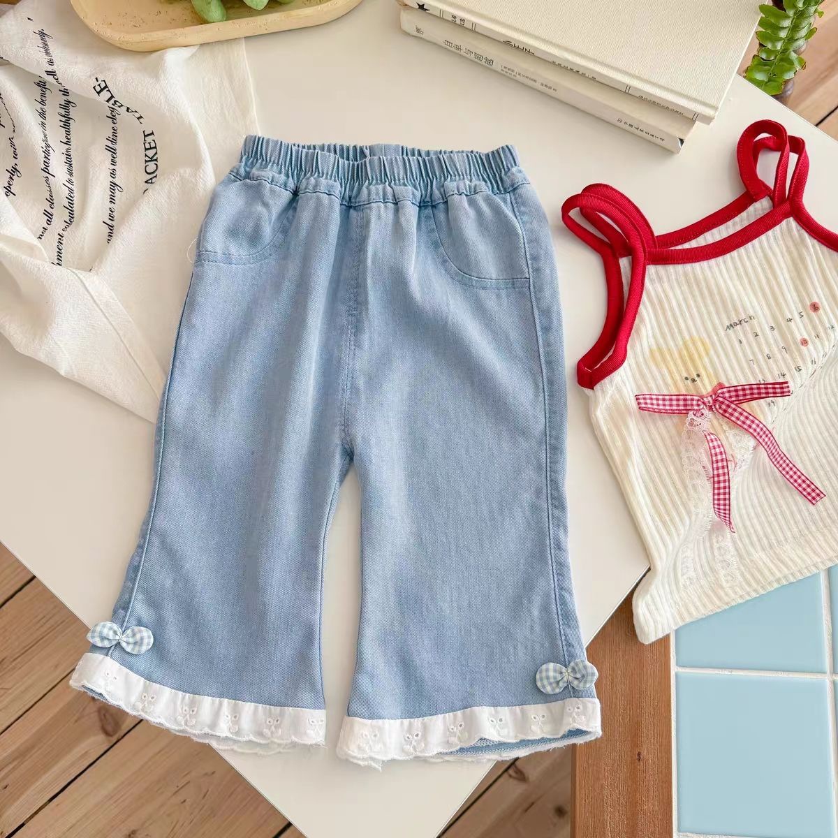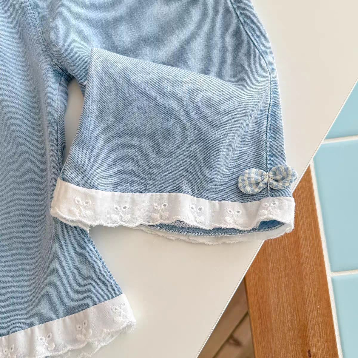여아 여름 청바지, 유아 패션, 아동 개성 트렌디 한국식 레이스 텐셀 보우 체크 무늬 크롭 팬츠