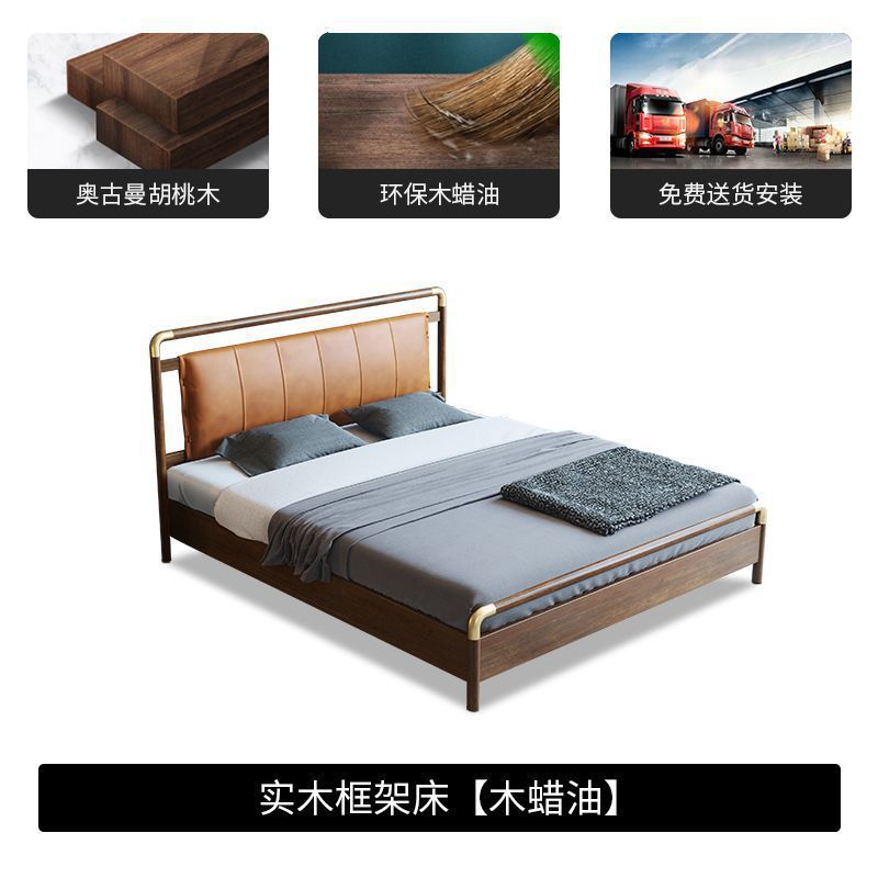 호두나무 침대, 모던하고 심플한 마스터 침실, 더블 침대, 부드러운 등받이, 홈 웨딩 침대, 대형 원목 모델