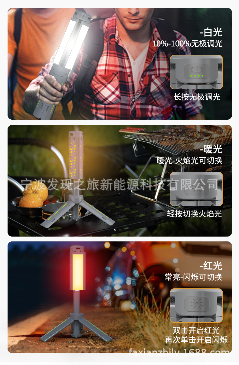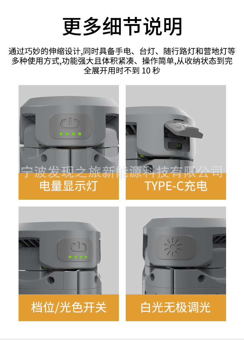 亮度调节 白光照明灯(长按无极调光),10-100亮度随心调。