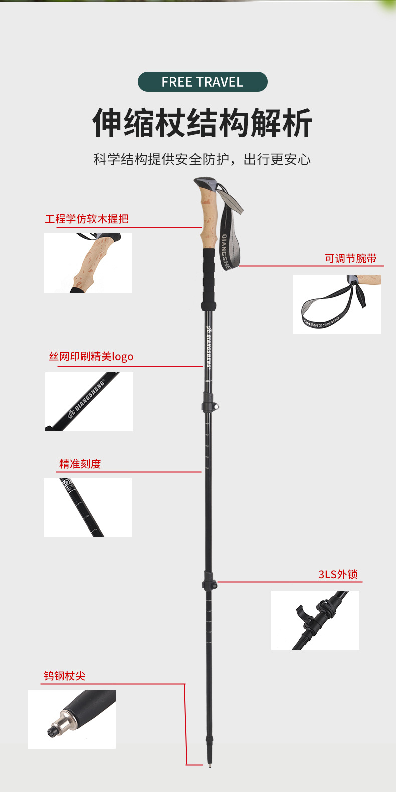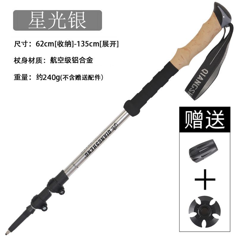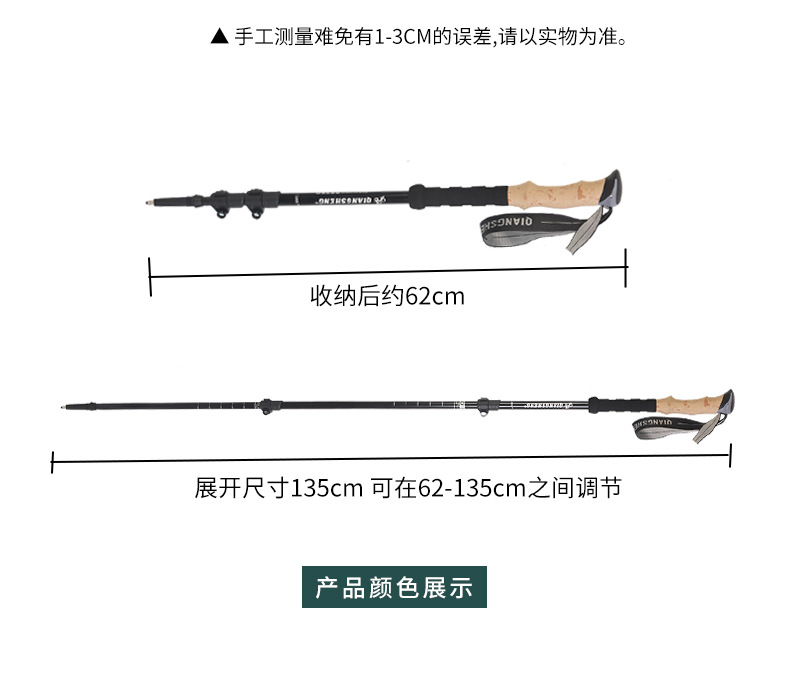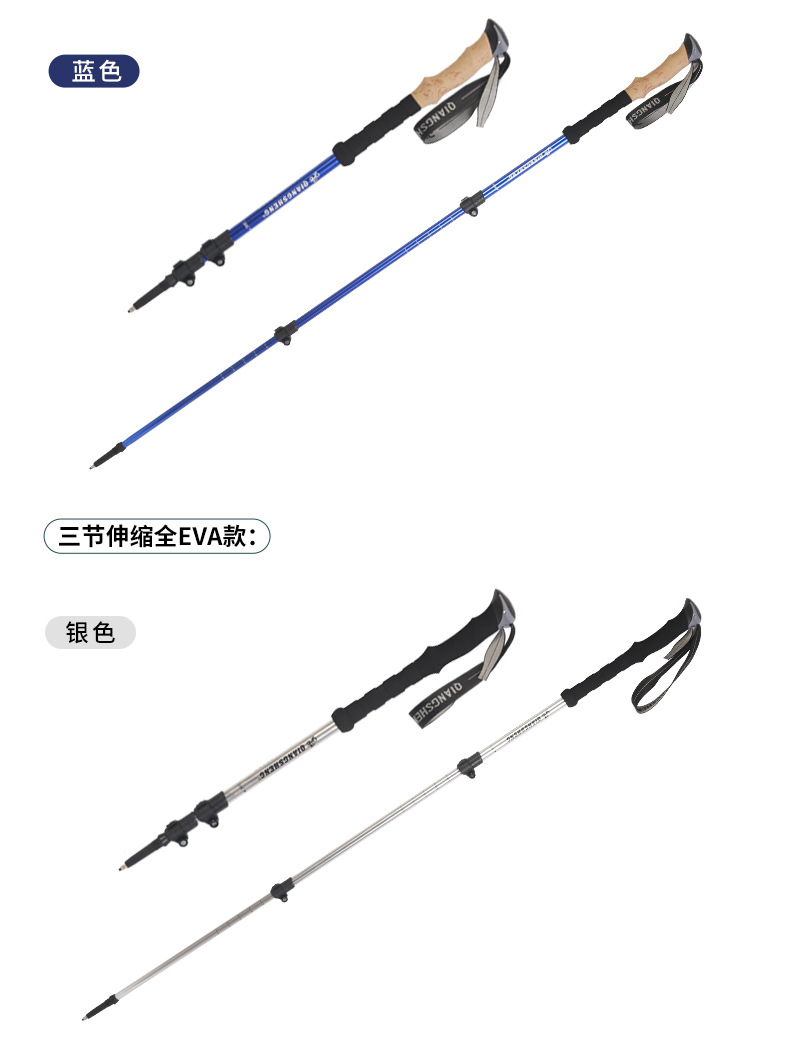 户外铝合金登山杖6061外锁三节伸缩杖仿软木全包吸汗手柄厂家批发