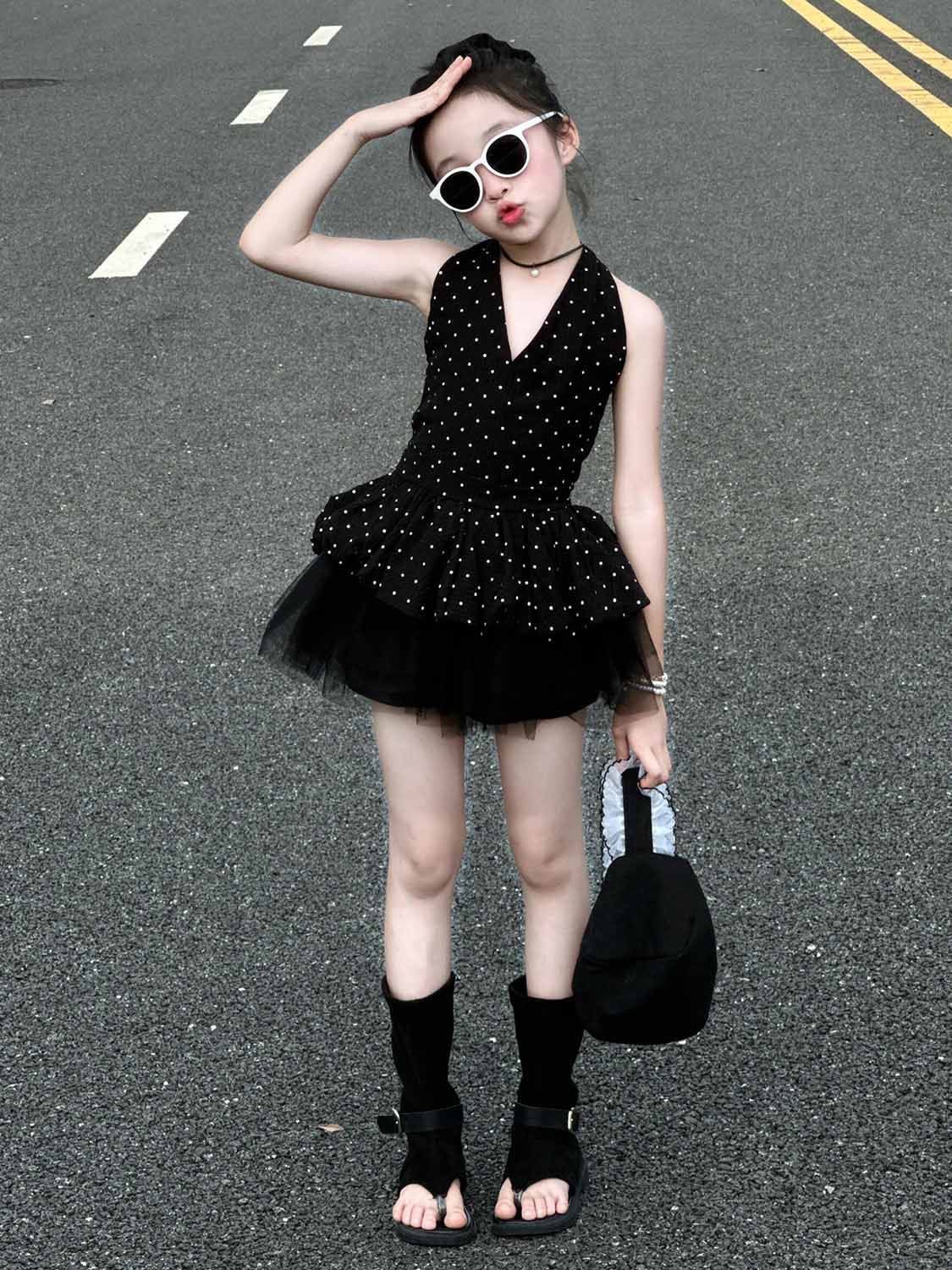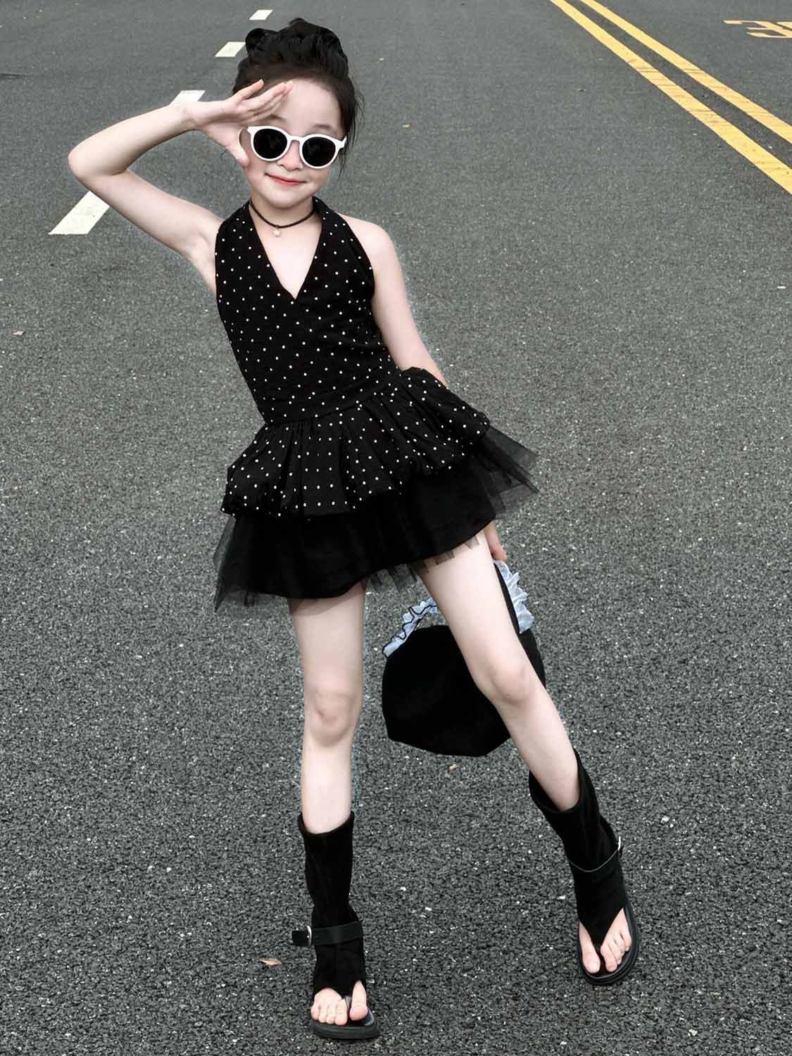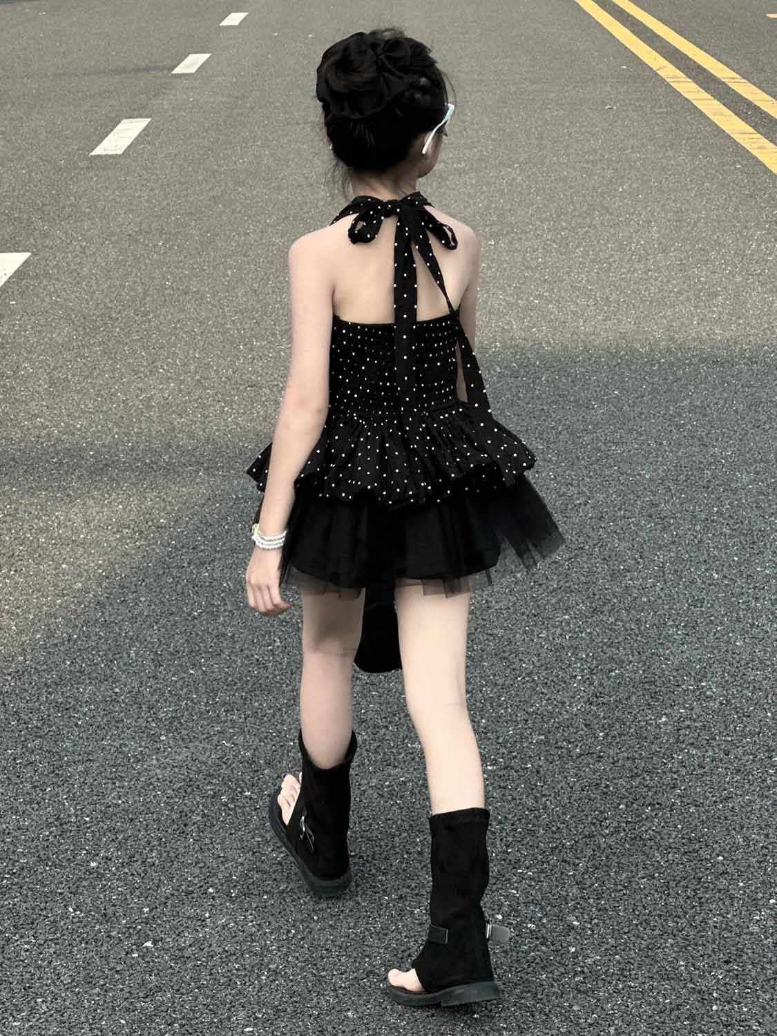 한국 스타일 여자 2025 여름 새로운 검은 폴카 도트 홀터넥 캐미솔 여자 민소매 탑 하프 길이 거즈 스커트스토어 가기
