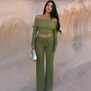 亚马逊2025跨境外贸女装秋季新款时尚一字肩长袖上衣阔腿裤套装女