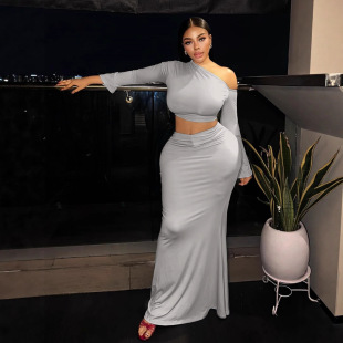 欧美风2025秋季跨境女装性感短款露脐斜肩上衣高腰包臀半身裙套装