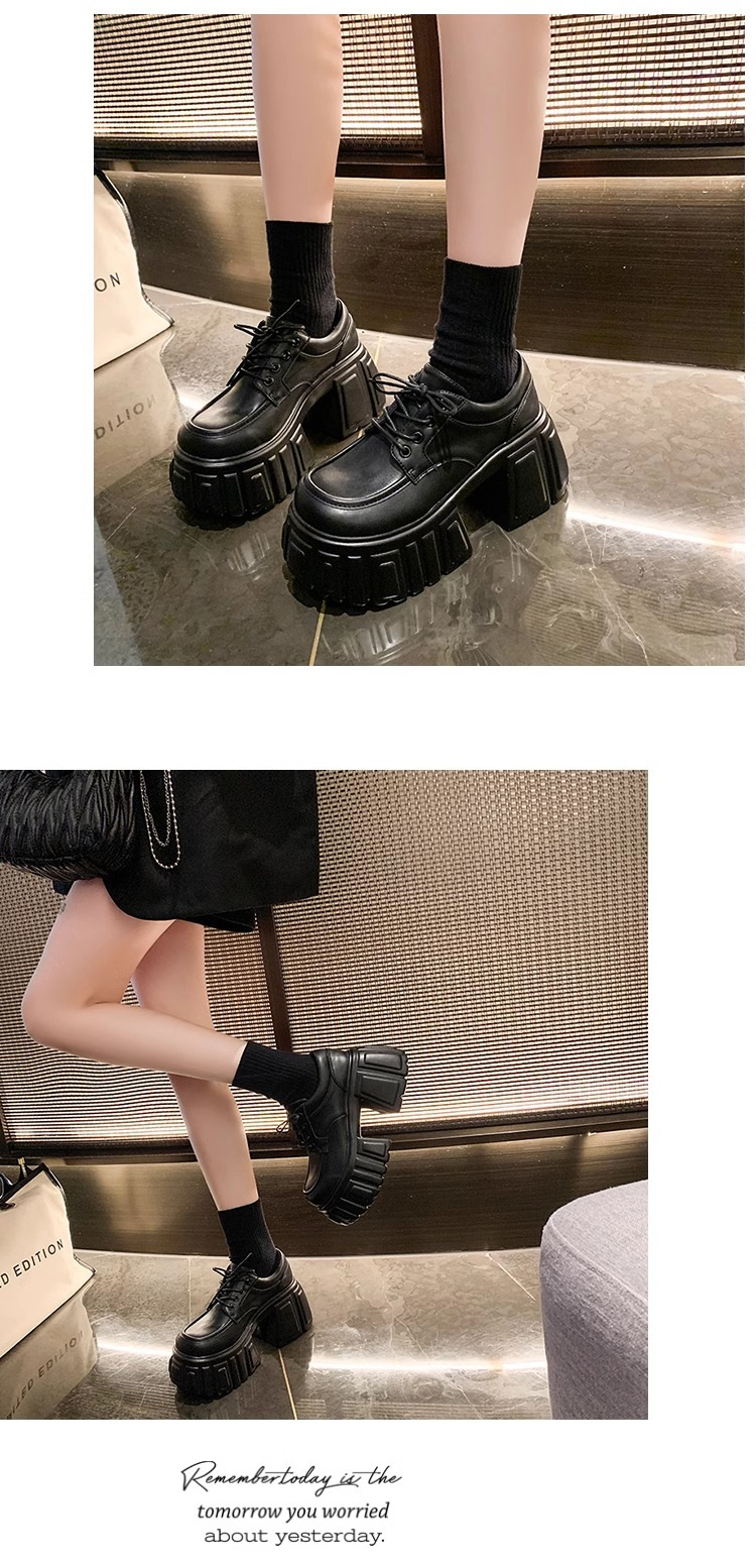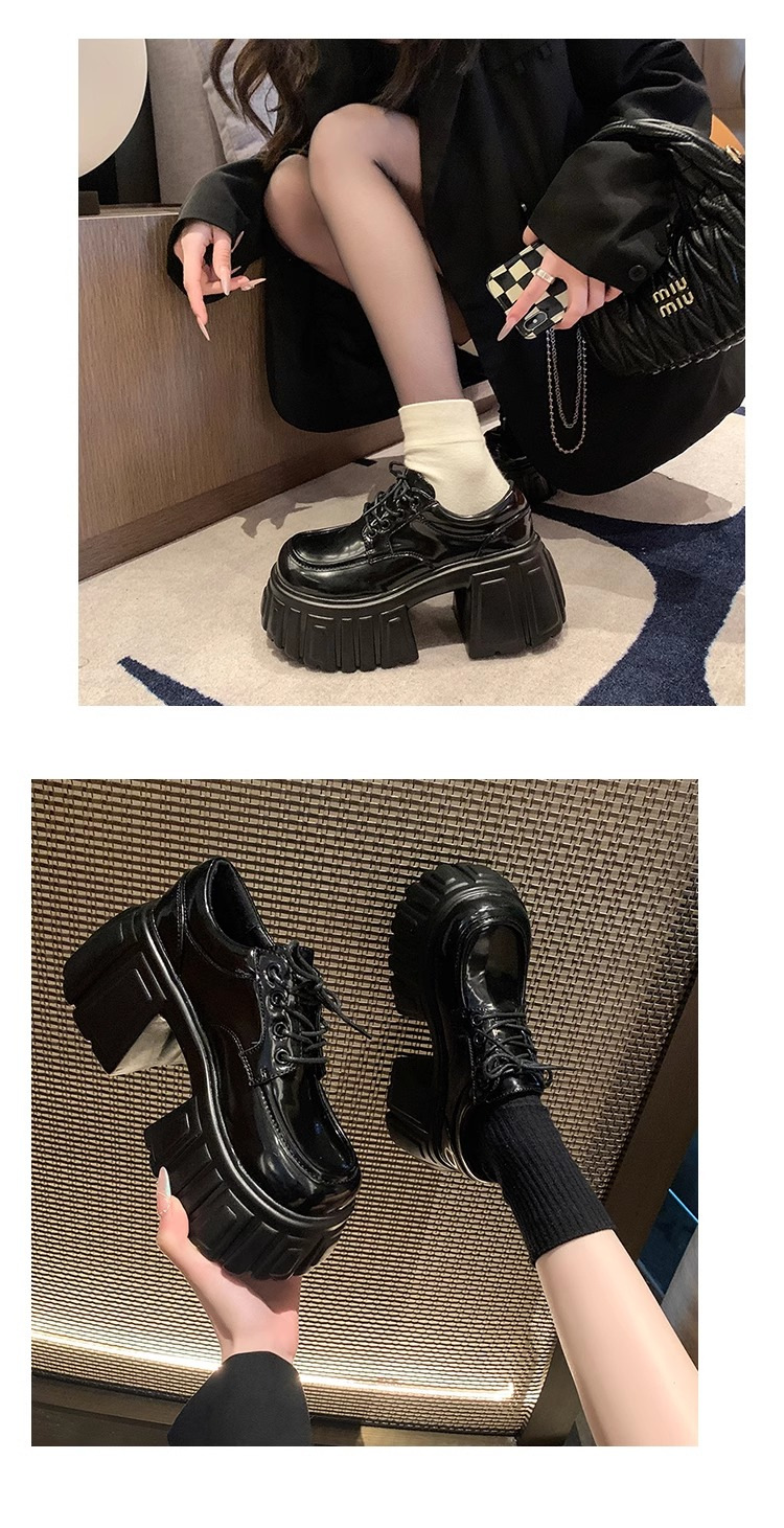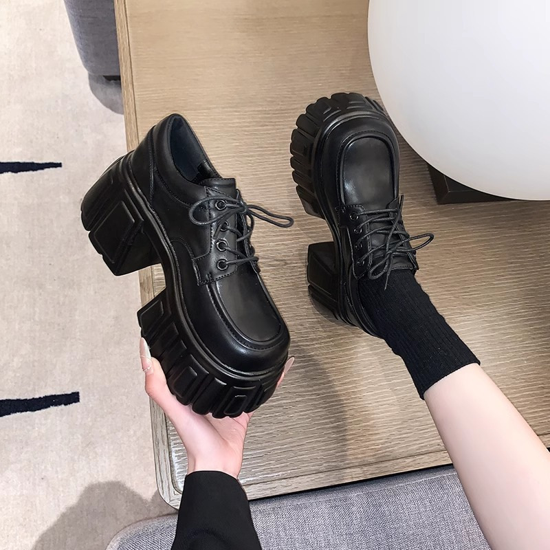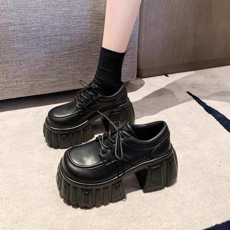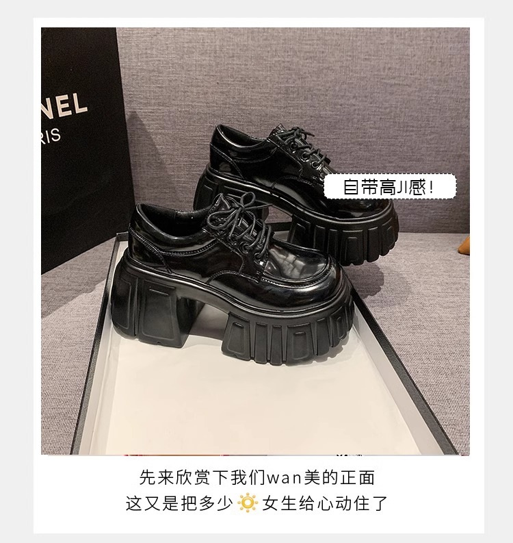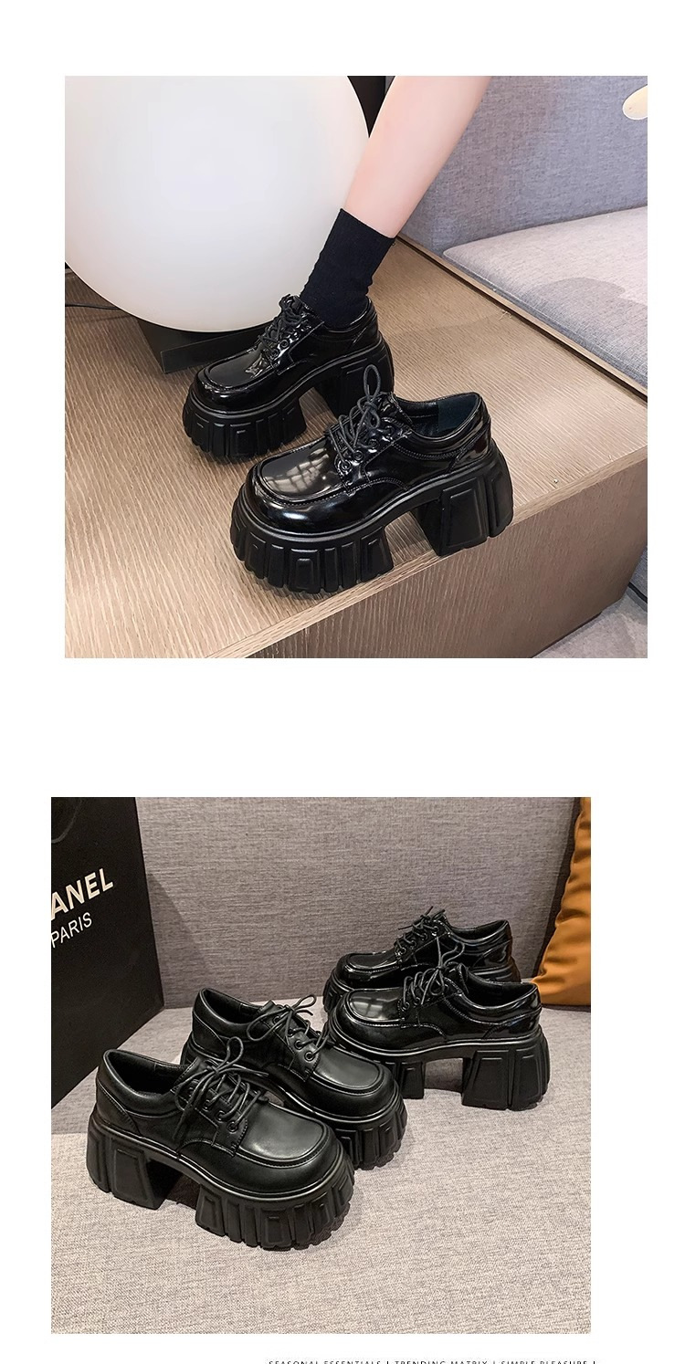 여성을위한 유럽 슈퍼 두꺼운 밑창 높이 힐 레이스 업 신발 2025 봄, 가을 플랫폼 라운드 발가락 로퍼 영국 스타일 작은 가죽 신발스토어 가기