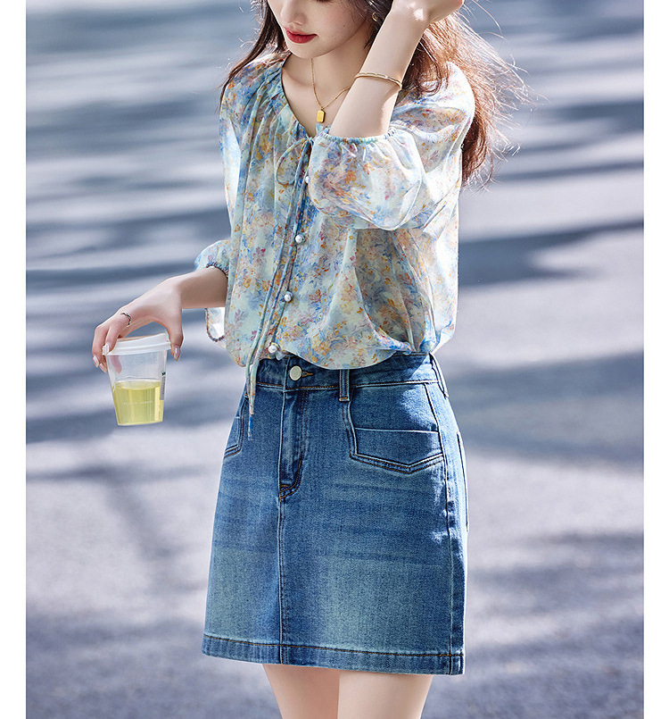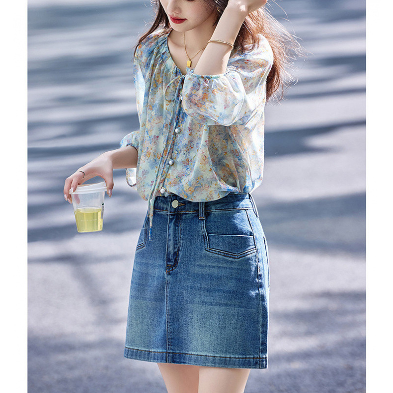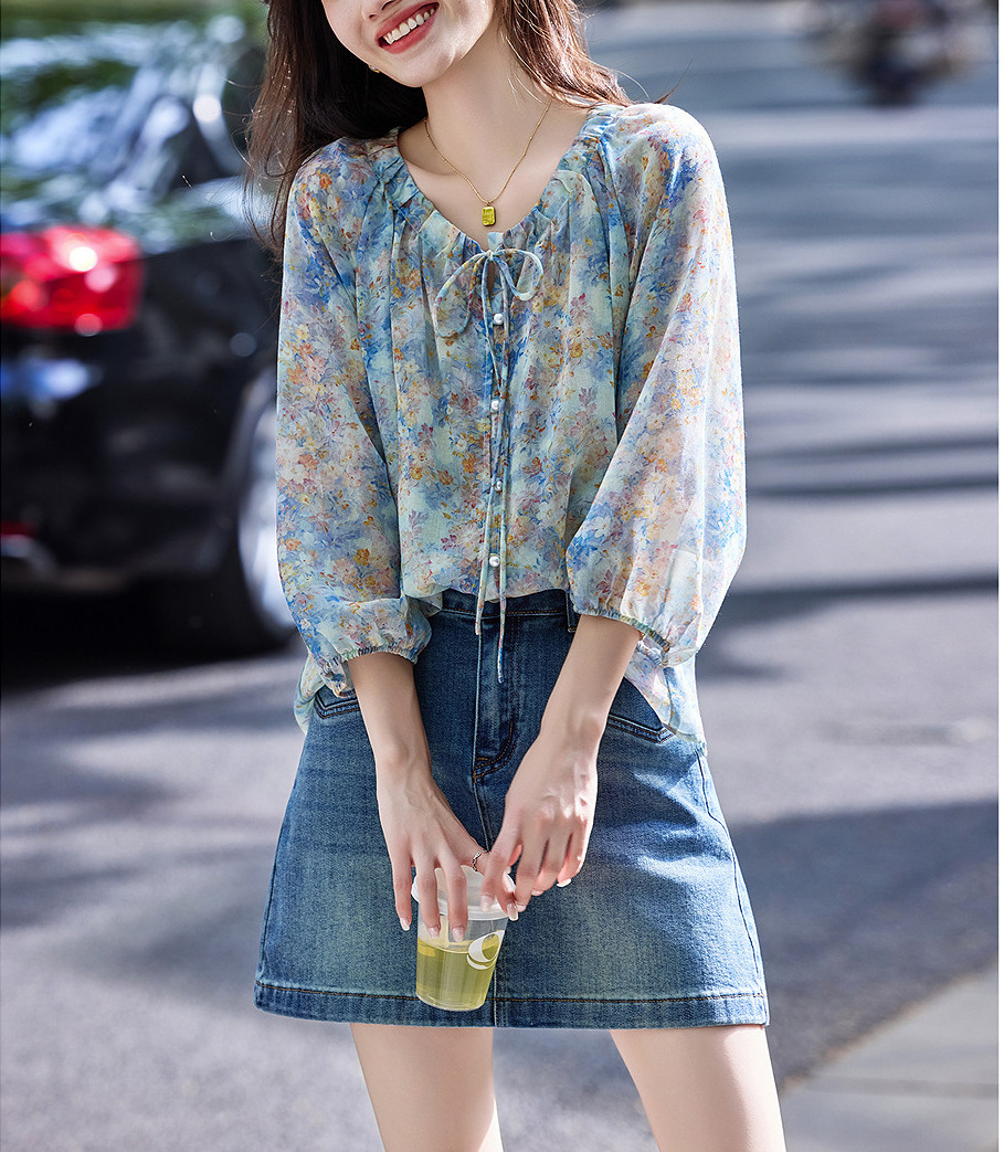 여름 루즈하고 슬림한 브이넥 시크하고 아름다운 바이저 셔츠 탑 프렌치 플로럴 쉬폰 여성용 통근 셔츠
