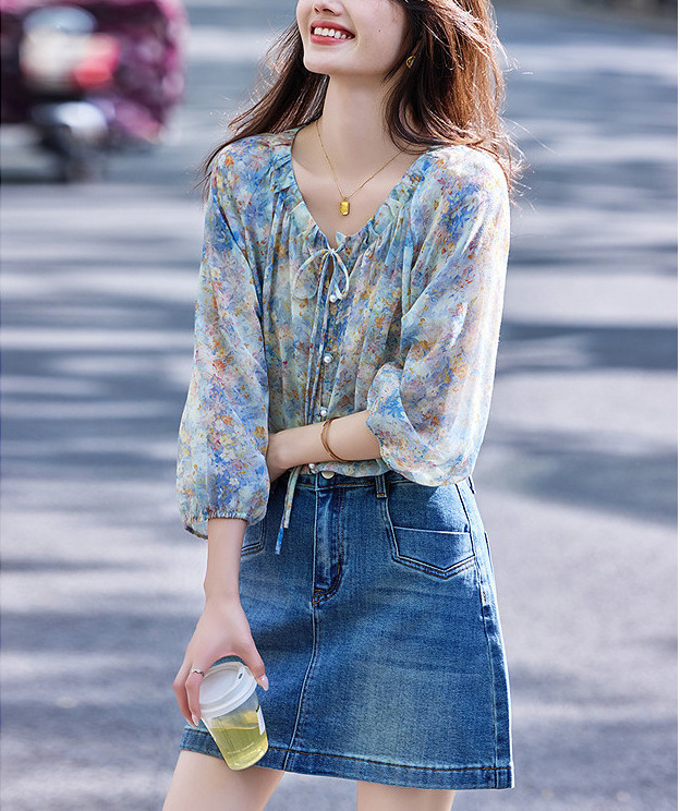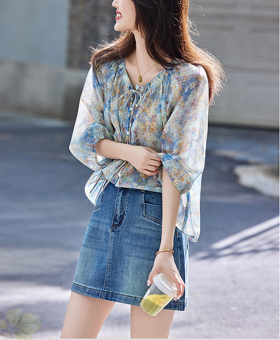 여름 루즈하고 슬림한 브이넥 시크하고 아름다운 바이저 셔츠 탑 프렌치 플로럴 쉬폰 여성용 통근 셔츠스토어 가기