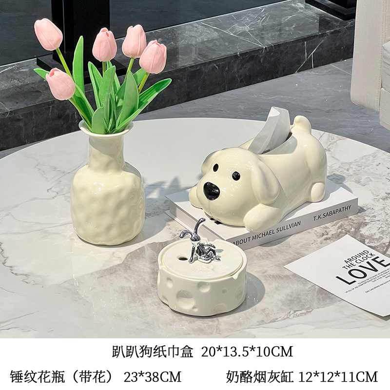 • ₮【밀크 화이트】티슈 박스 + 치즈 재떨이 + 해머드 무늬 화병 (핑크 튤립 포함)