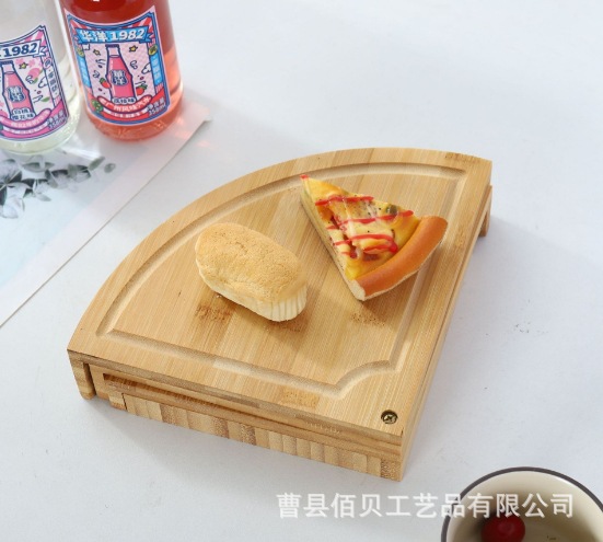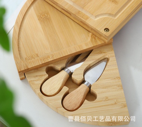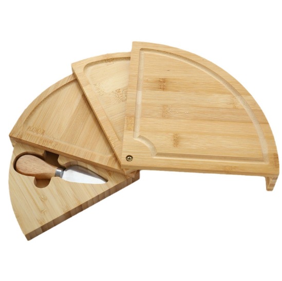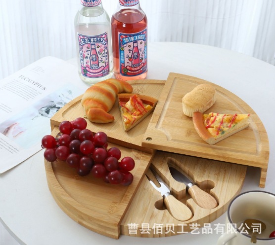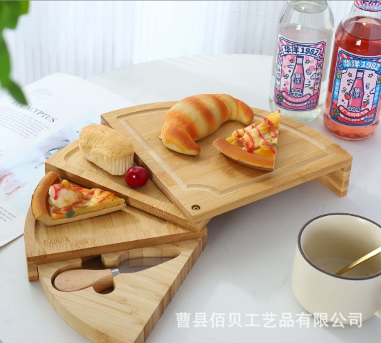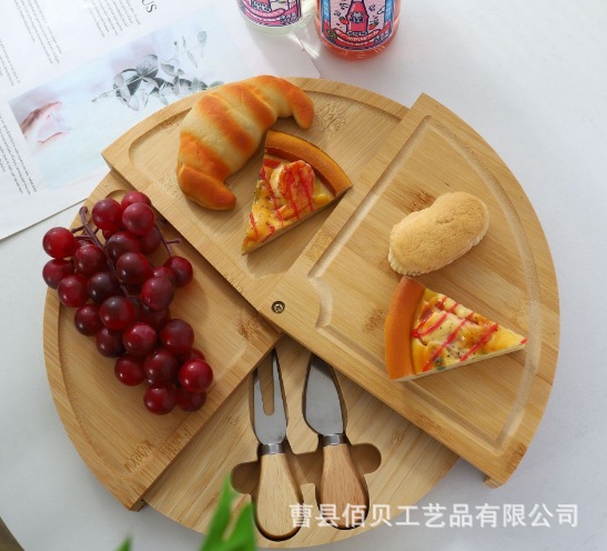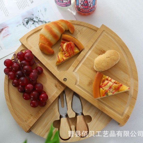 창의적인 대나무 치즈 보드 세트, 원형 개폐식 나무 치즈 보드, 칼과 포크 스테이크 빵 포함, 단단한 나무 디너 플레이트