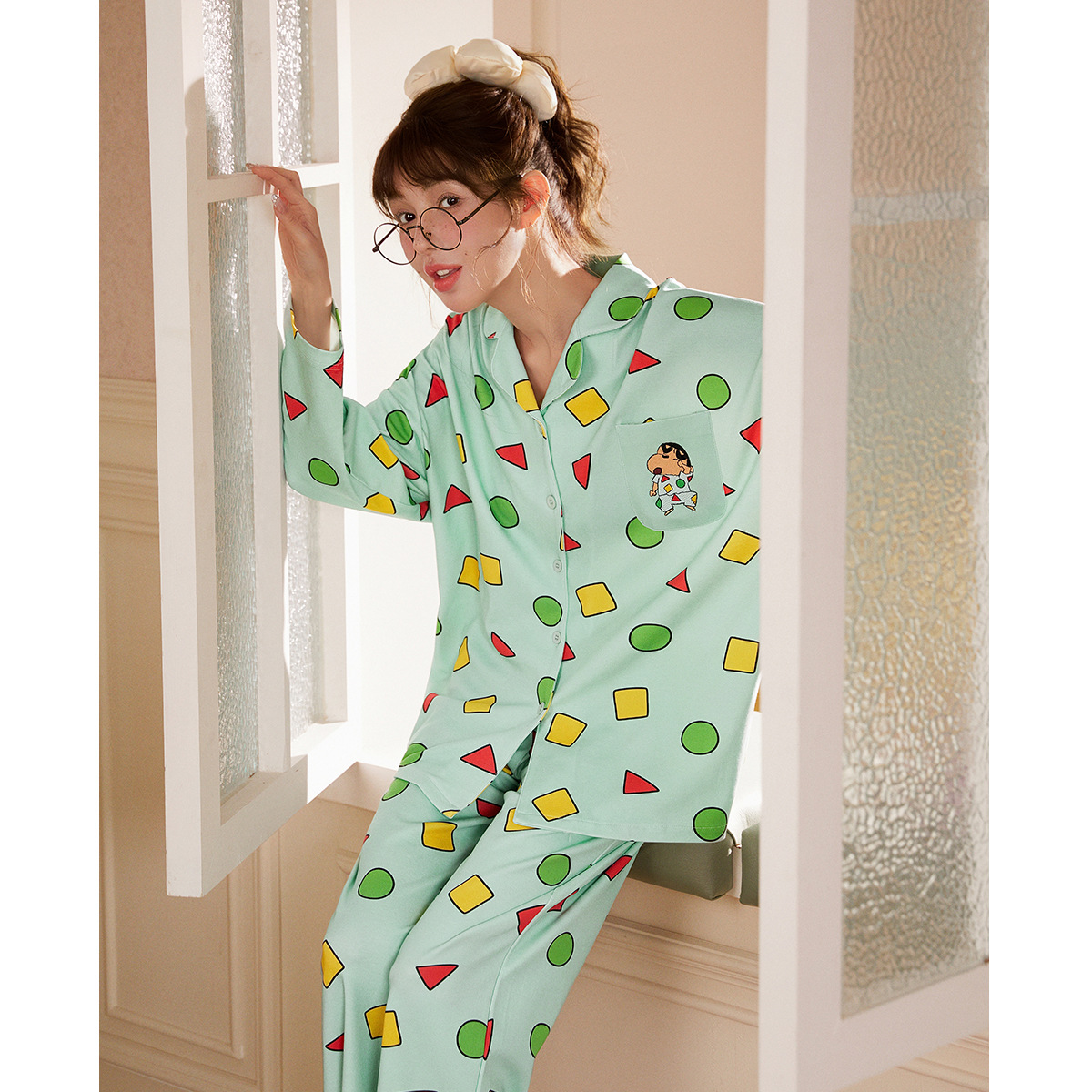 Runma [라이트 소프트] 크레용 신짱 긴팔 커플 잠옷 여성 봄, 가을 만화 순수 코튼 홈웨어 세트