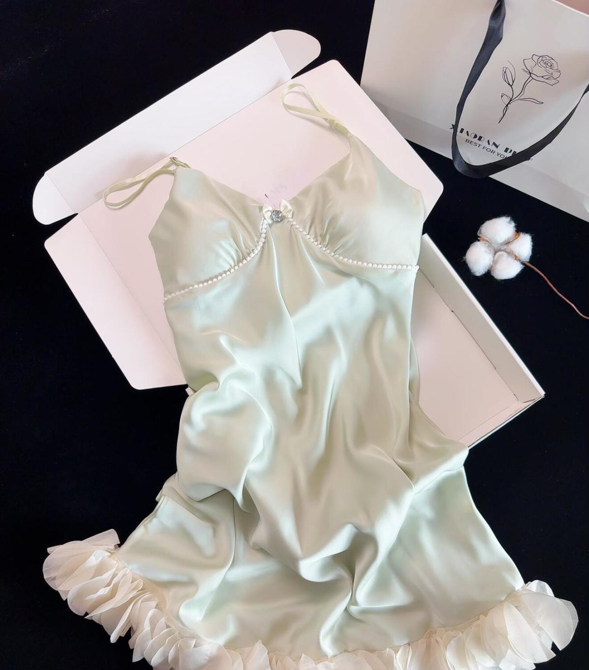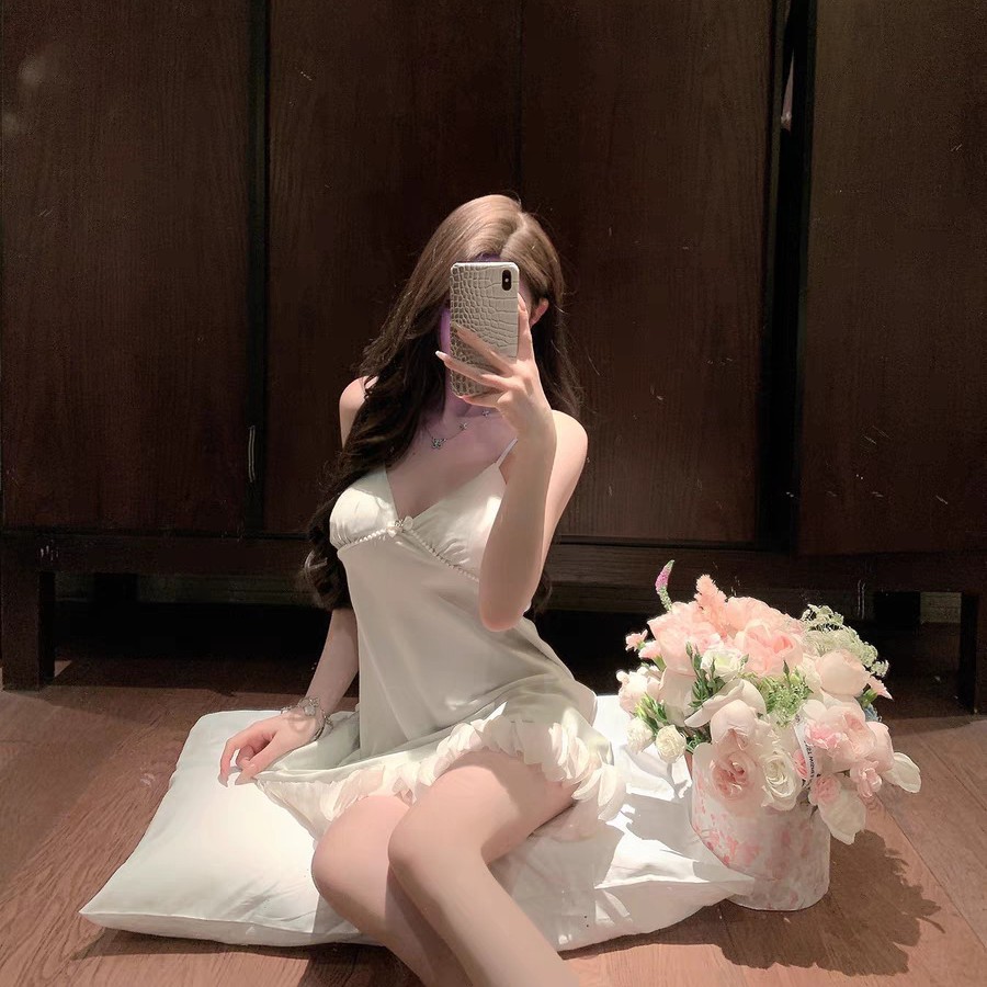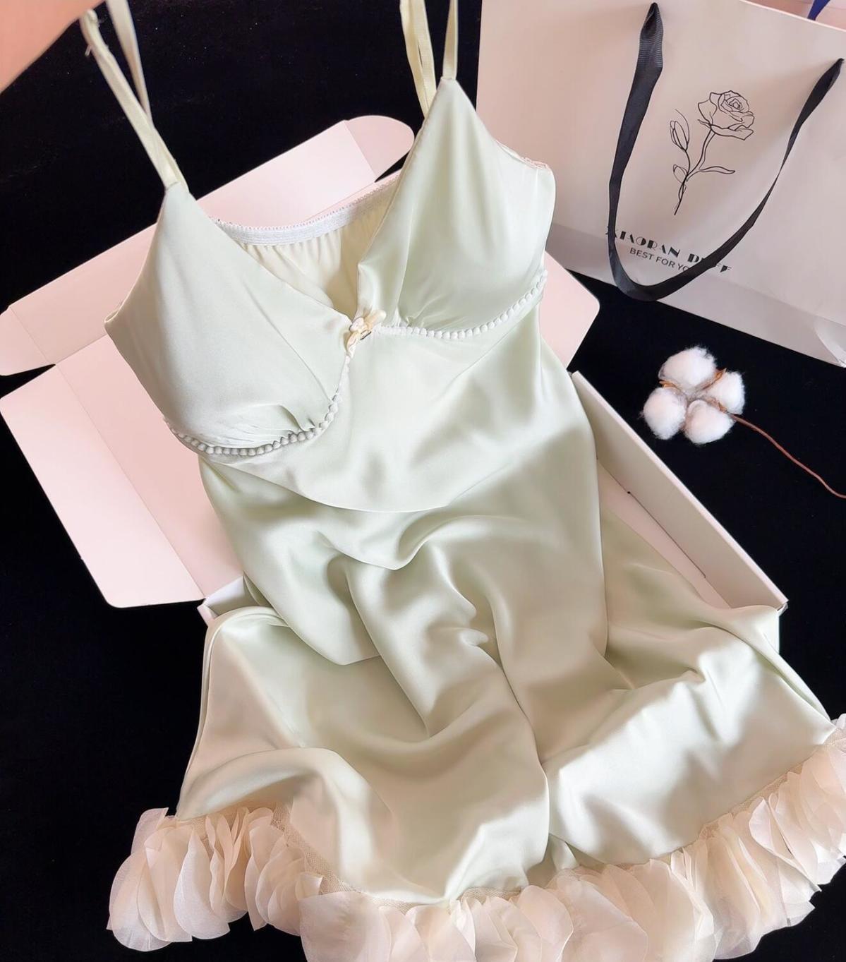 여성을위한 유방 패드가있는 프랑스 달콤한 꽃잎 얼음 실크 잠옷 2025 여름 새로운 대형 홈웨어 드레스 겉옷