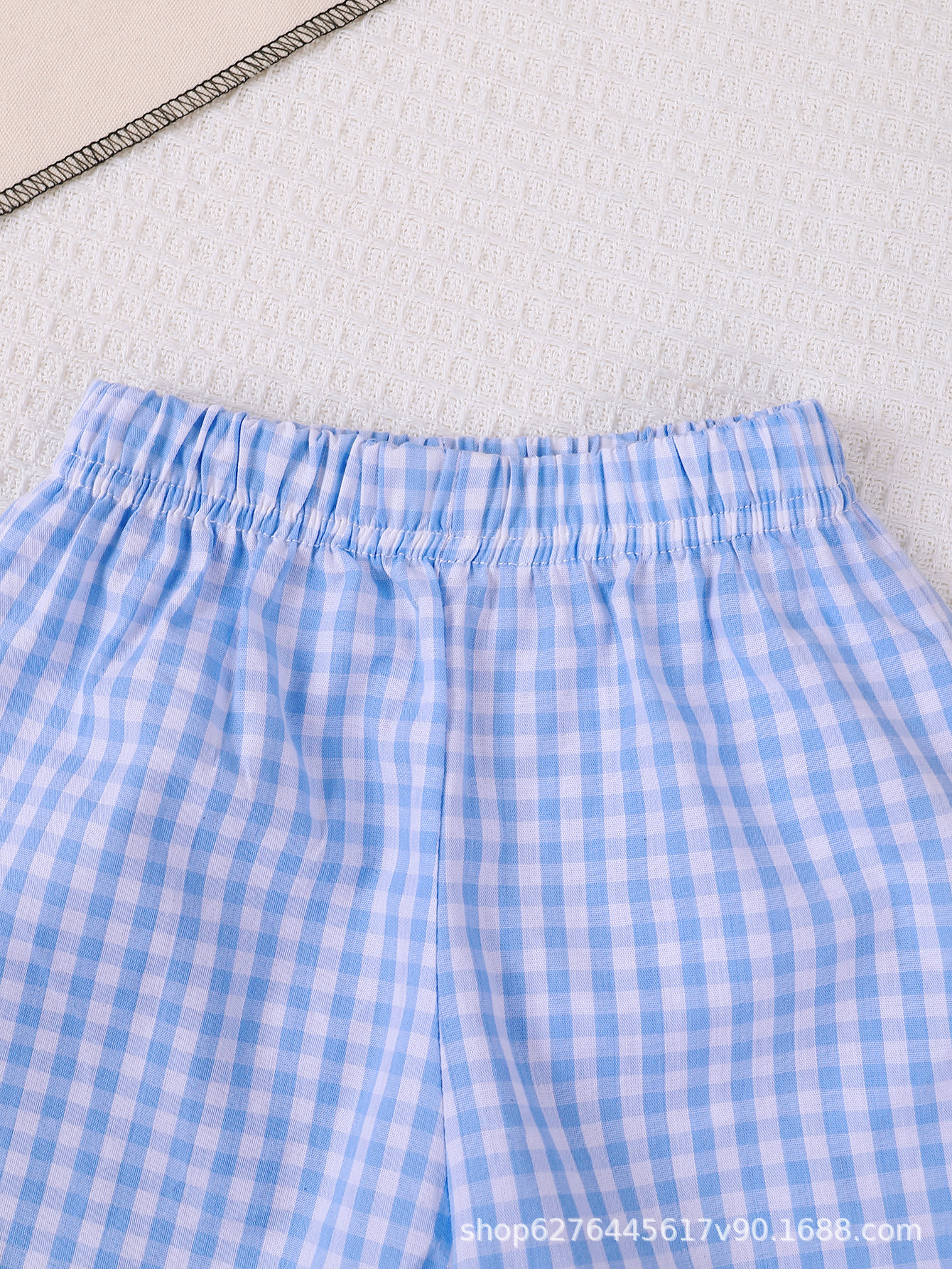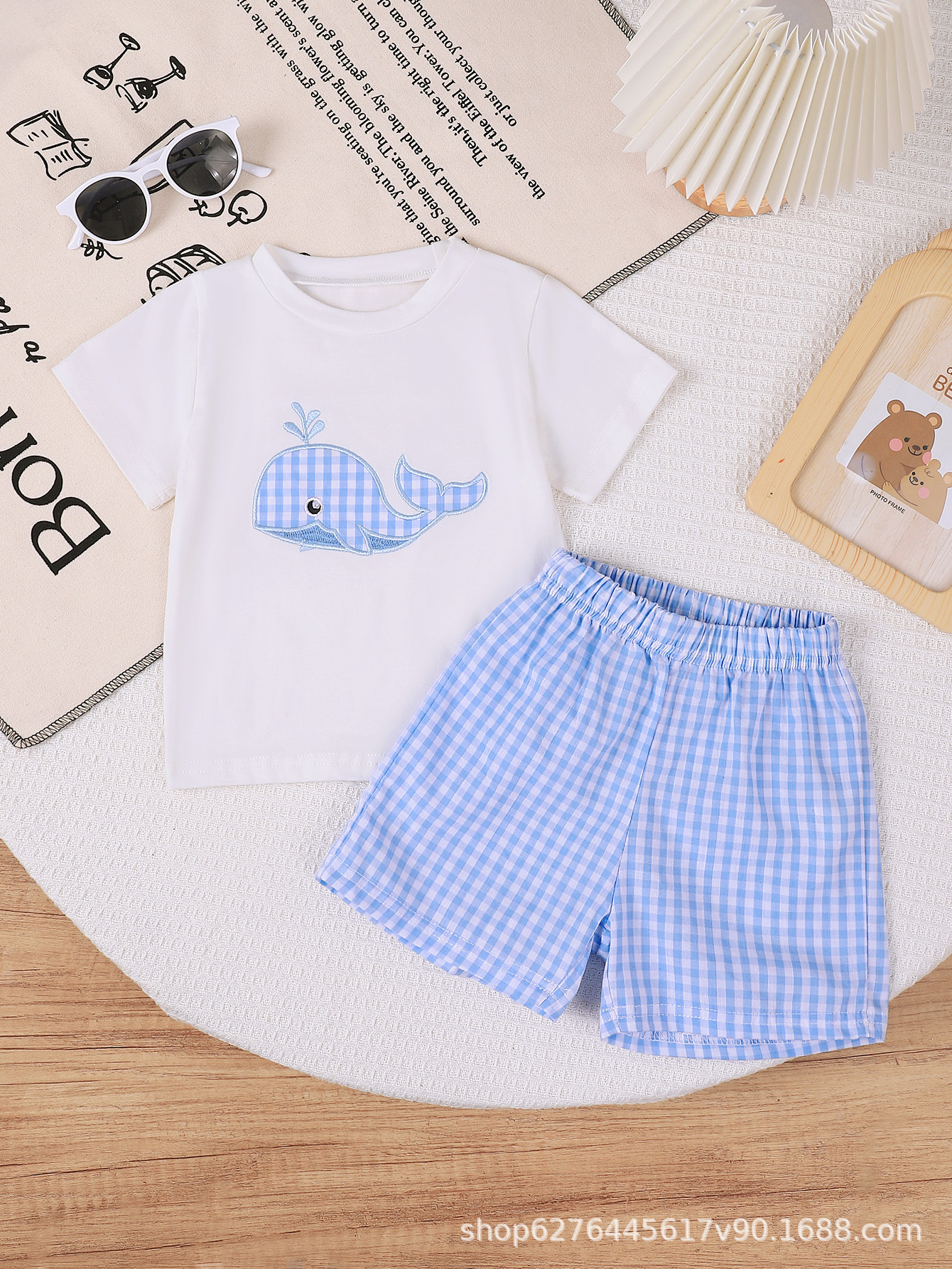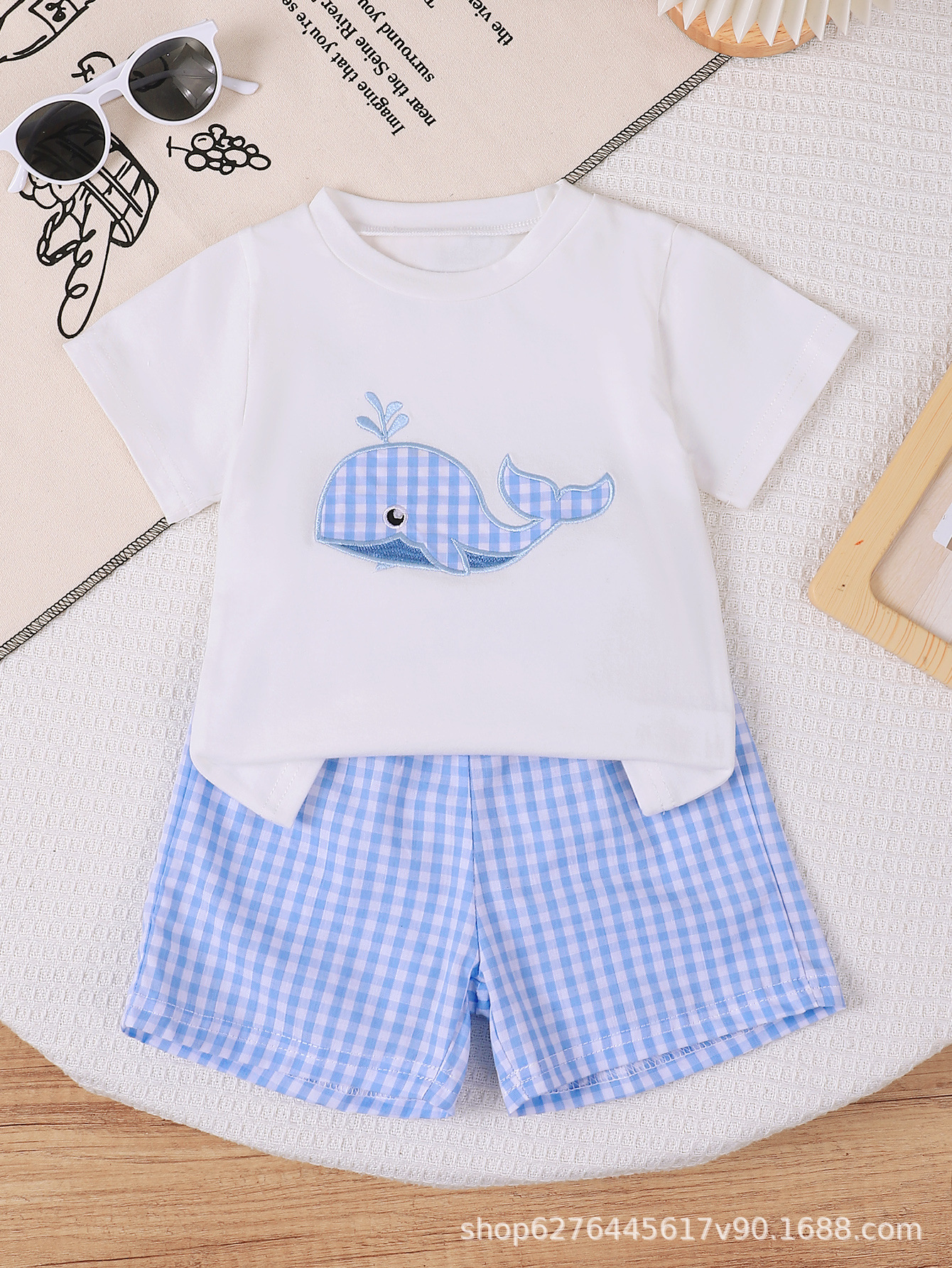 2025 여름 얇은 아기 자수 패턴 티셔츠+격자무늬 반바지 아기 투피스 세트 아동복 어린이 의류스토어 가기