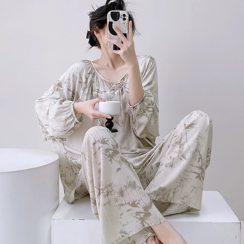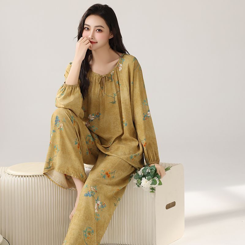 여성용 면 실크 잠옷 세트, 홈웨어, 봄 여름 잠옷, 여름 프렌치 레트로 라운드 넥, 외부 착용 가능스토어 가기