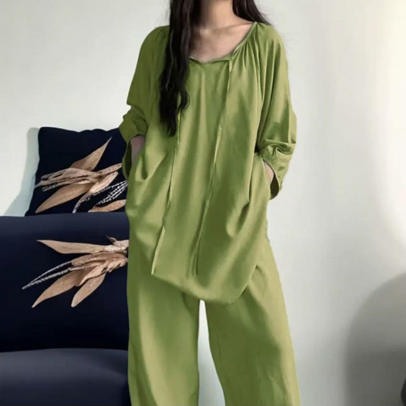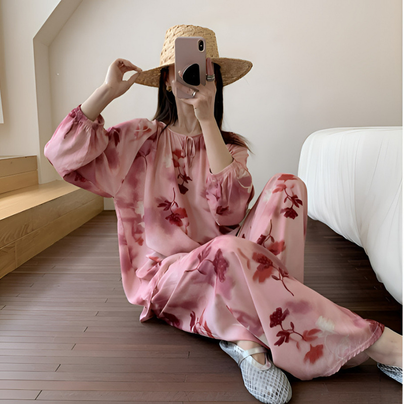 여성용 면 실크 잠옷 세트, 홈웨어, 봄 여름 잠옷, 여름 프렌치 레트로 라운드 넥, 외부 착용 가능