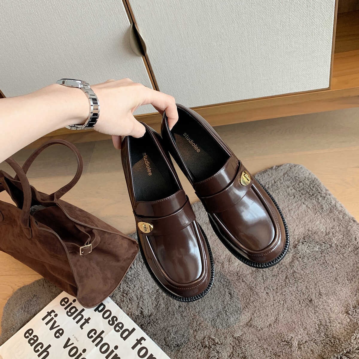 가벼운 고급 소가죽 포도 엄마 같은 스타일의 작은 가죽 신발 가을 다용도 라운드 발가락 슬립 온 골드 버클 두꺼운 굽 로퍼 여성용 새 스타일스토어 가기
