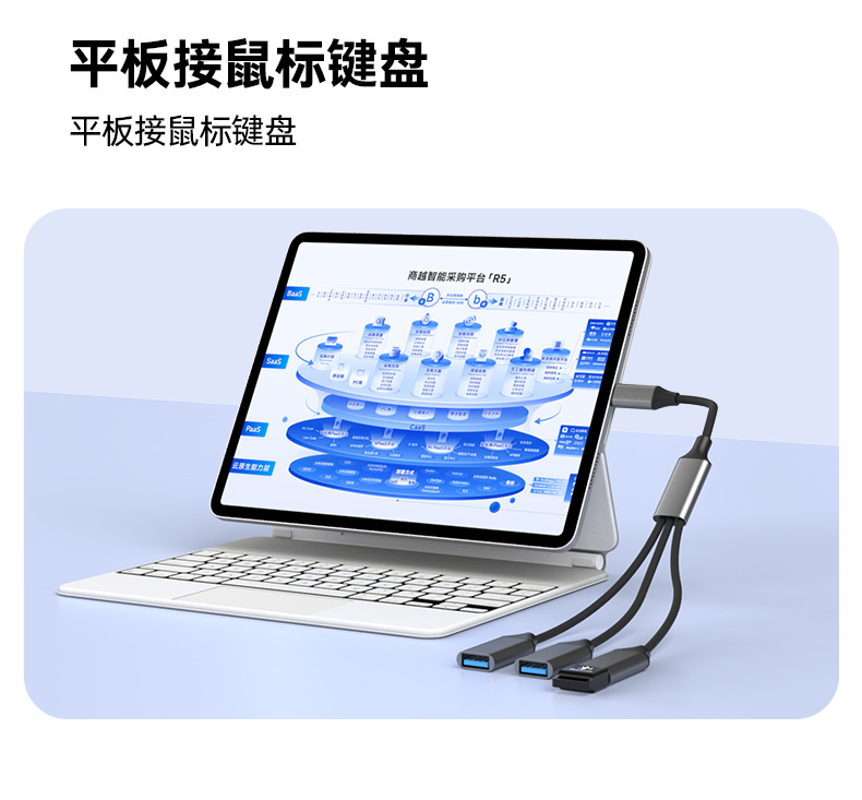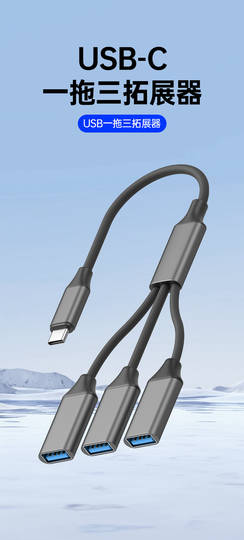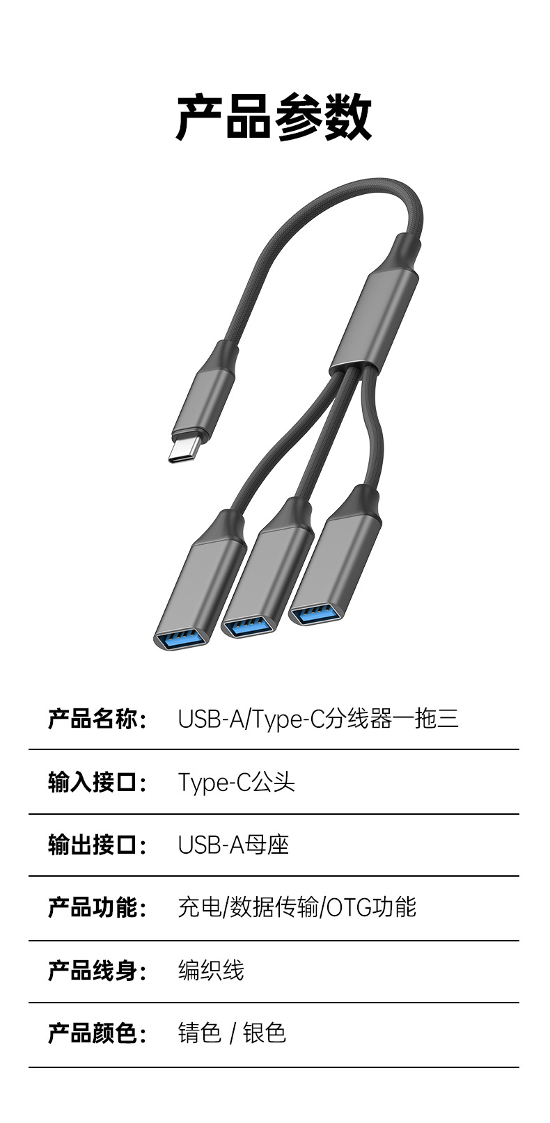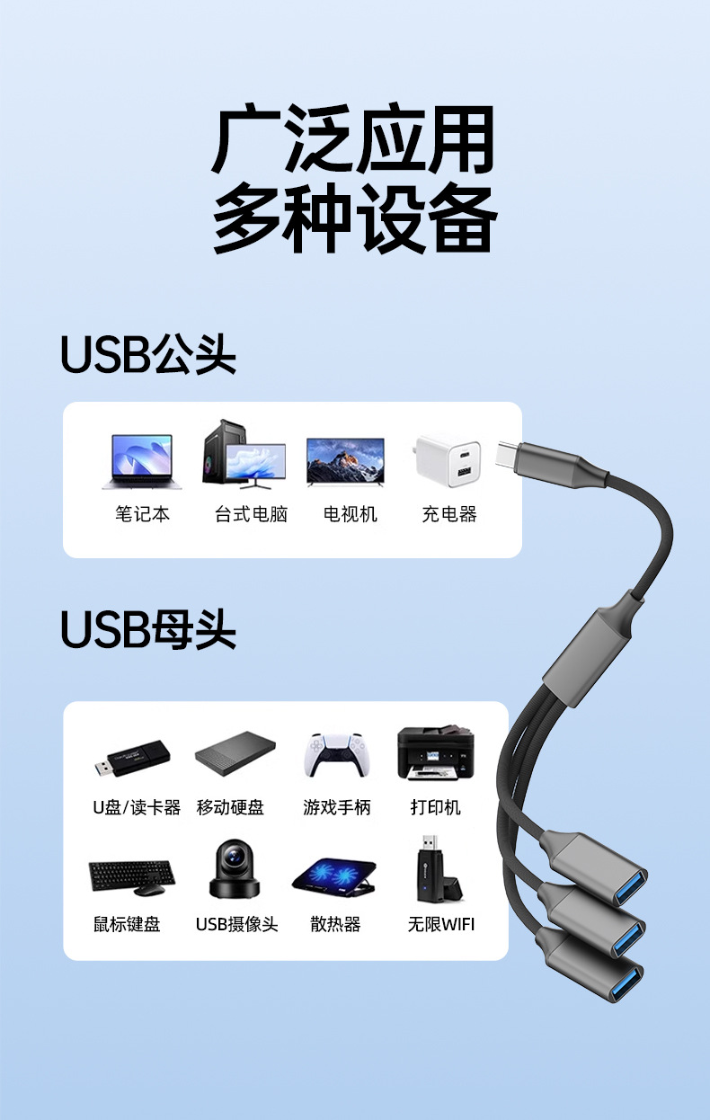 • Type-C to 3 USB - 회색 꼬임 케이블