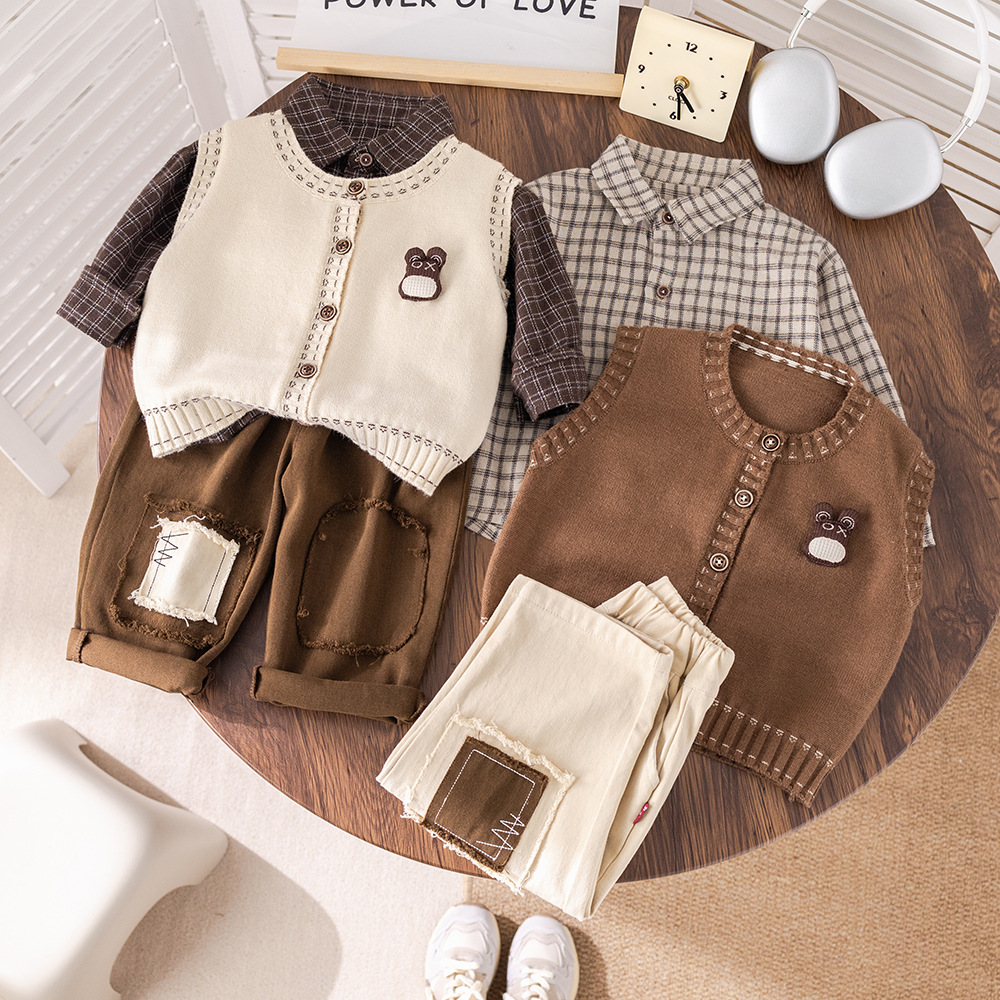 소년 긴 소매 셔츠 스웨터 3 피스 세트 숲 격자 무늬 셔츠 만화 스웨터 카디건 정장 캐주얼 바지 도매스토어 가기