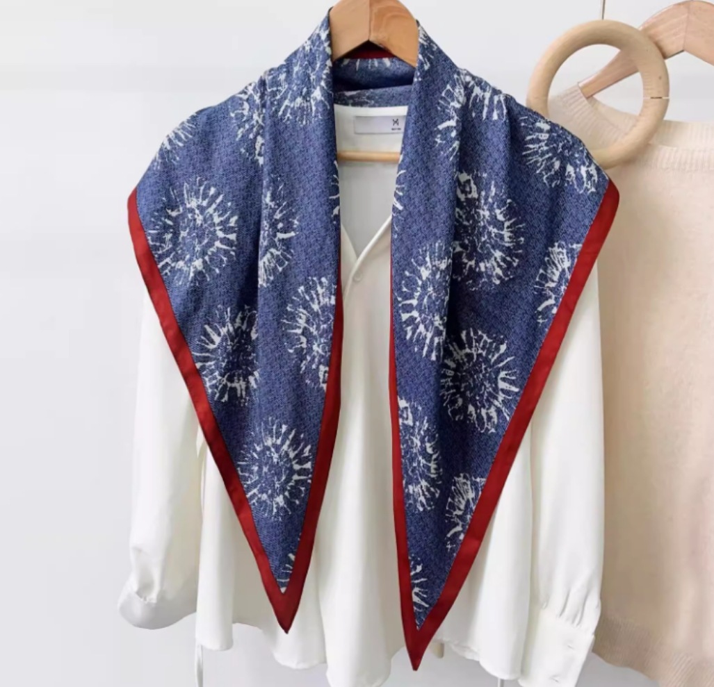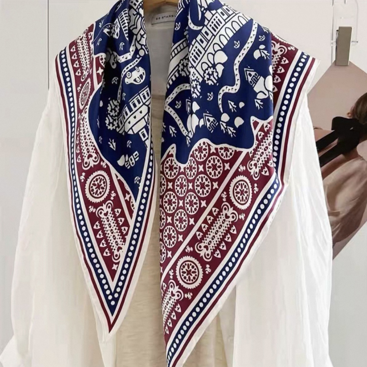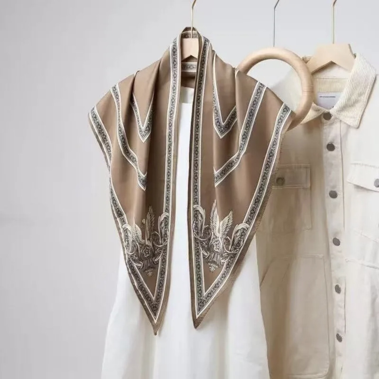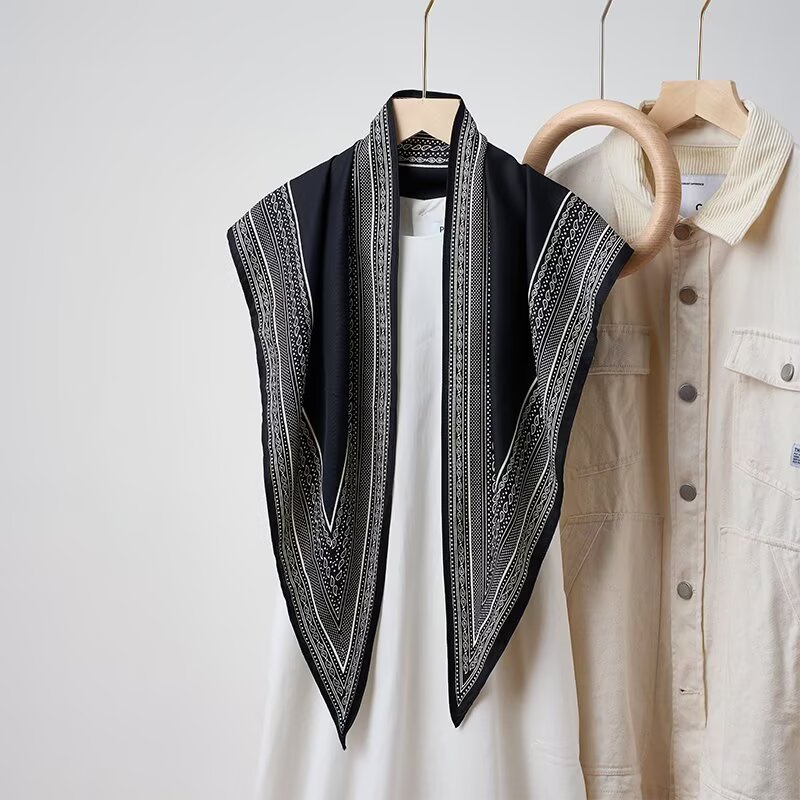 2025 새로운 여름 다목적 허리 태양 보호 Baotou 목도리 패턴 실크 시원한 느낌 135*85cm 세련된 대형 삼각형 스카프