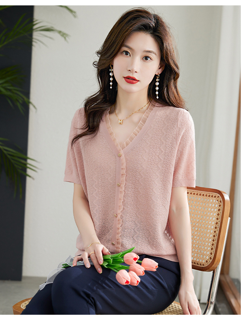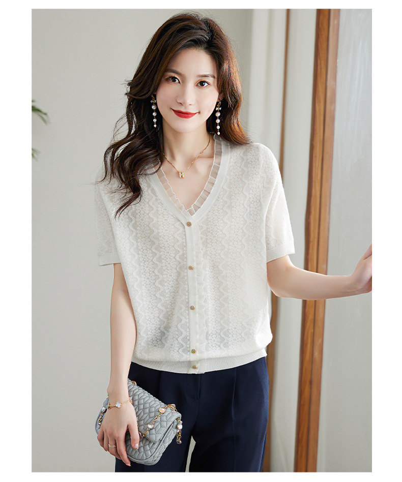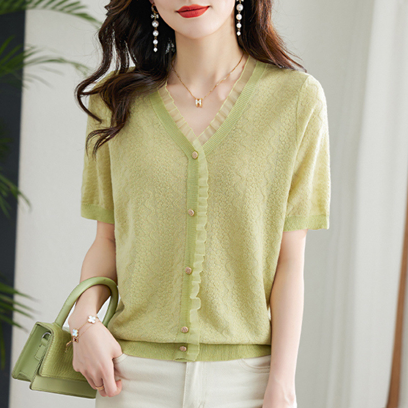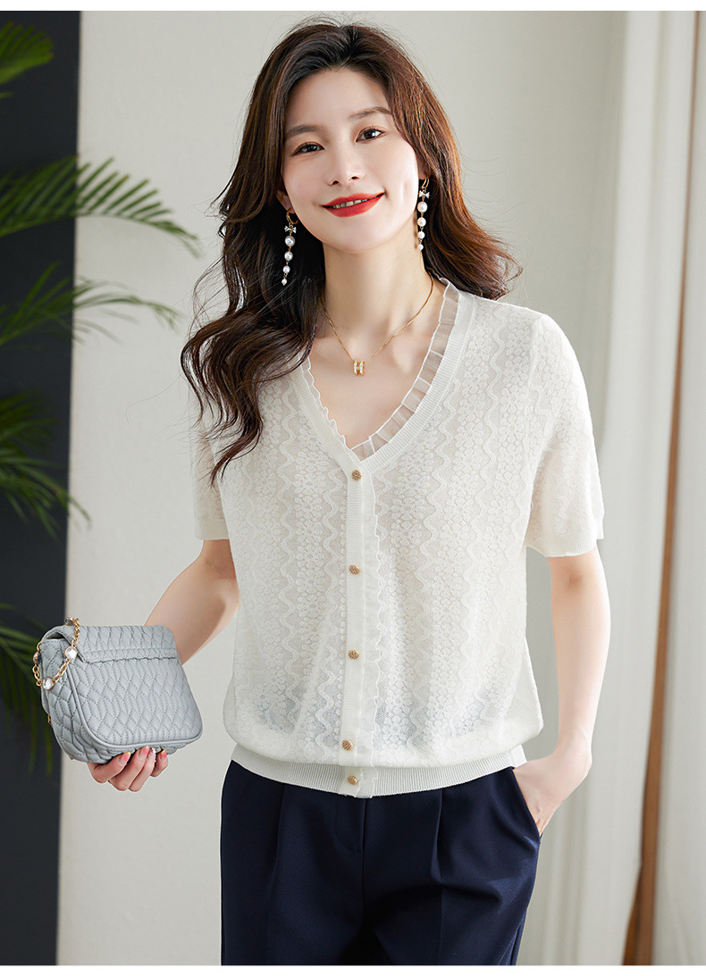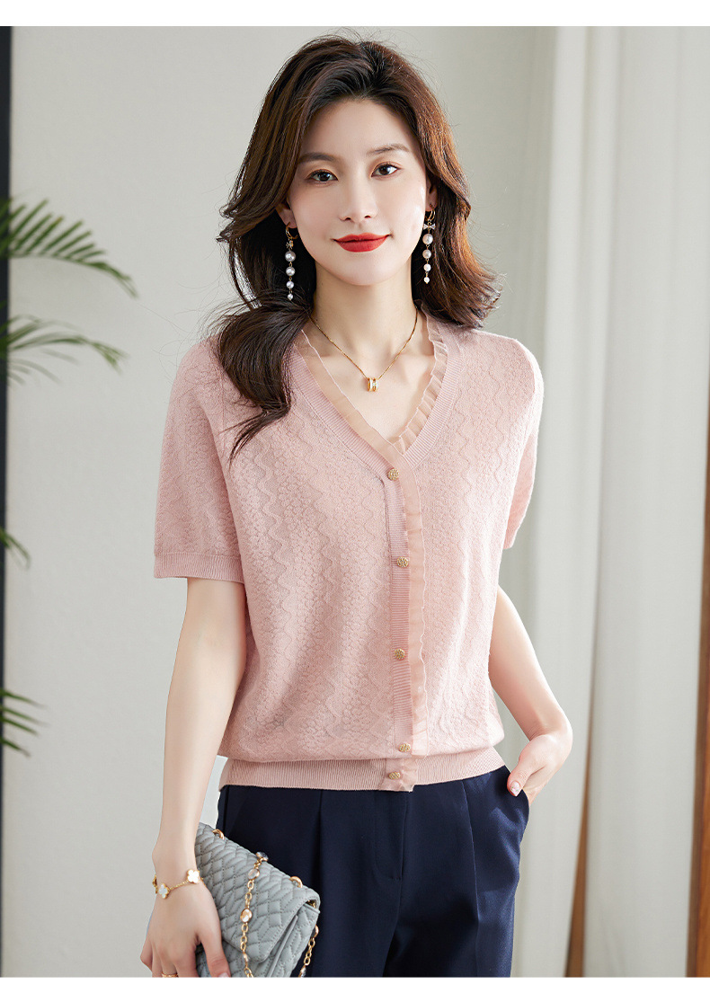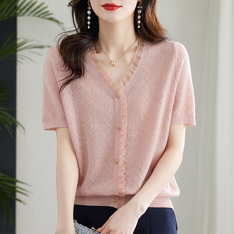 엄마 여름 아이스 실크 반팔 티셔츠 여성 여름 새로운 스타일 나이를 줄여주는 레이스 니트 셔츠 얇은 v 넥 탑