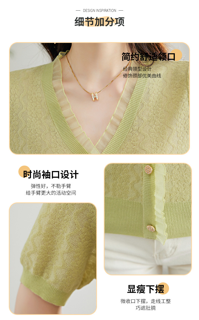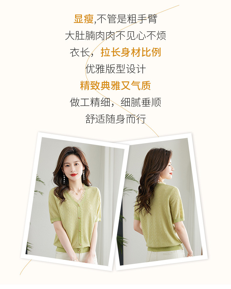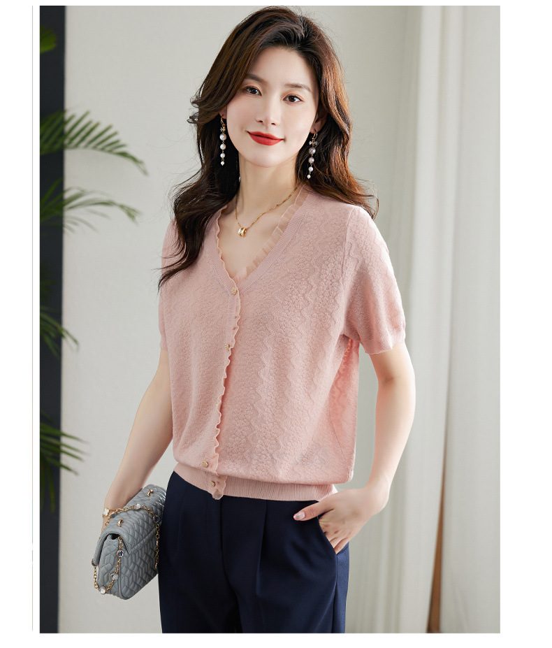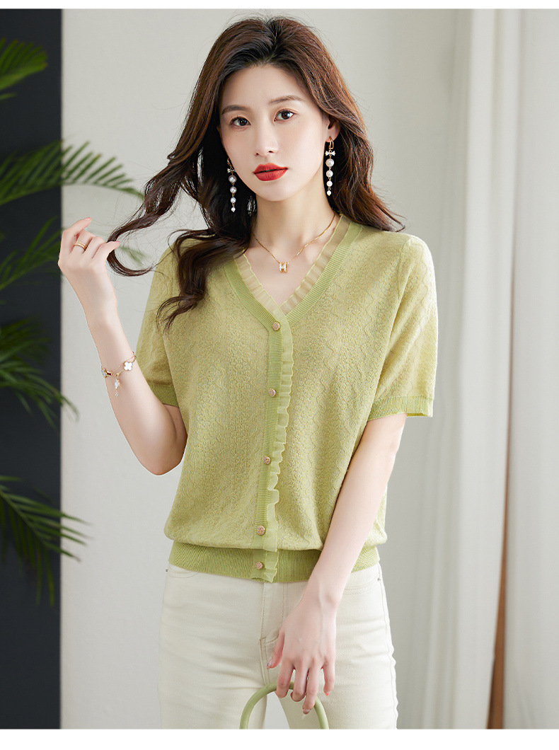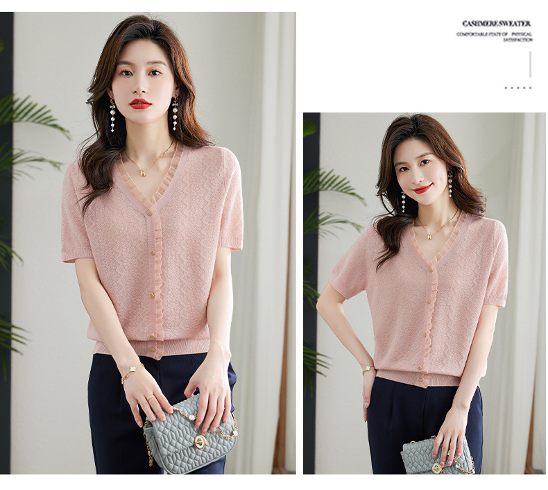 엄마 여름 아이스 실크 반팔 티셔츠 여성 여름 새로운 스타일 나이를 줄여주는 레이스 니트 셔츠 얇은 v 넥 탑