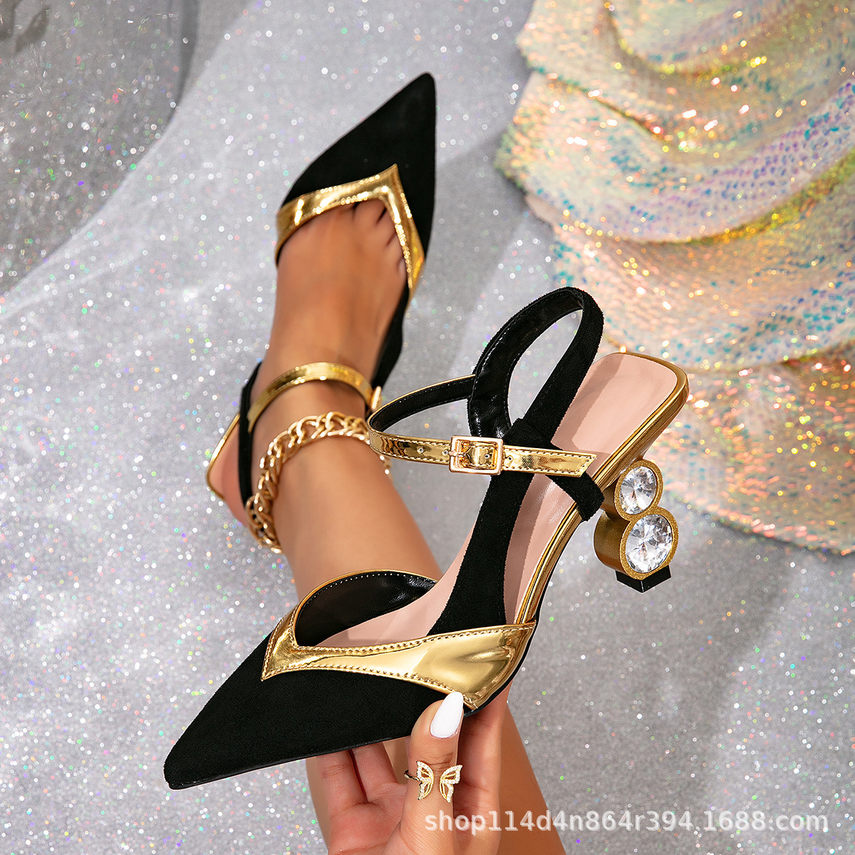 여성용 원라인 토캡 샌들 2024 여름 신작 패셔너블한 여성용 다용도 하이힐 라인스톤 포인티드 토 뒷굽 슈즈스토어 가기
