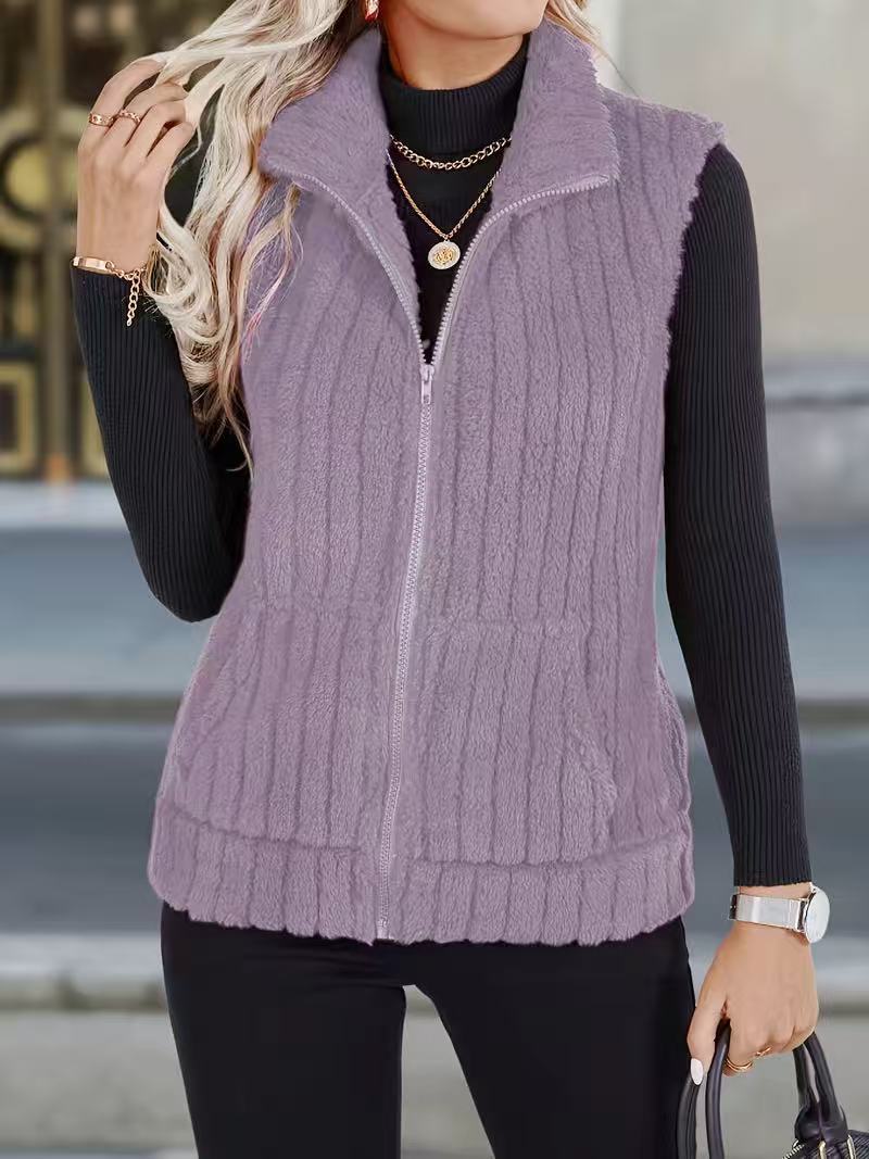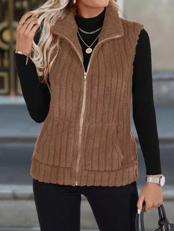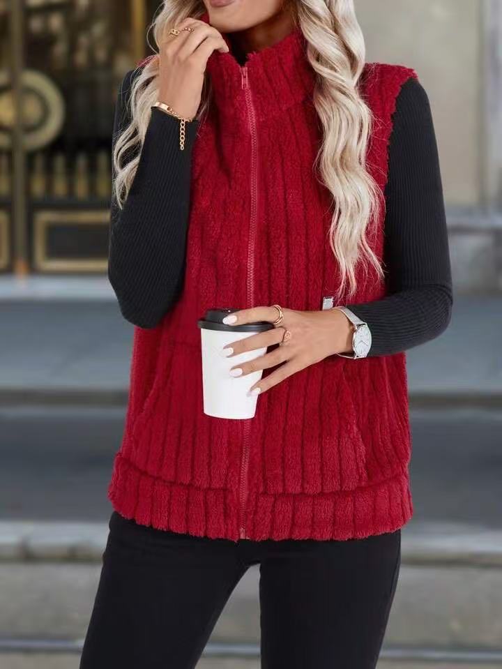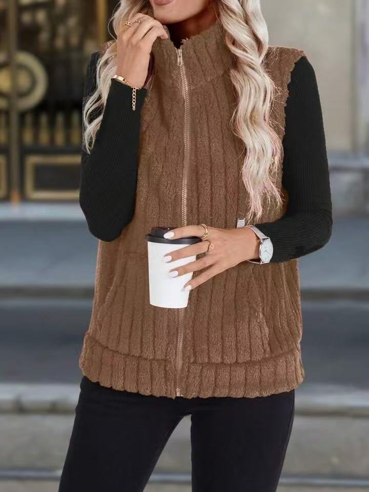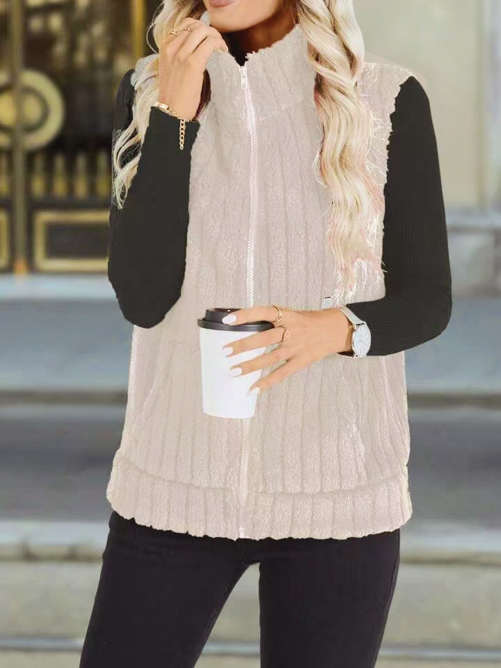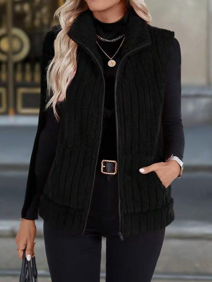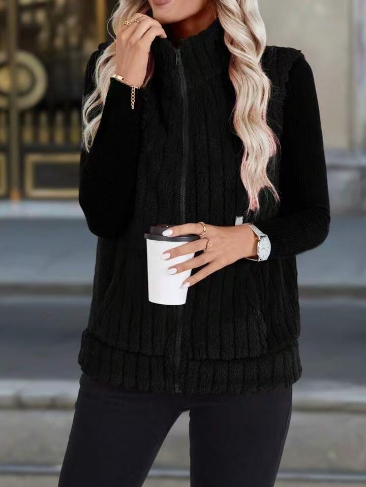 유럽과 미국의 국경 간 인기 단색 양면 플러시 지퍼 카디건 캐주얼 여성 가을, 겨울 조끼 독립 스테이션 AliExpress
