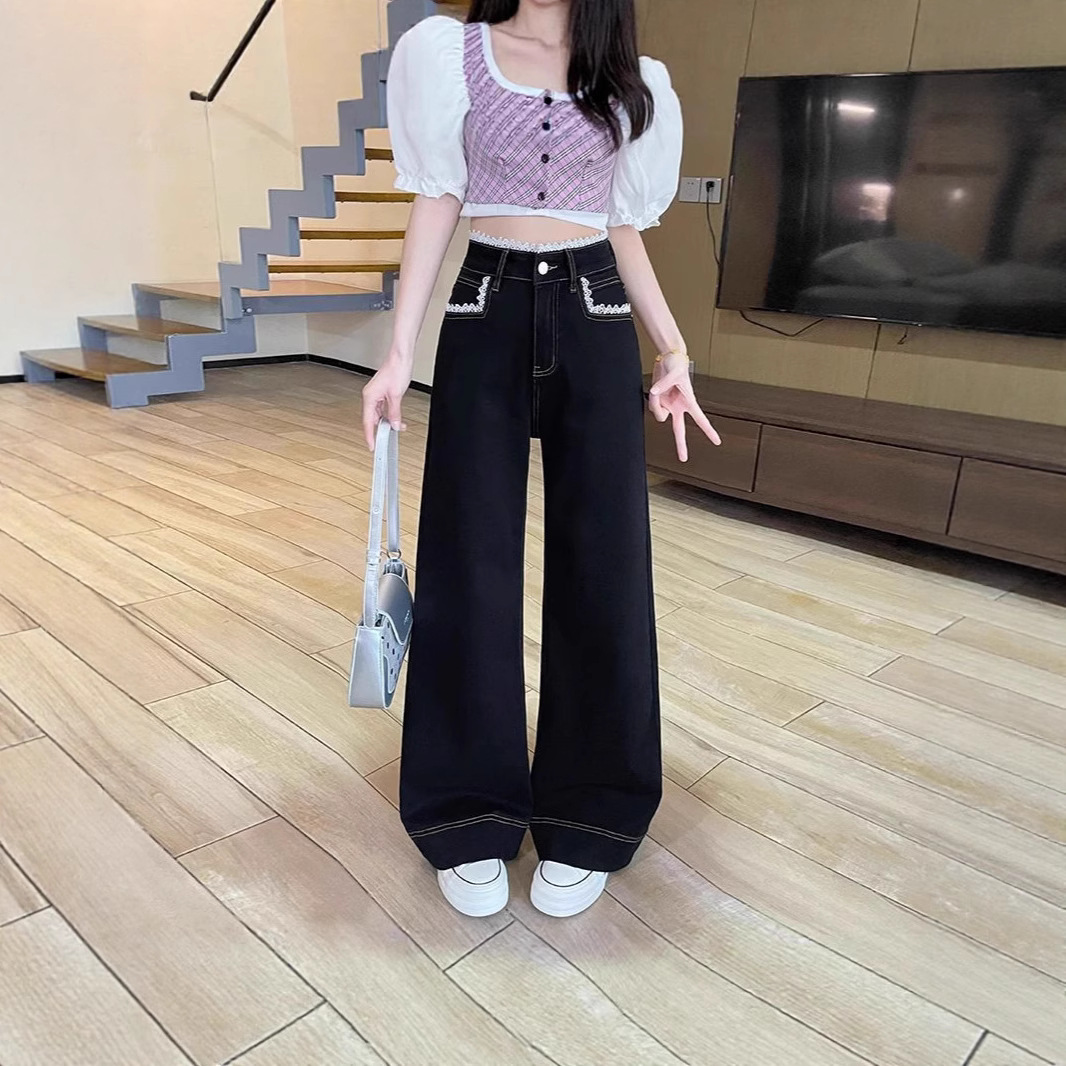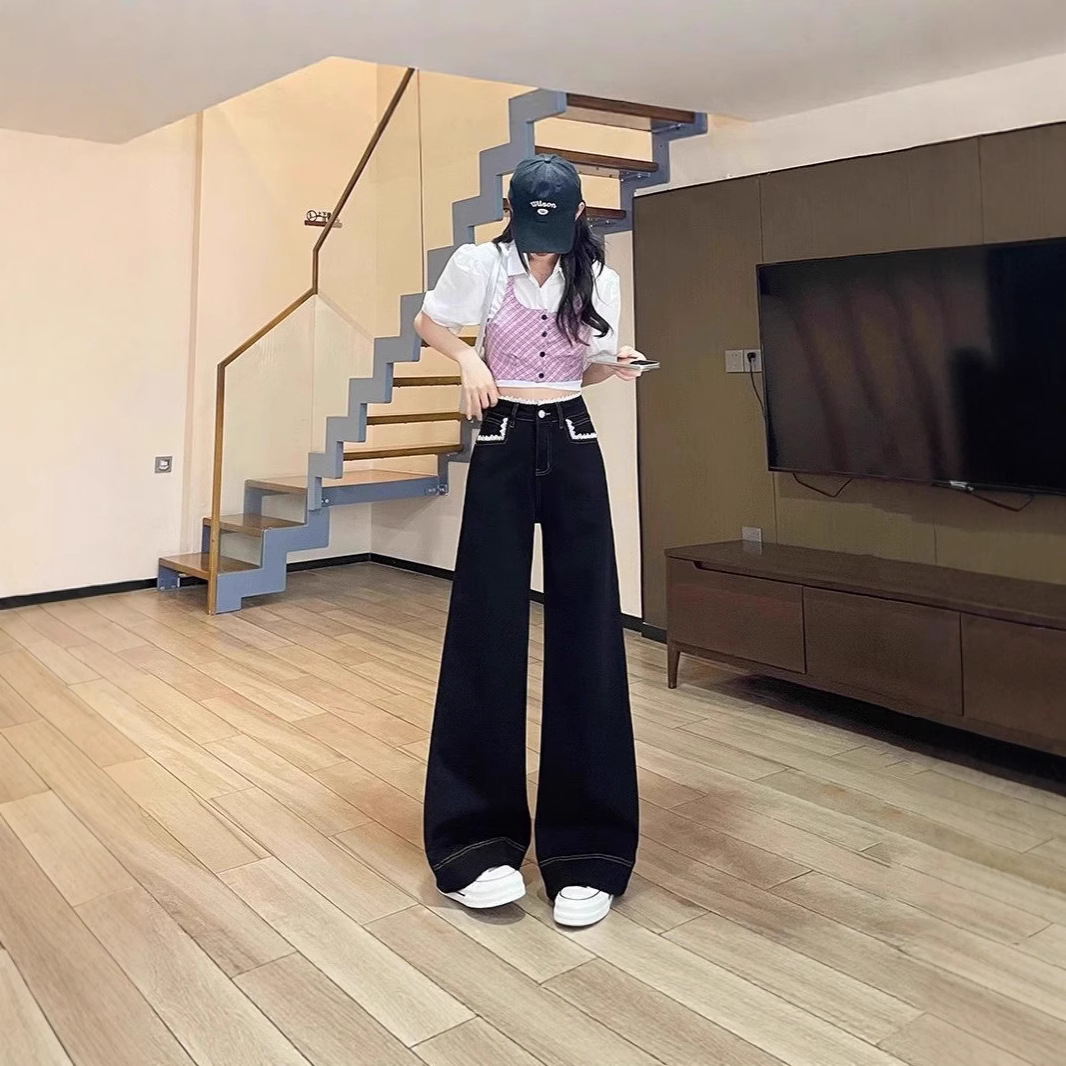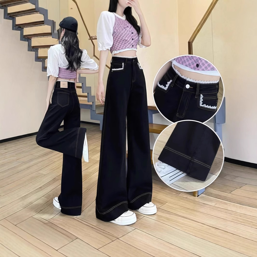 여성용 블랙 와이드 레그 청바지 2025 봄 여름 새로운 스타일 하이 웨이스트 슬림 루즈 레이스 레그 피팅 플레어 팬츠