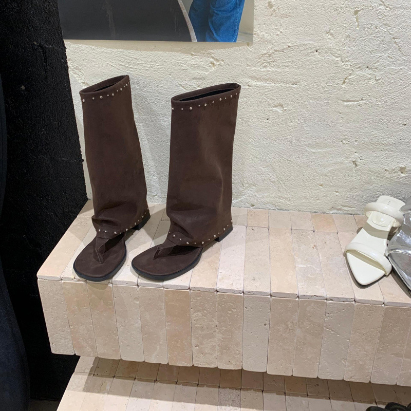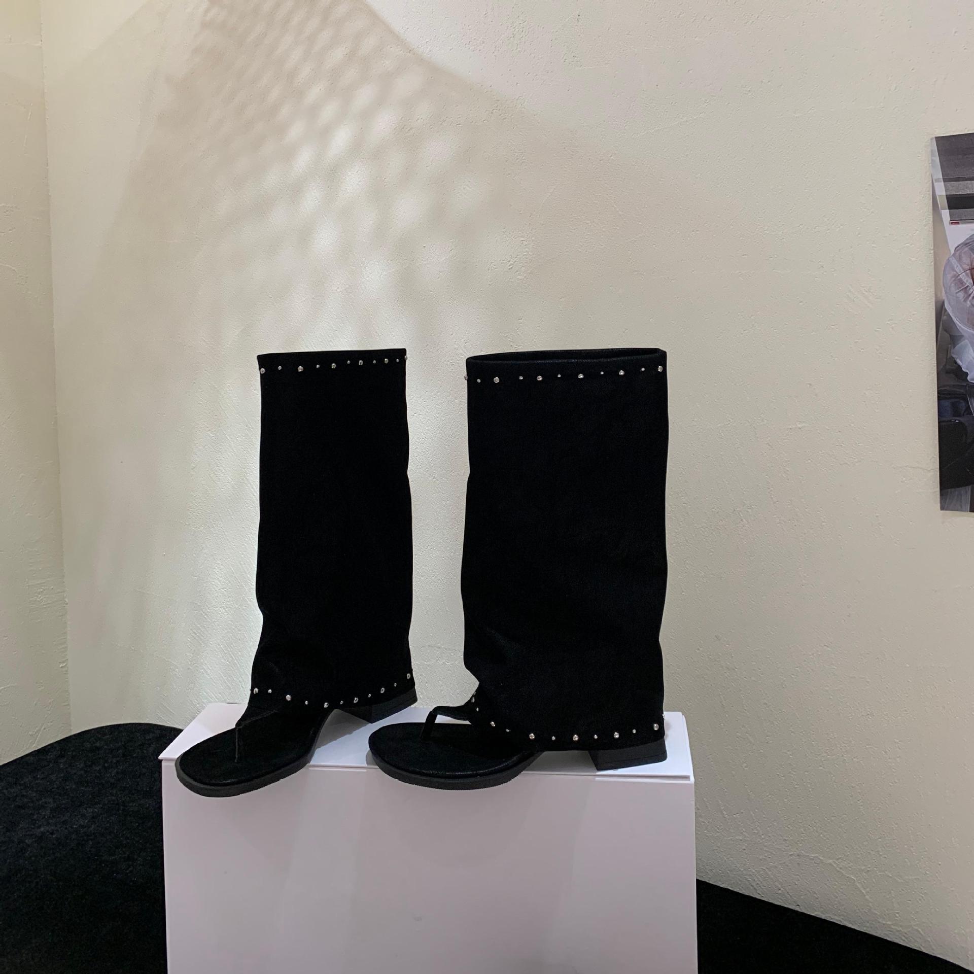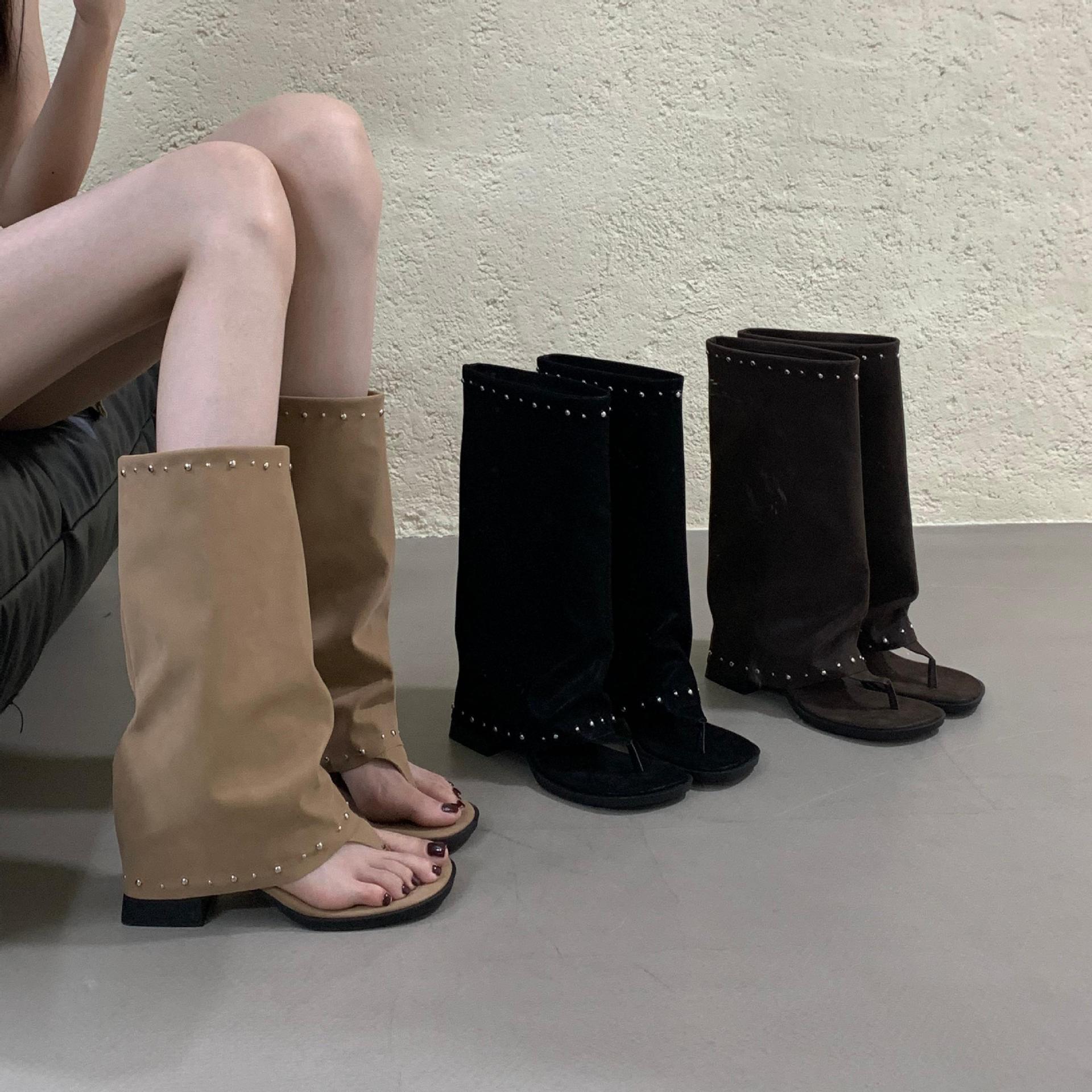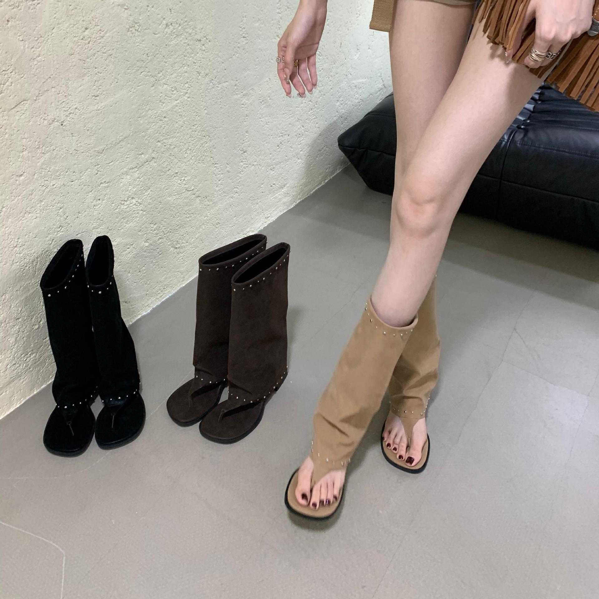 가벼운 럭셔리 틈새 복고풍 2025 여름 신작 여성 신발 샌들 겉옷 둥근 발가락 두꺼운 굽 플립 플롭 리벳 바지 샌들