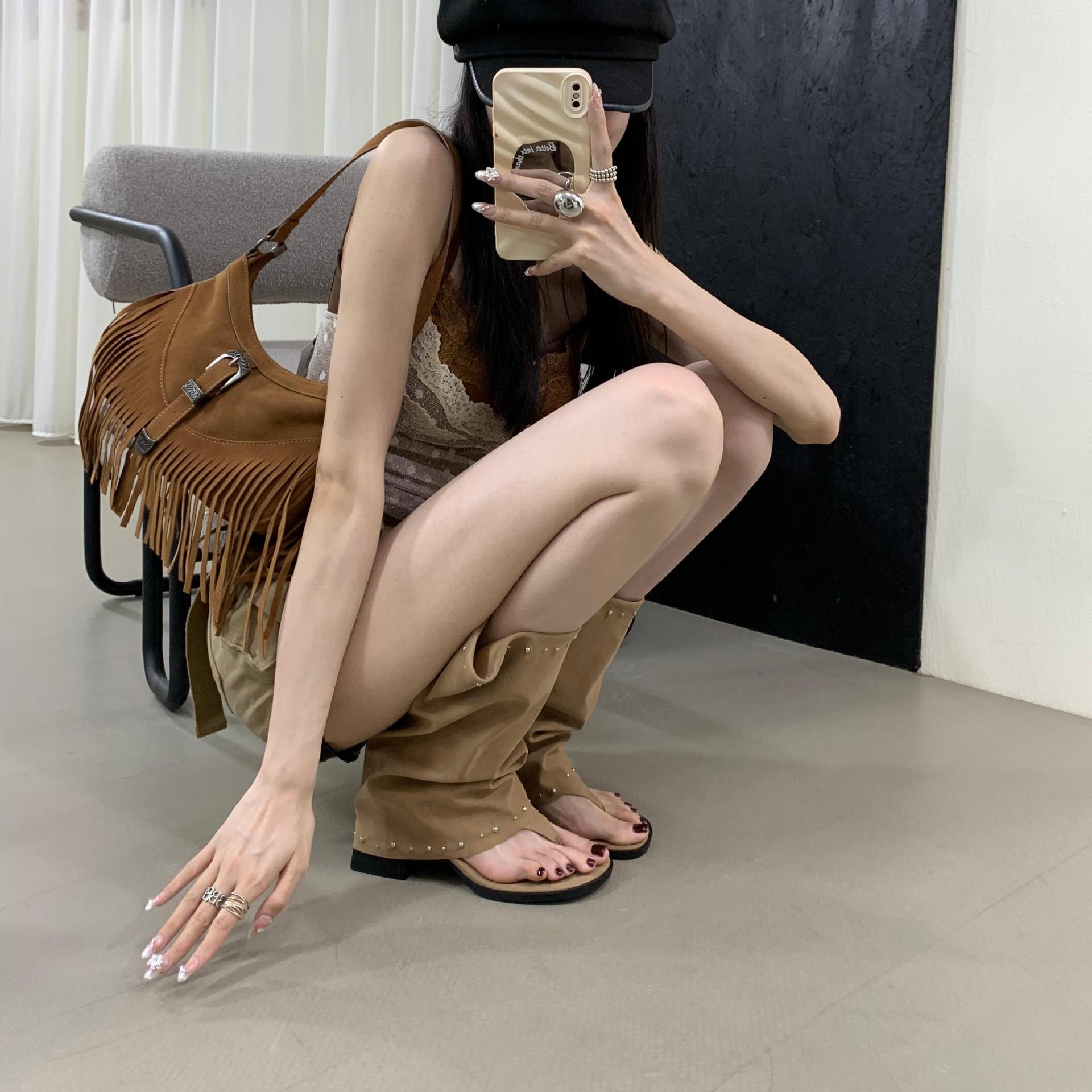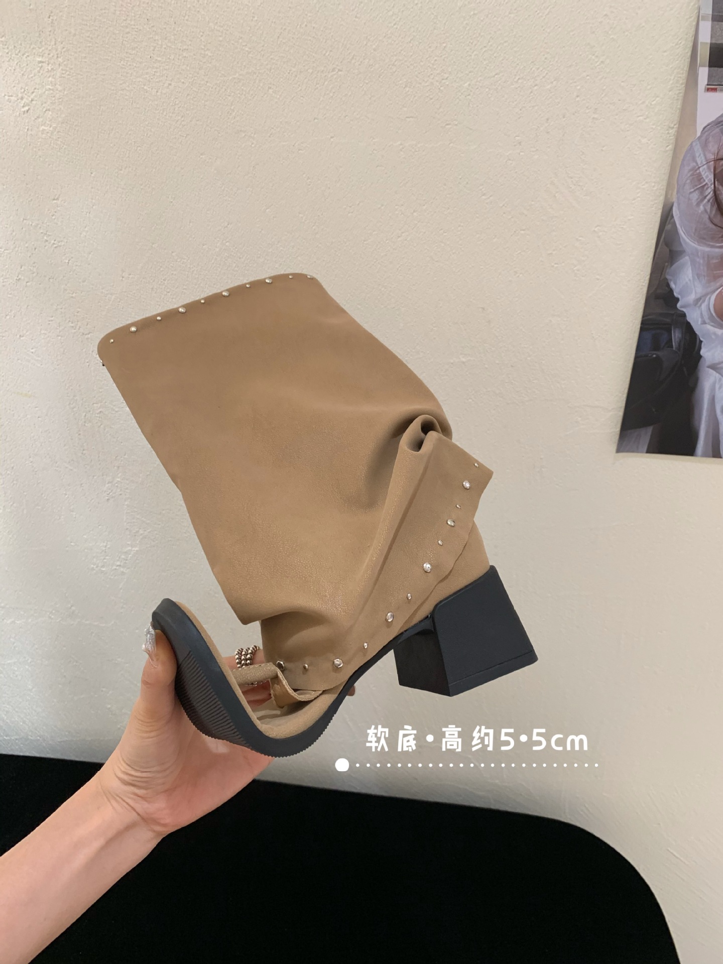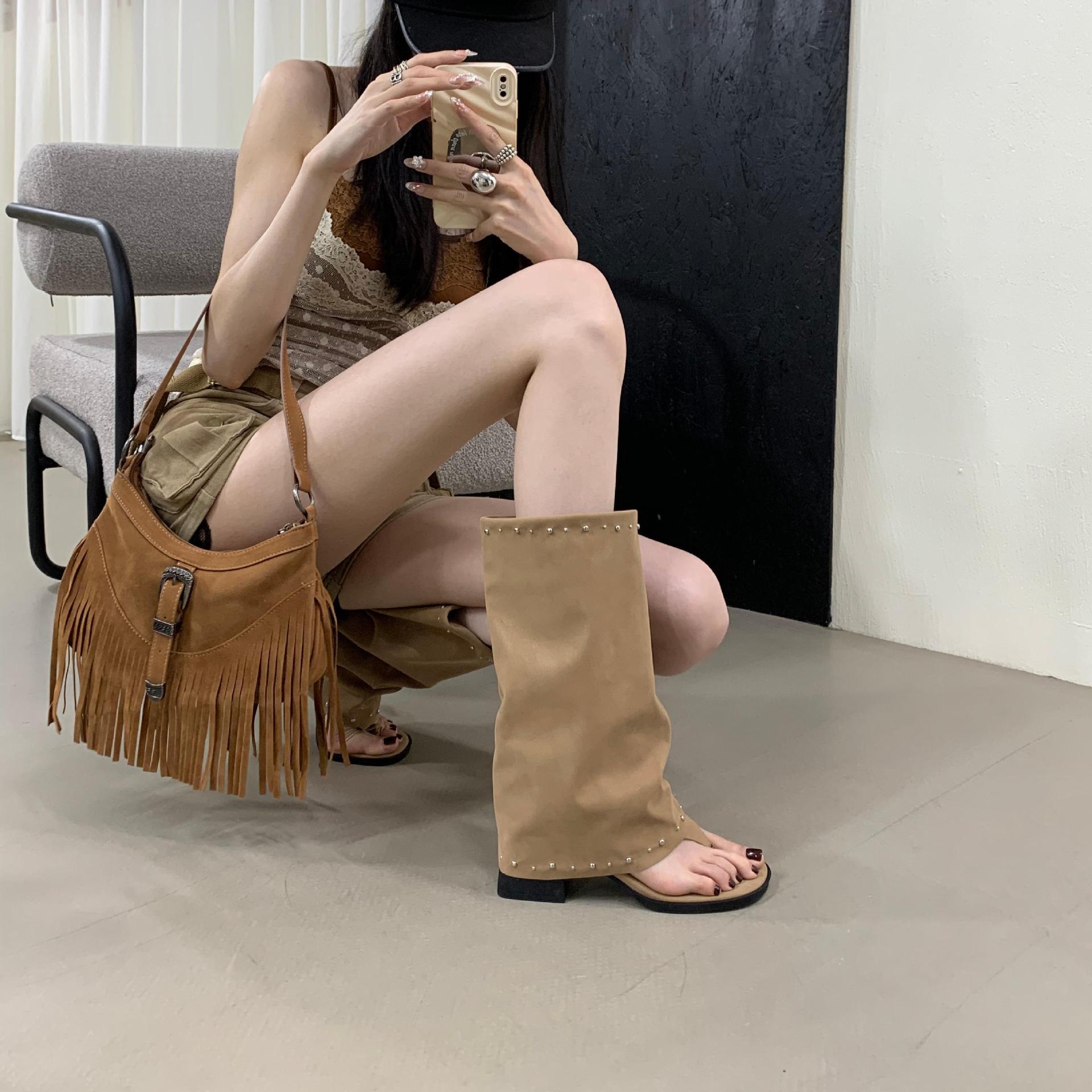 가벼운 럭셔리 틈새 복고풍 2025 여름 신작 여성 신발 샌들 겉옷 둥근 발가락 두꺼운 굽 플립 플롭 리벳 바지 샌들
