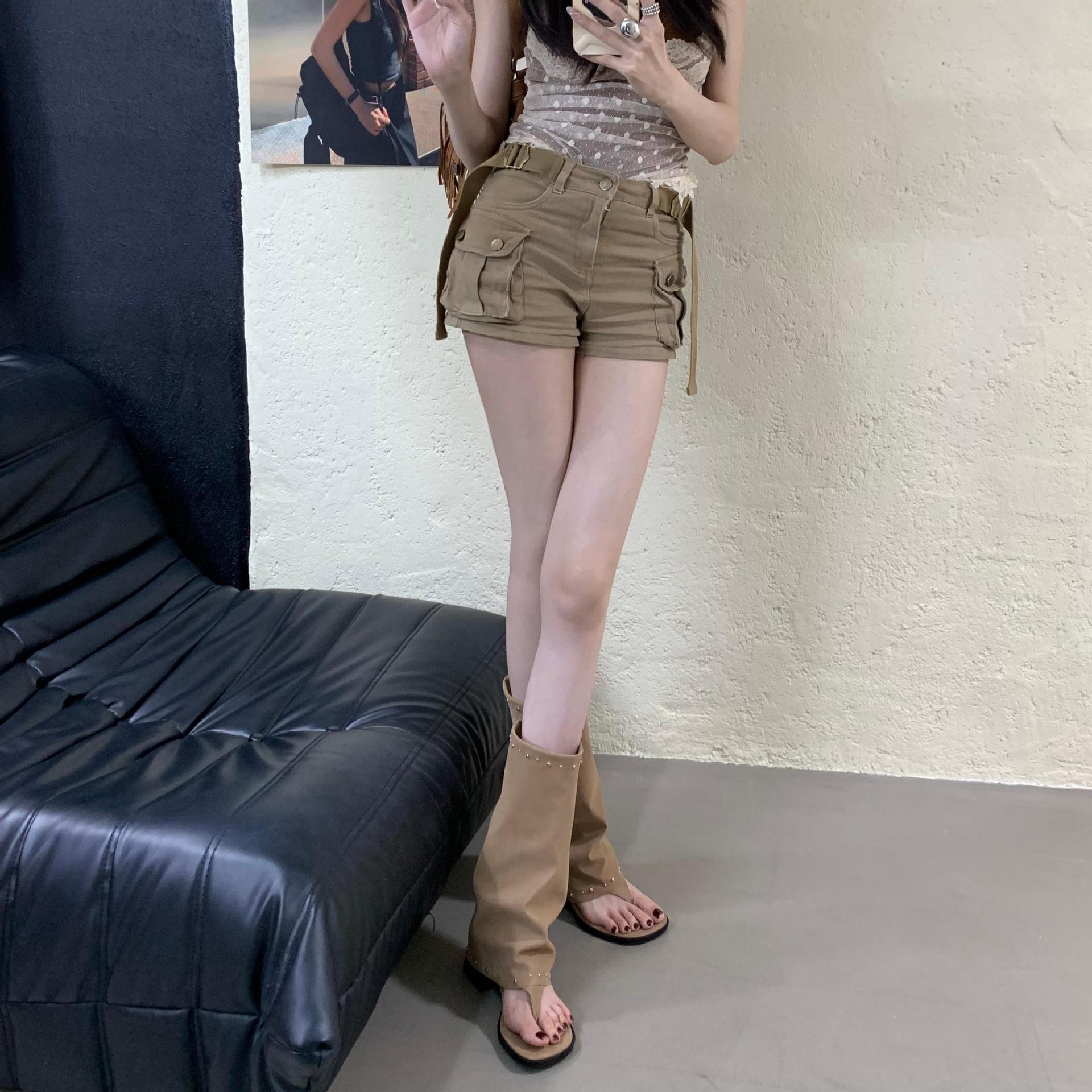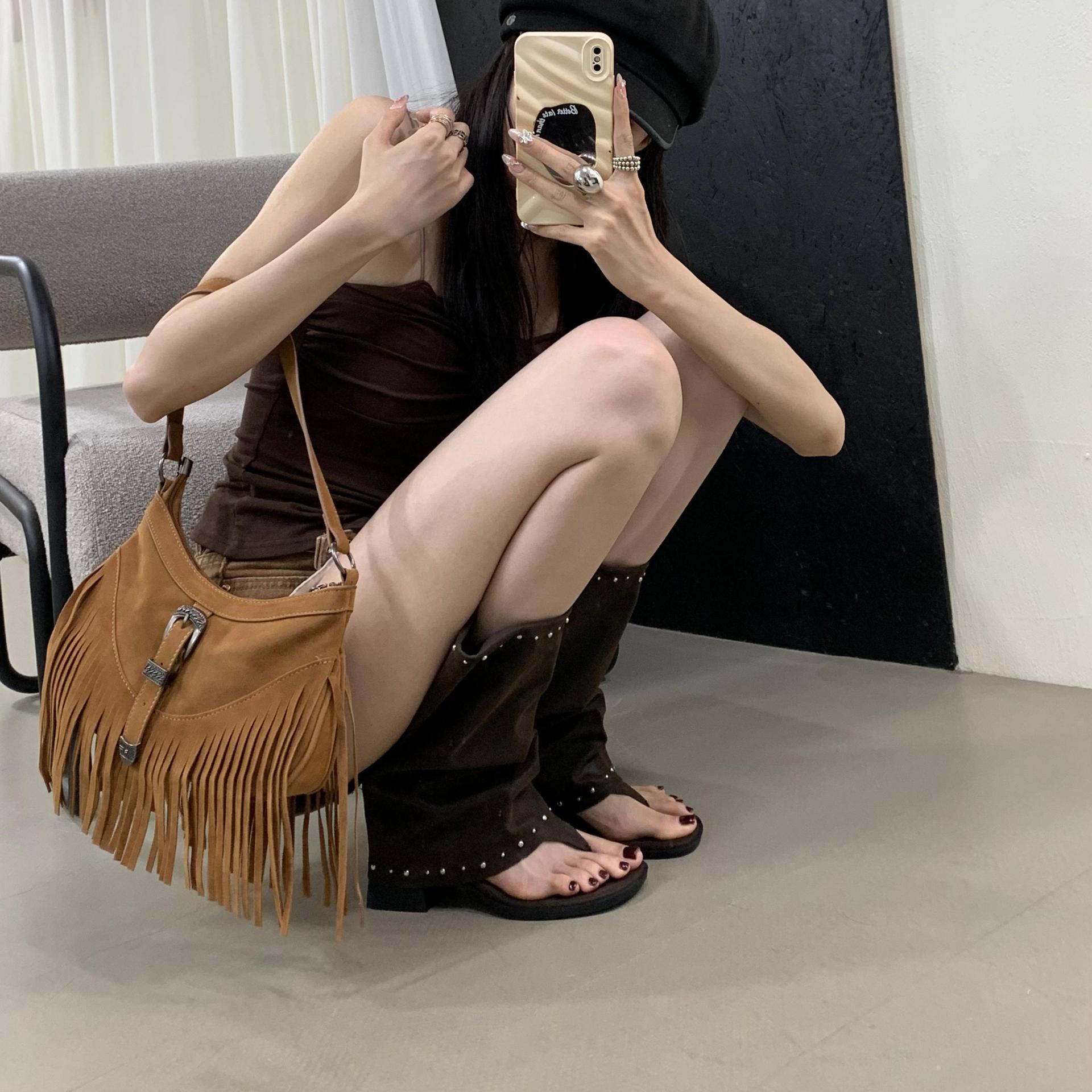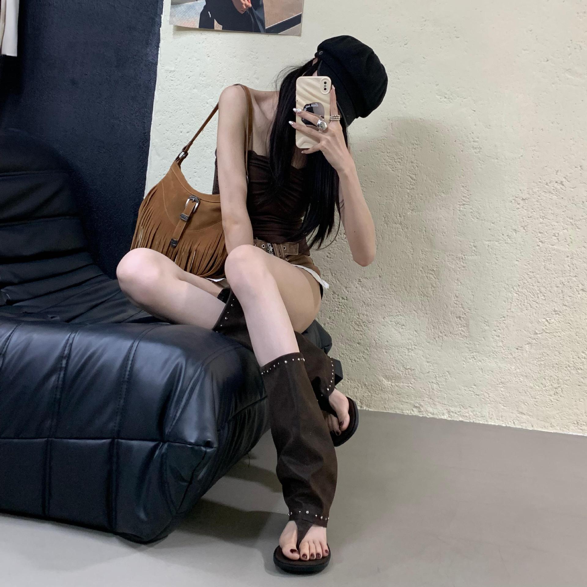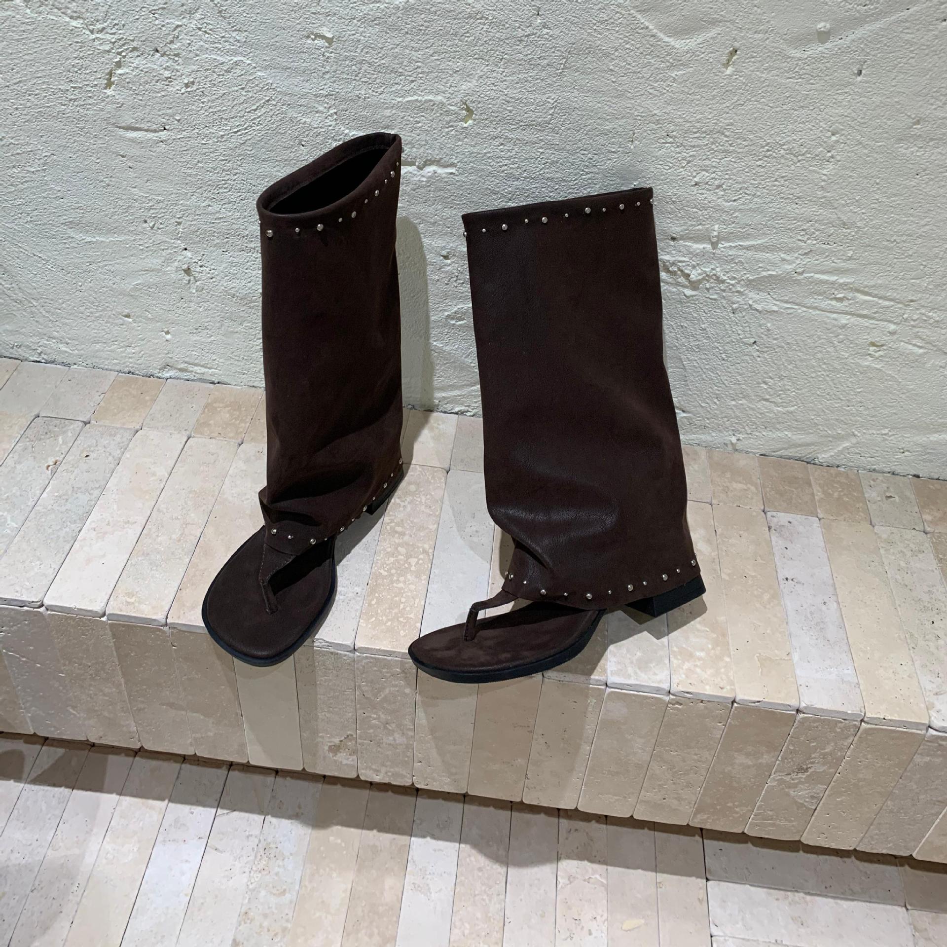 가벼운 럭셔리 틈새 복고풍 2025 여름 신작 여성 신발 샌들 겉옷 둥근 발가락 두꺼운 굽 플립 플롭 리벳 바지 샌들