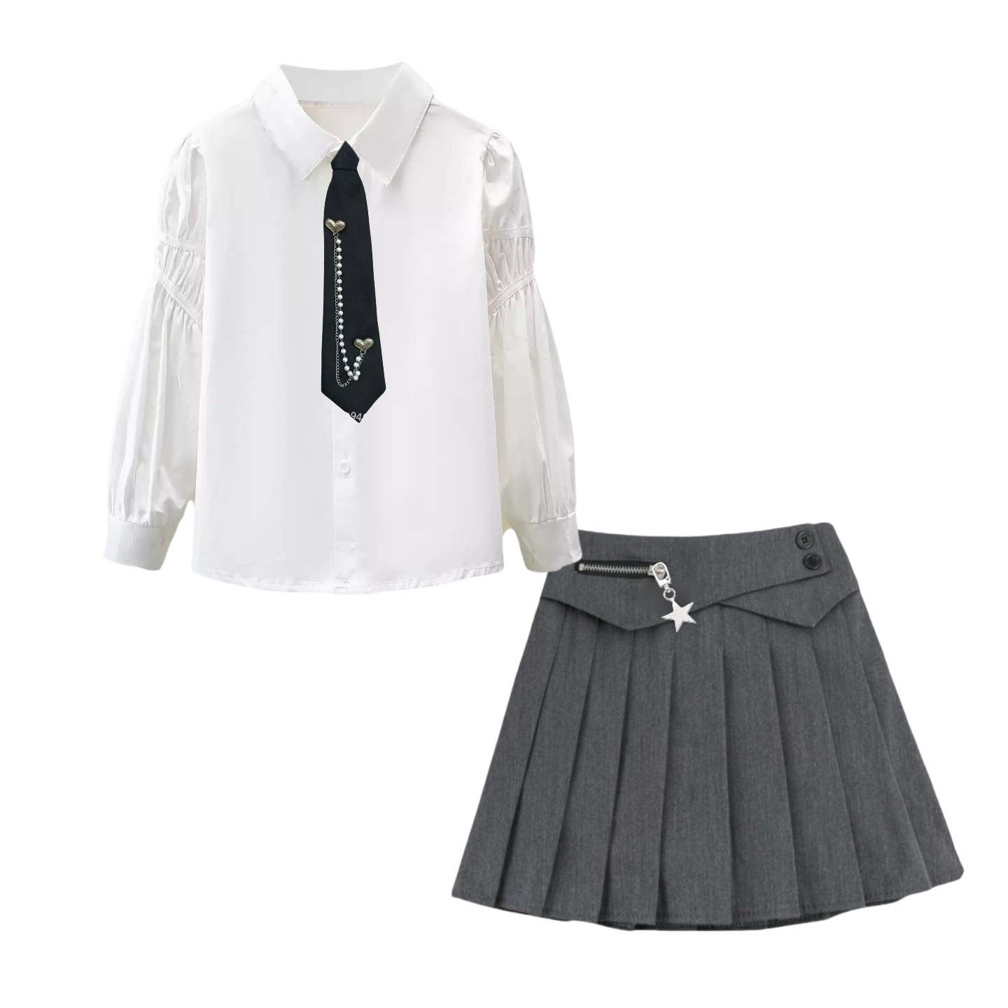 • 009 셔츠 + 별 플리츠 스커트 - 그레이 + 러브 타이