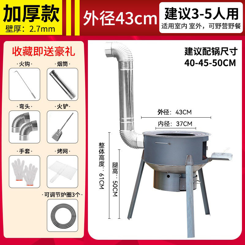 • 직경 43CM의 두꺼운 난로 + 굴뚝 선물 패키지가 포함된 난로 링 3개 - 일체형 장작 난로 [강화 강판]