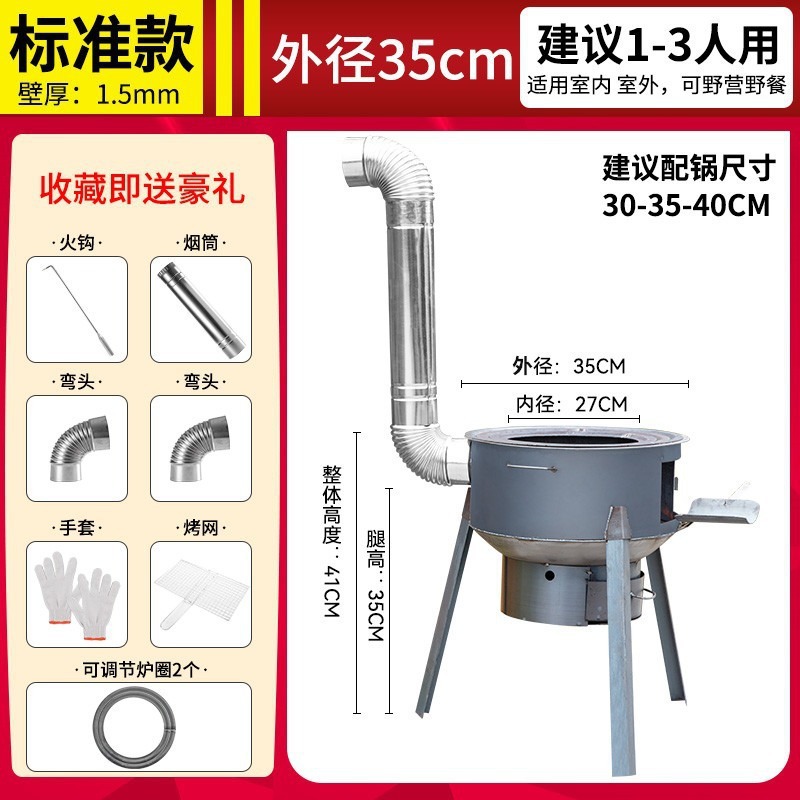 • 직경 35CM 난로 + 굴뚝 선물 패키지가 포함된 난로 링 2개 - 일체형 장작 난로 [강화 강판]