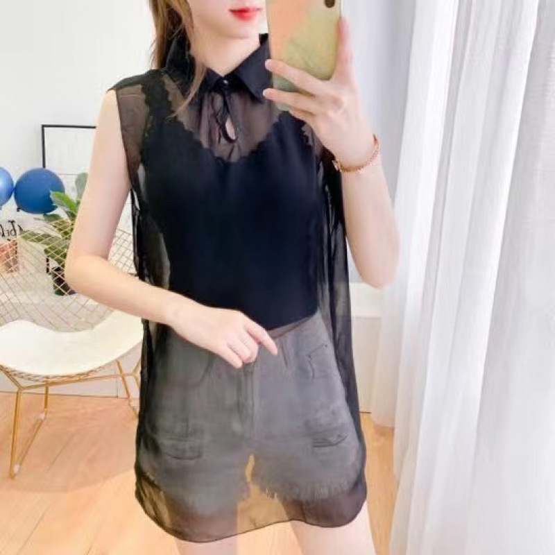 가을과 여름 여성을 위한 새로운 스타일의 민소매 한국식 다용도 슬리밍 루즈 통기성 쉬폰 전문 셔츠 셔츠 칼라 트렌디스토어 가기