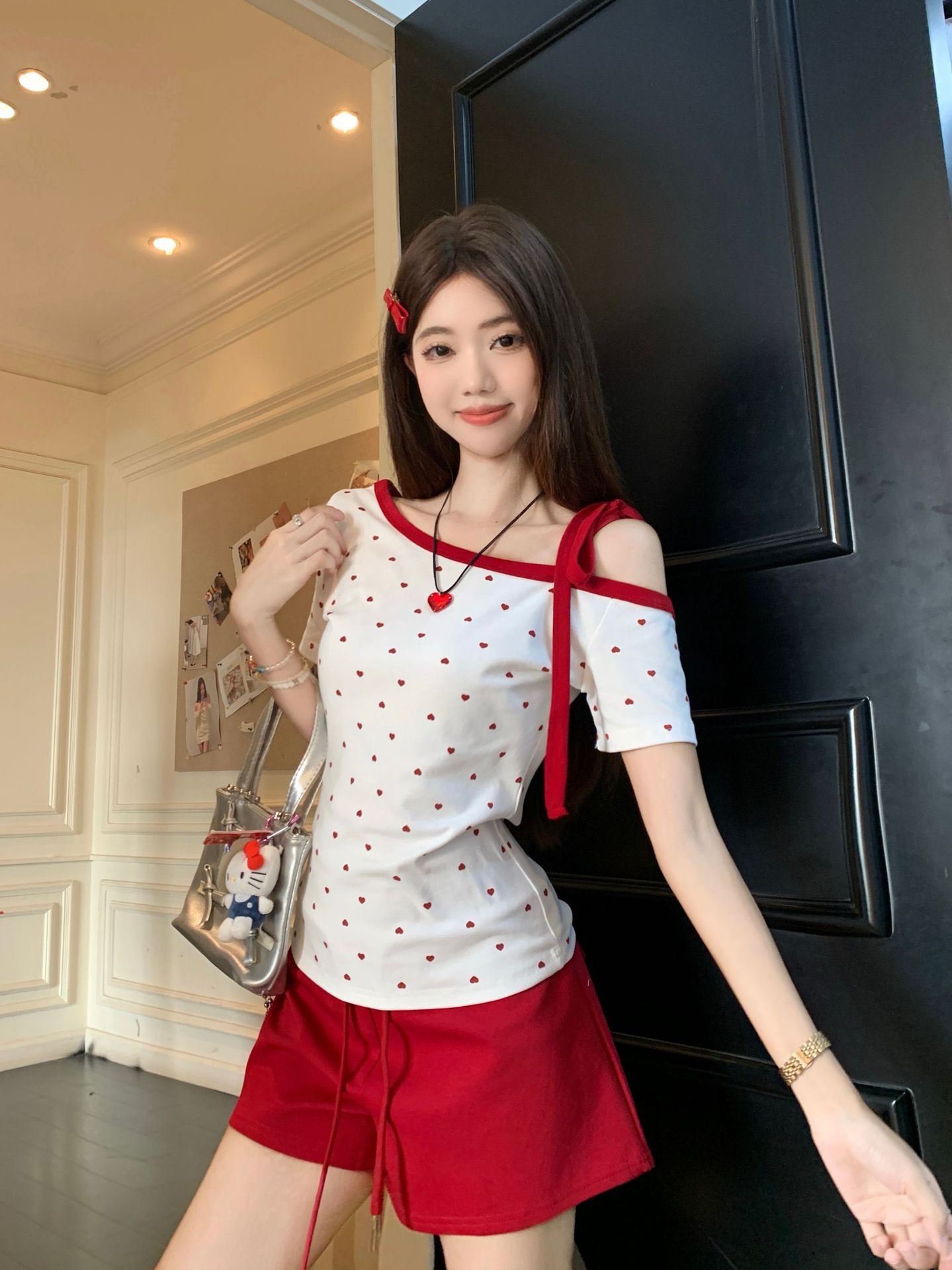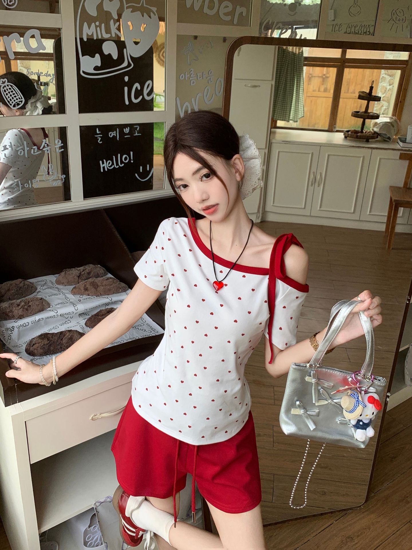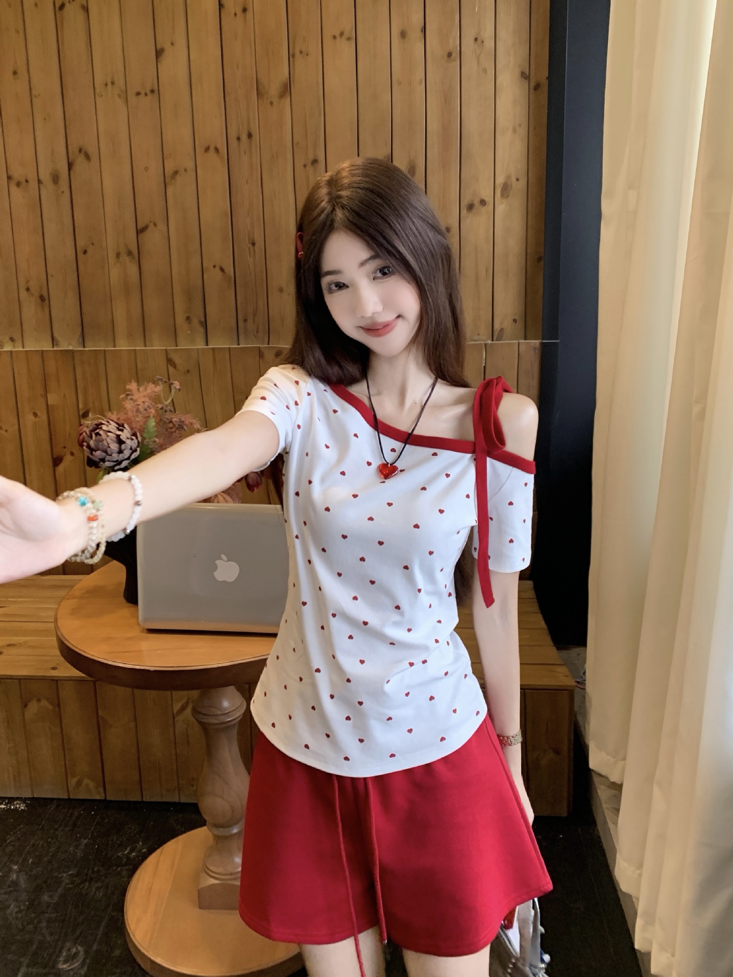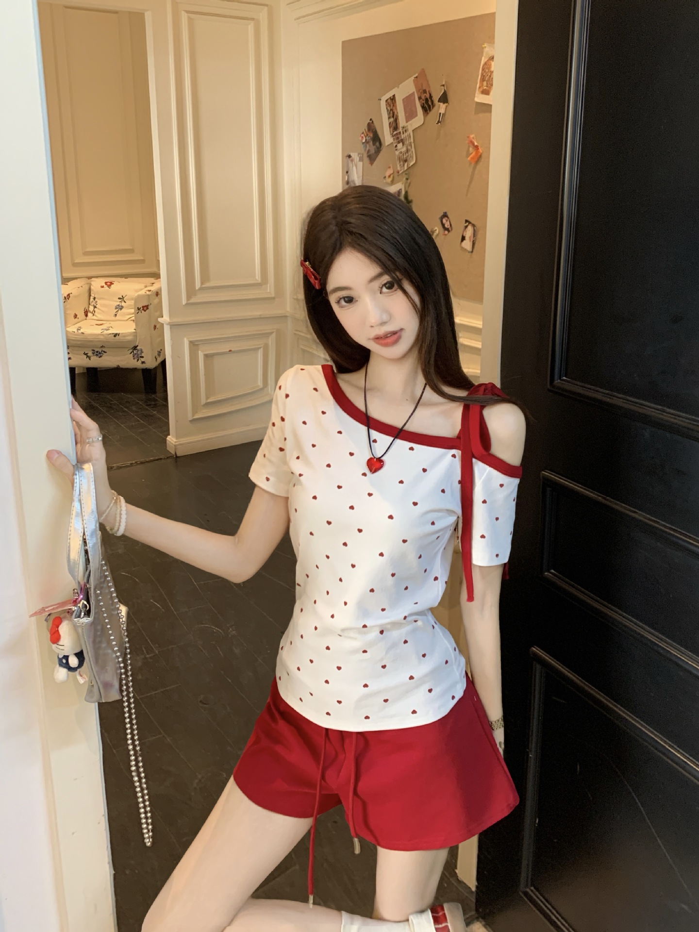 Sweet Hot Girl Love 프린트 오프 숄더 반팔 티셔츠 2025 여름 새 스트랩 디자인 여성용 슬리밍 탑