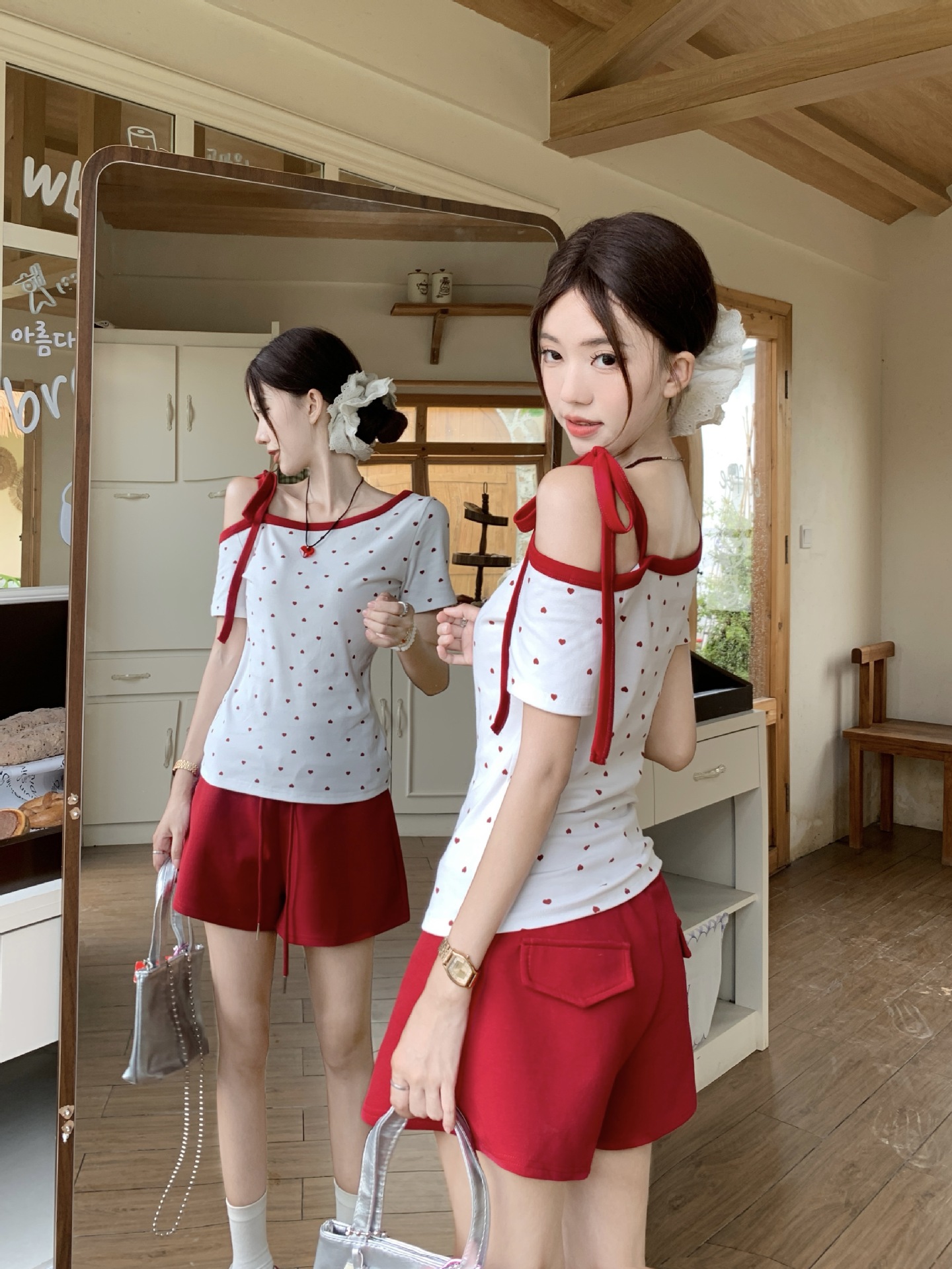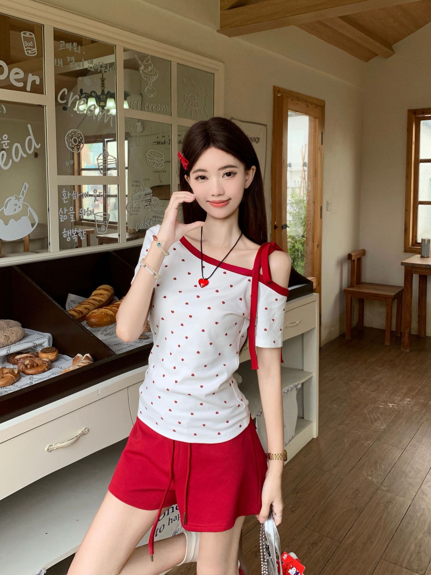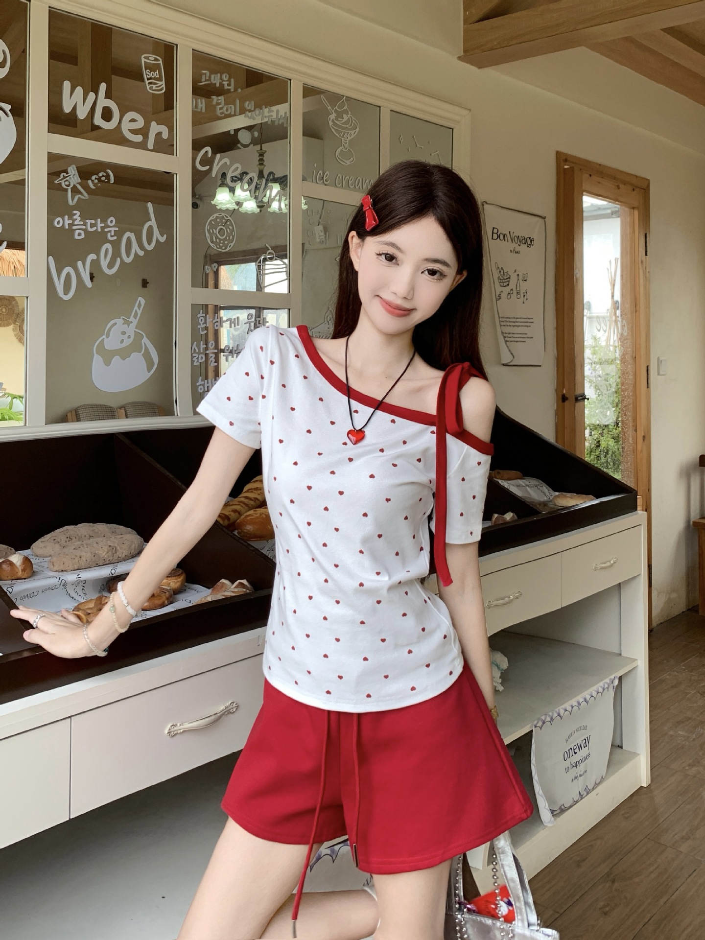 Sweet Hot Girl Love 프린트 오프 숄더 반팔 티셔츠 2025 여름 새 스트랩 디자인 여성용 슬리밍 탑