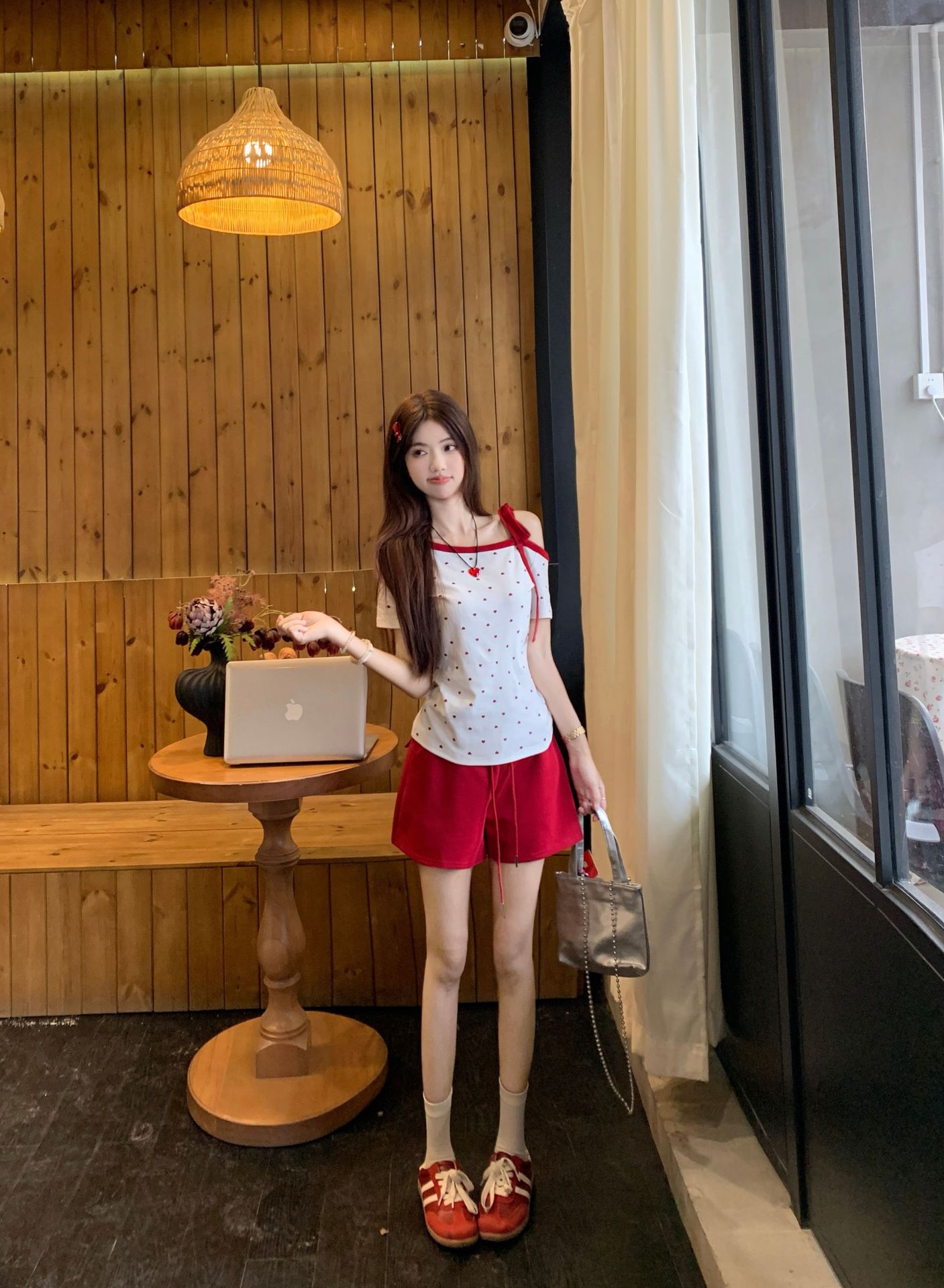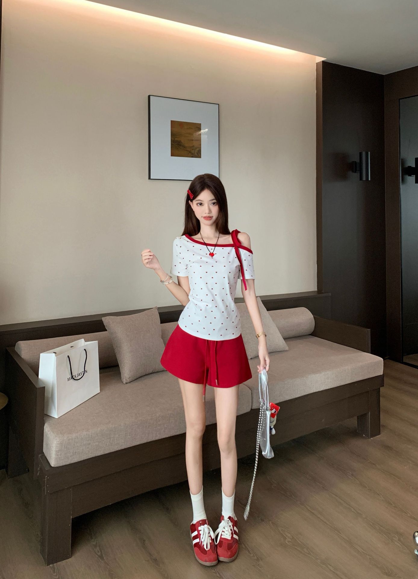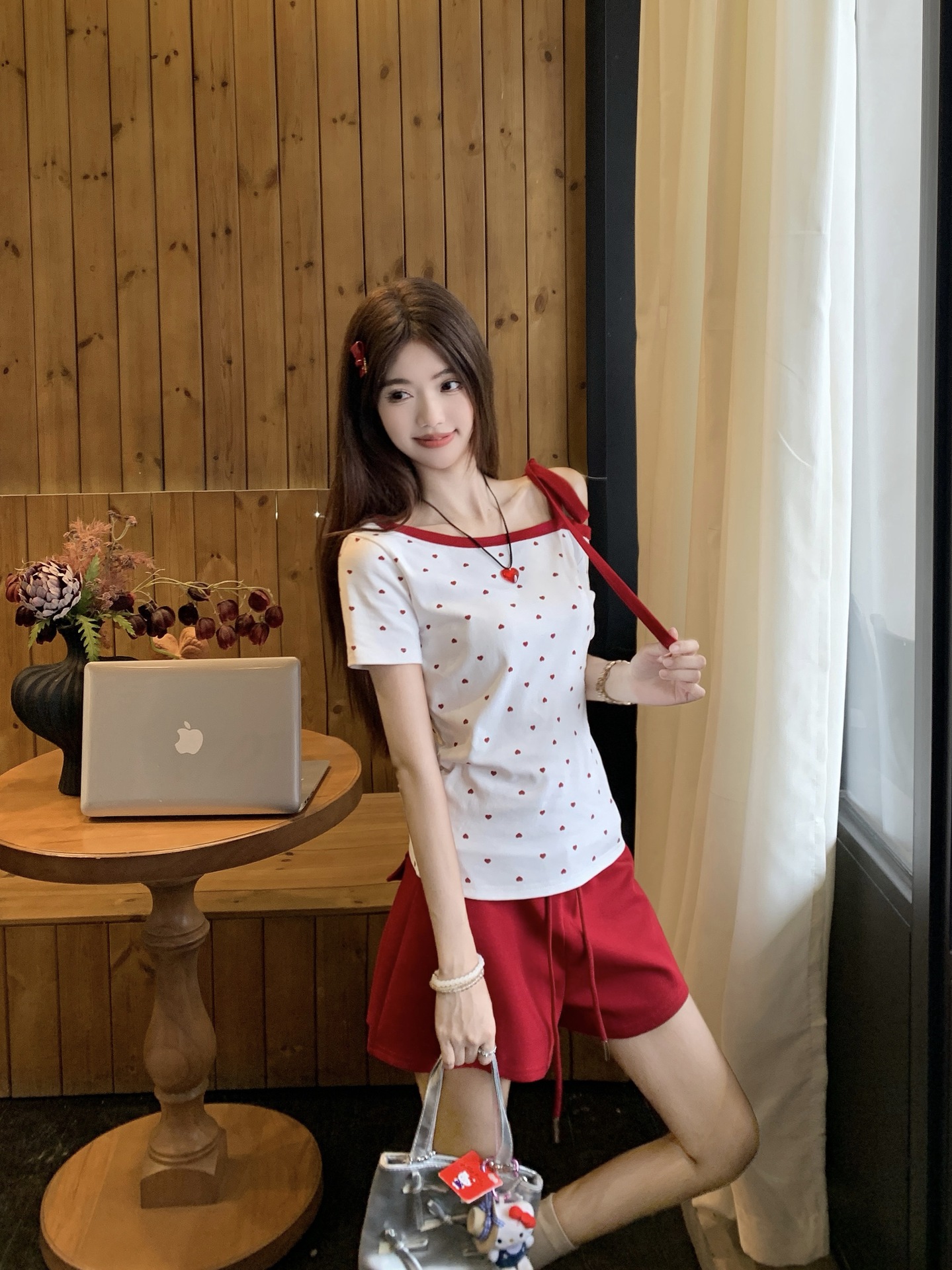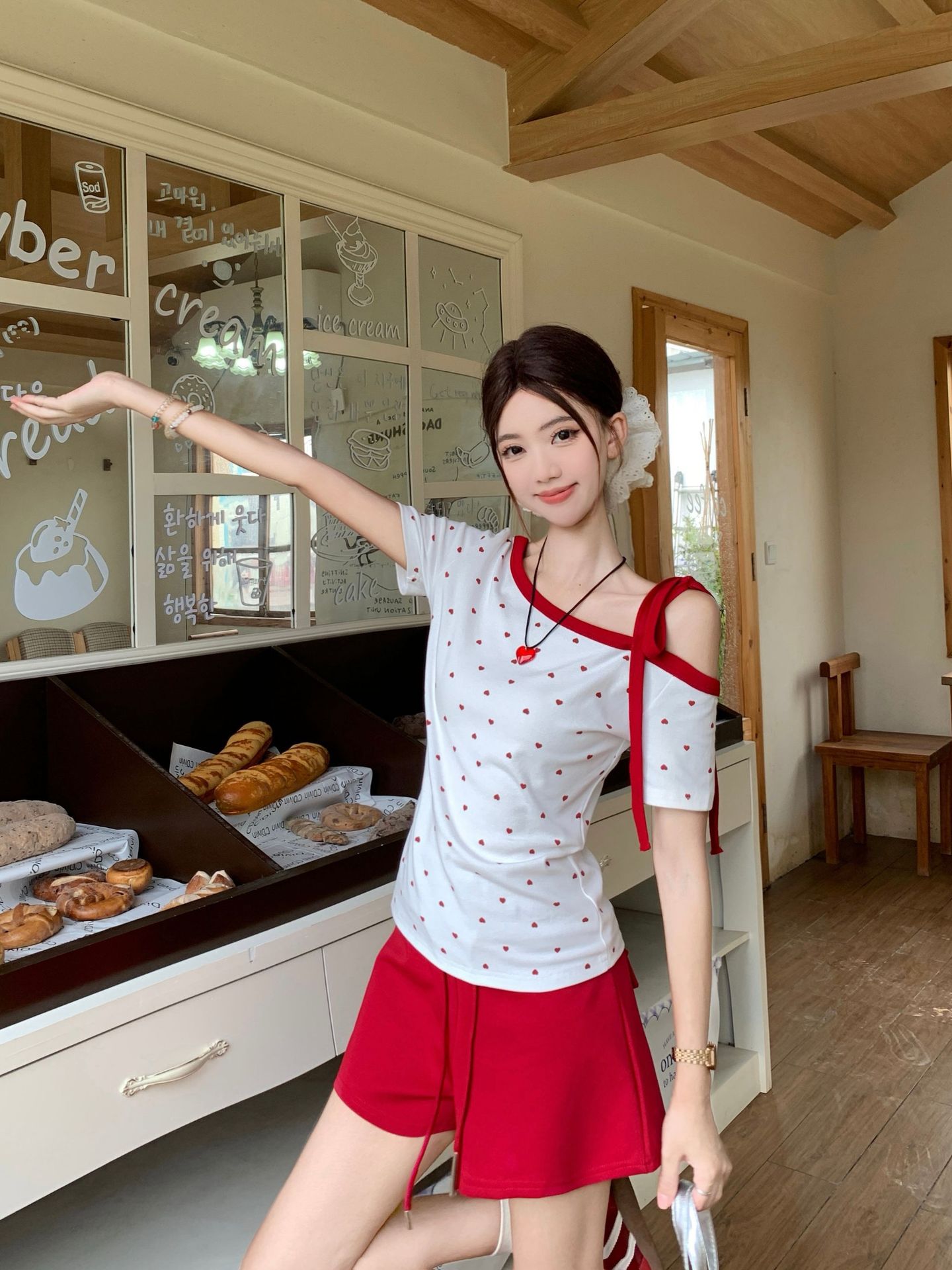Sweet Hot Girl Love 프린트 오프 숄더 반팔 티셔츠 2025 여름 새 스트랩 디자인 여성용 슬리밍 탑