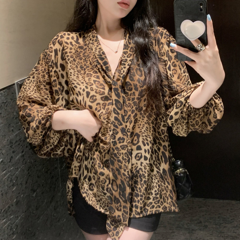한국 스타일 패션 핫 소녀 유행 레오파드 프린트 레이스 업 셔츠 여성 여름 드레이프 랜턴 슬리브 얇은 루즈 쉬폰 셔츠스토어 가기