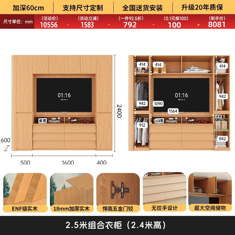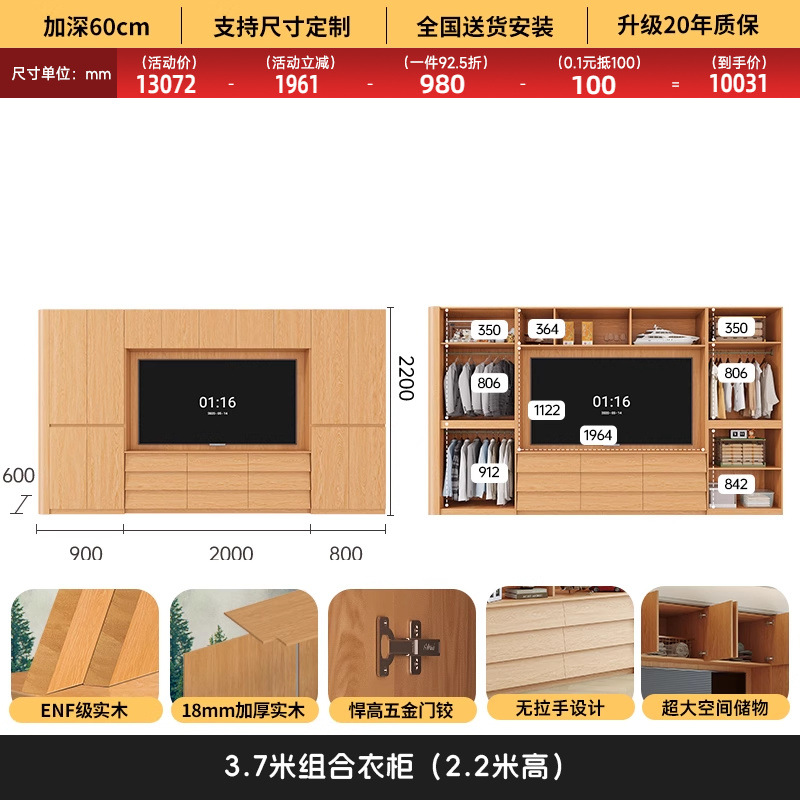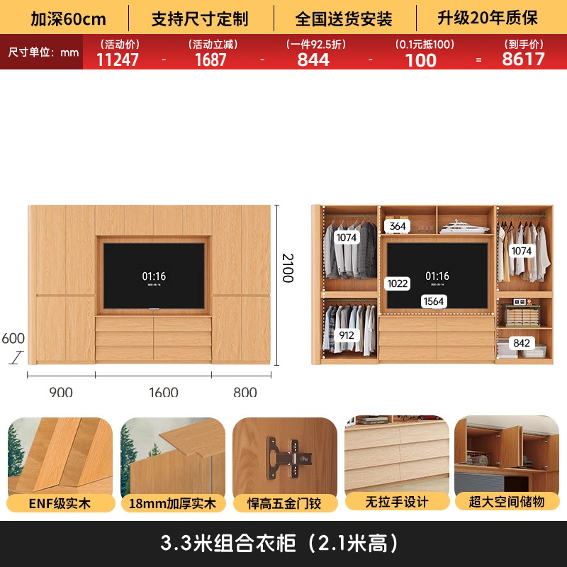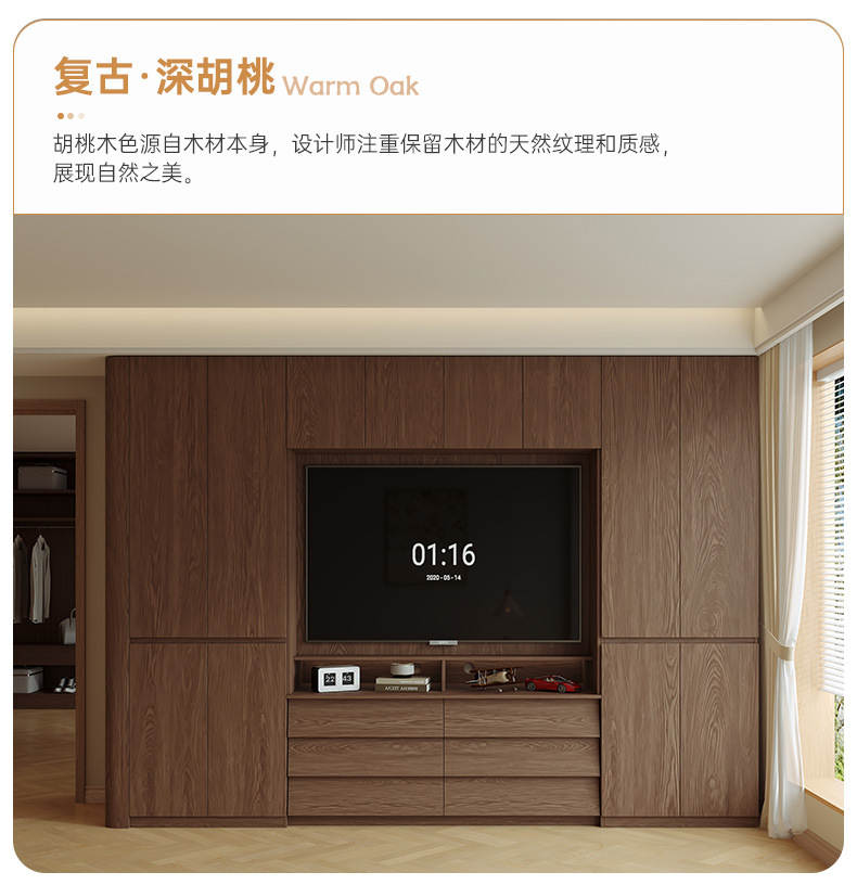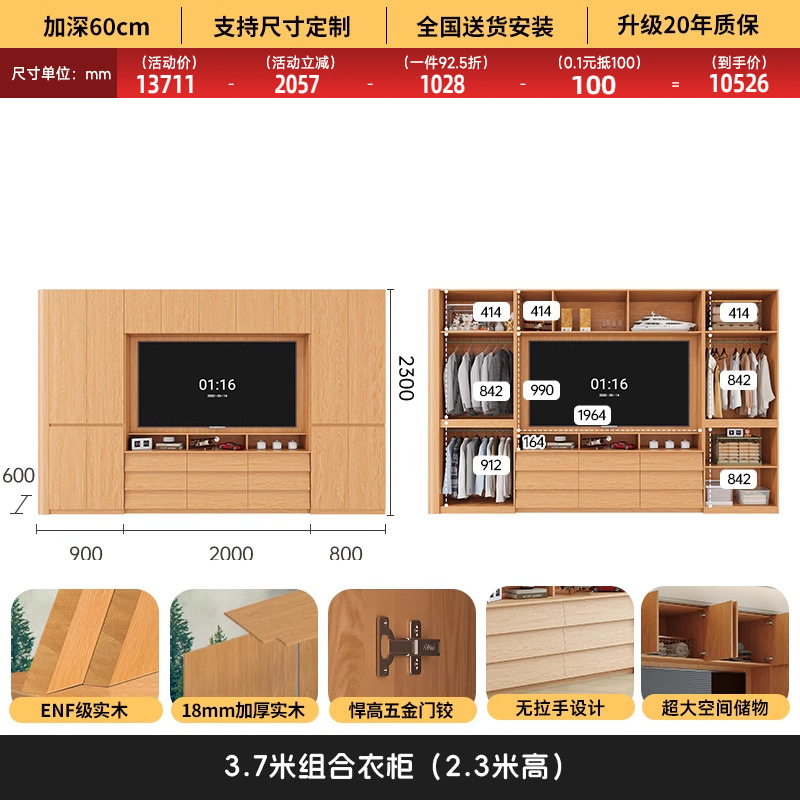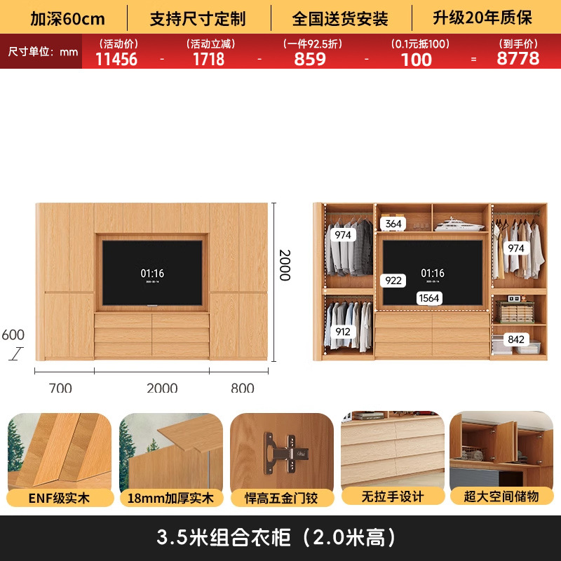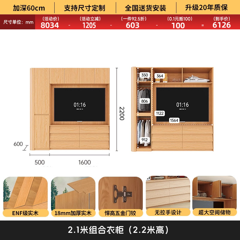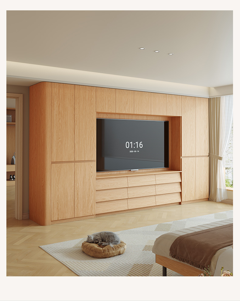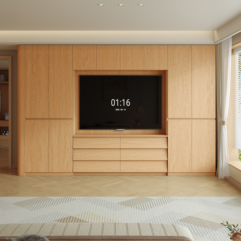 원목 고무나무 분할형 아치형 옷장, TV 내장 가능, 신형 침실 가정용 조합형 대형 옷장스토어 가기