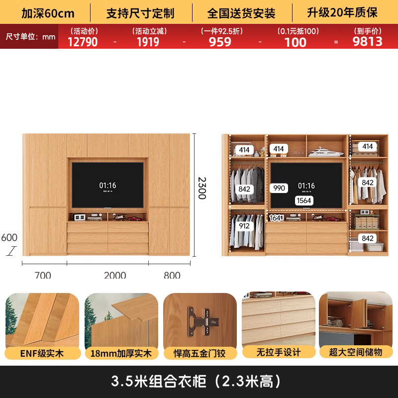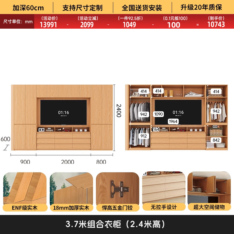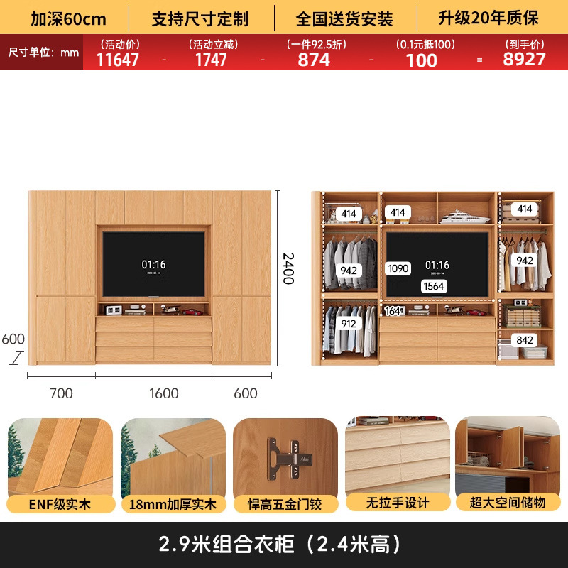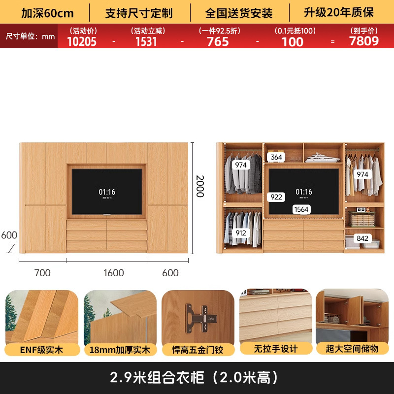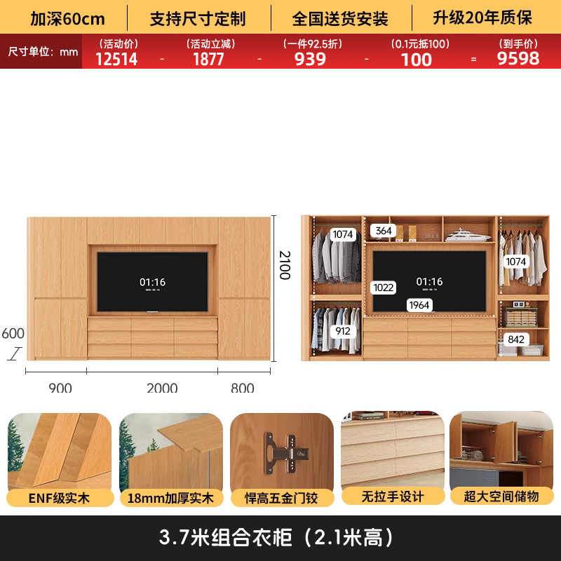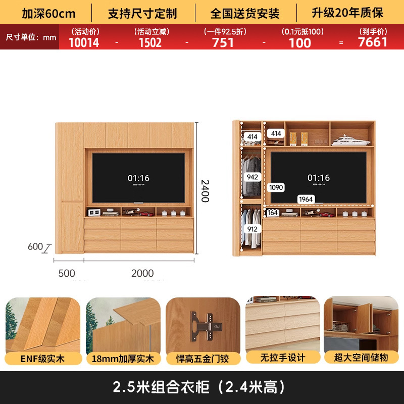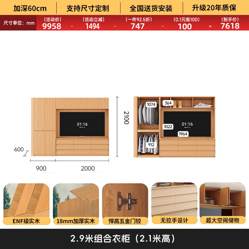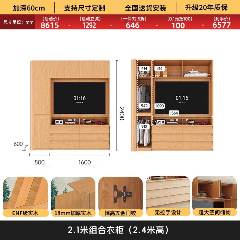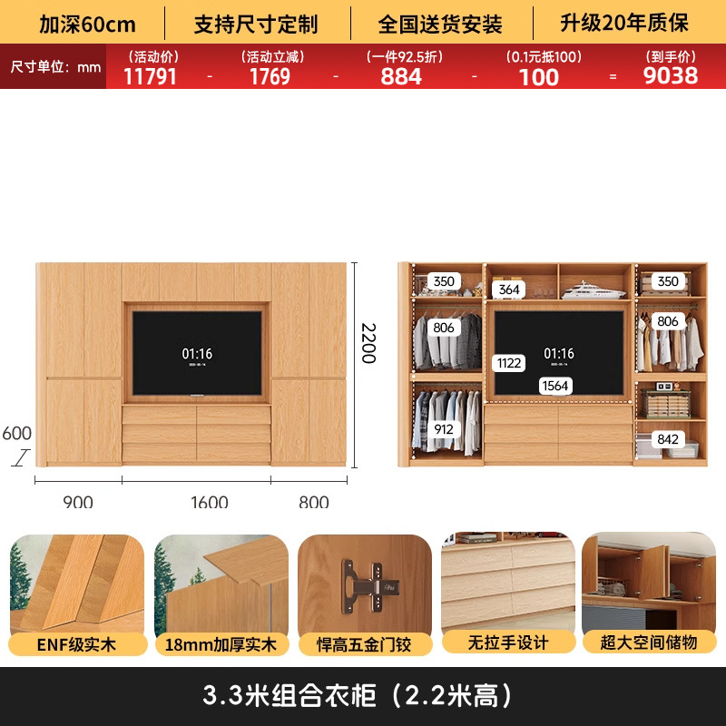원목 고무나무 분할형 아치형 옷장, TV 내장 가능, 신형 침실 가정용 조합형 대형 옷장스토어 가기