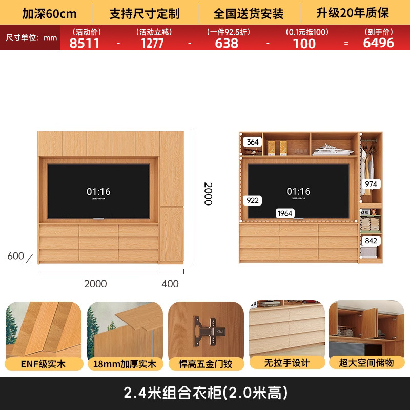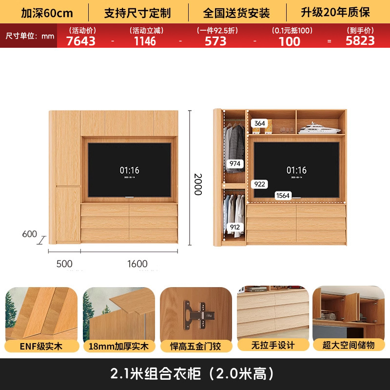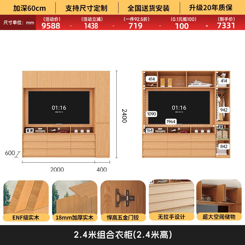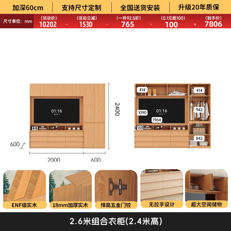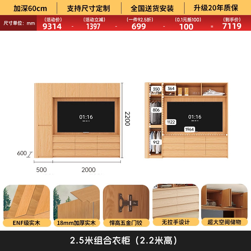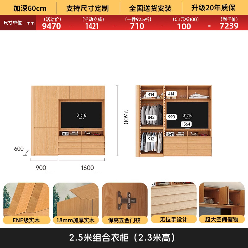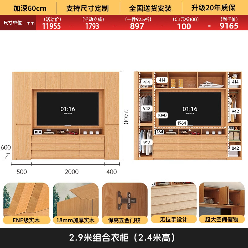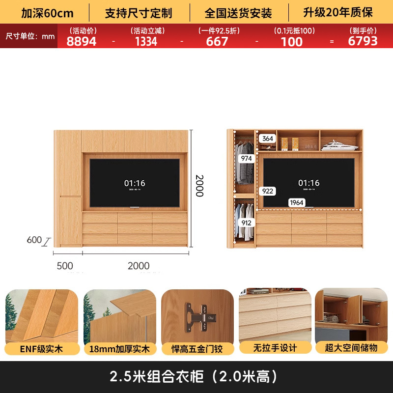 원목 고무나무 분할형 아치형 옷장, TV 내장 가능, 신형 침실 가정용 조합형 대형 옷장스토어 가기