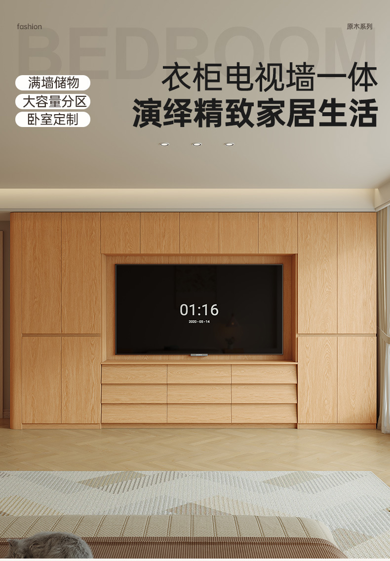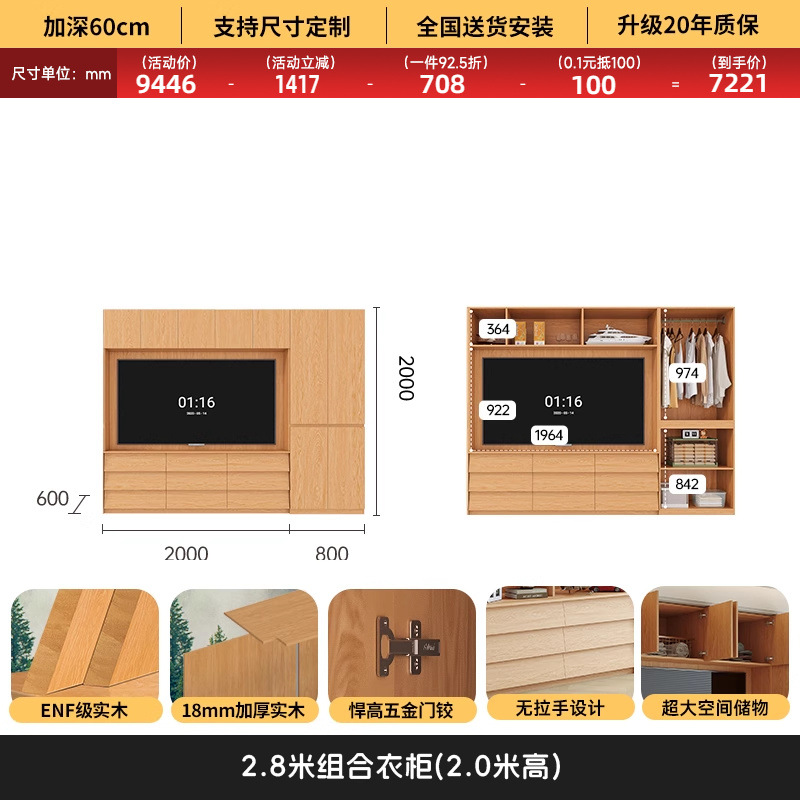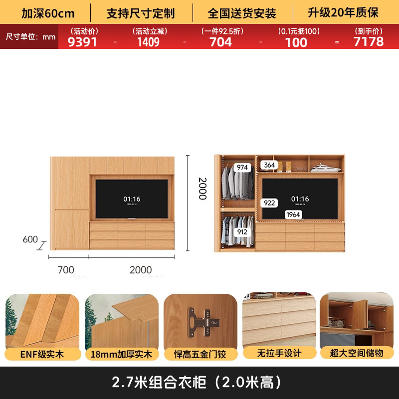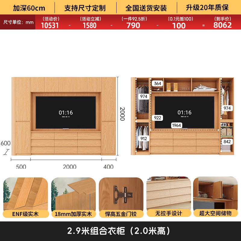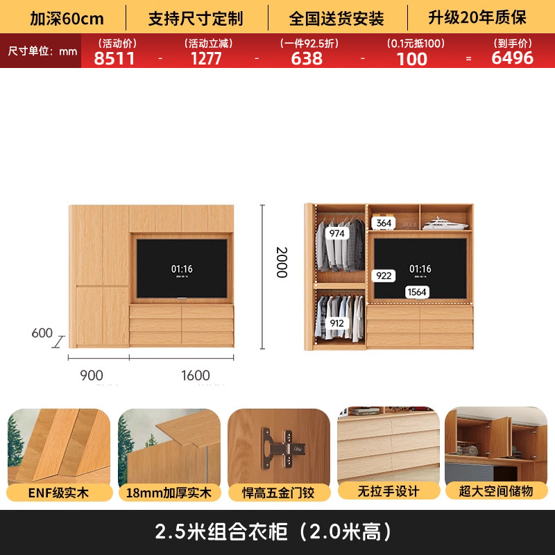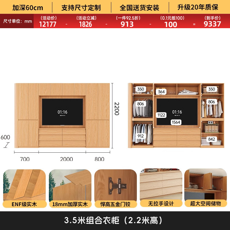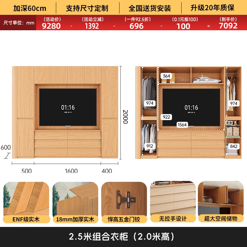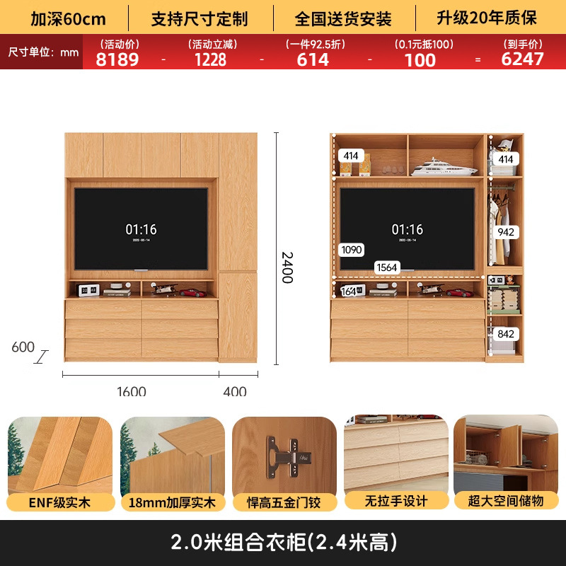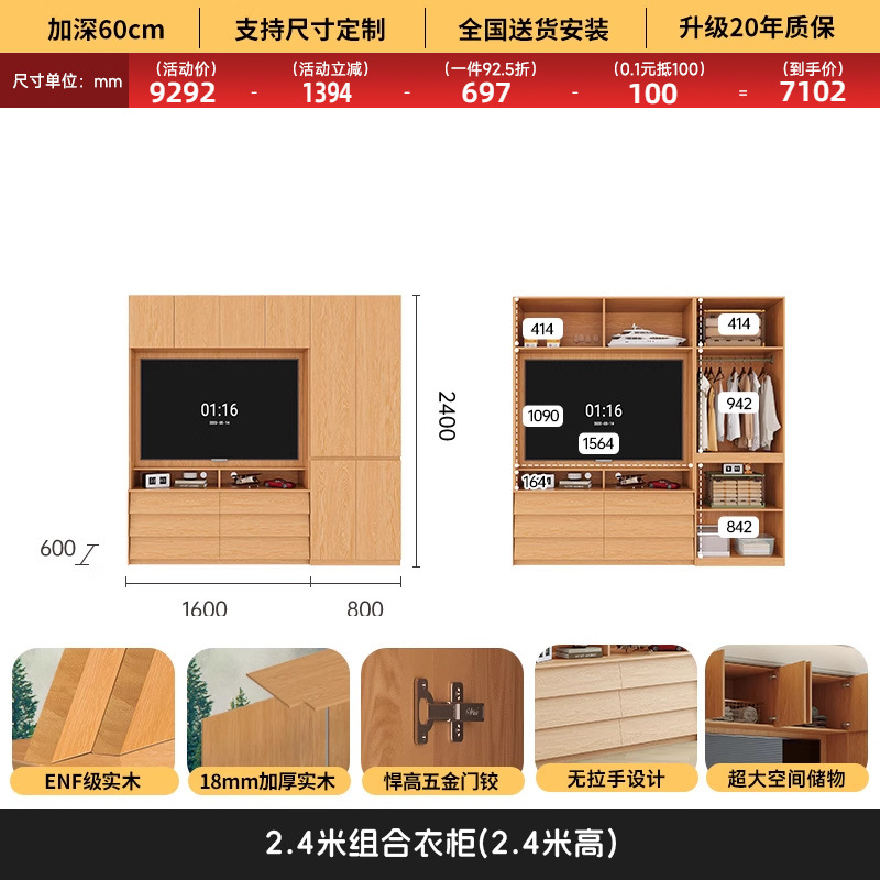 원목 고무나무 분할형 아치형 옷장, TV 내장 가능, 신형 침실 가정용 조합형 대형 옷장스토어 가기