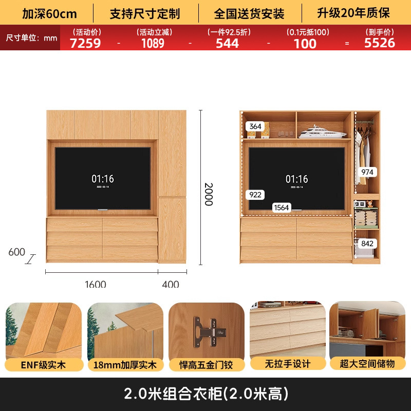 • 1.6*2.0(4도어 옷장)에 TV를 수납할 수 있습니다.