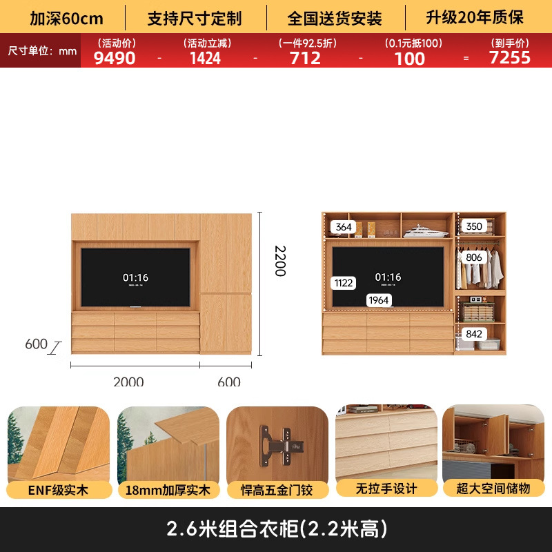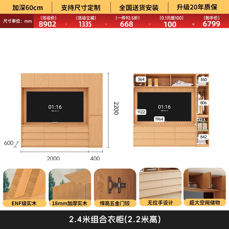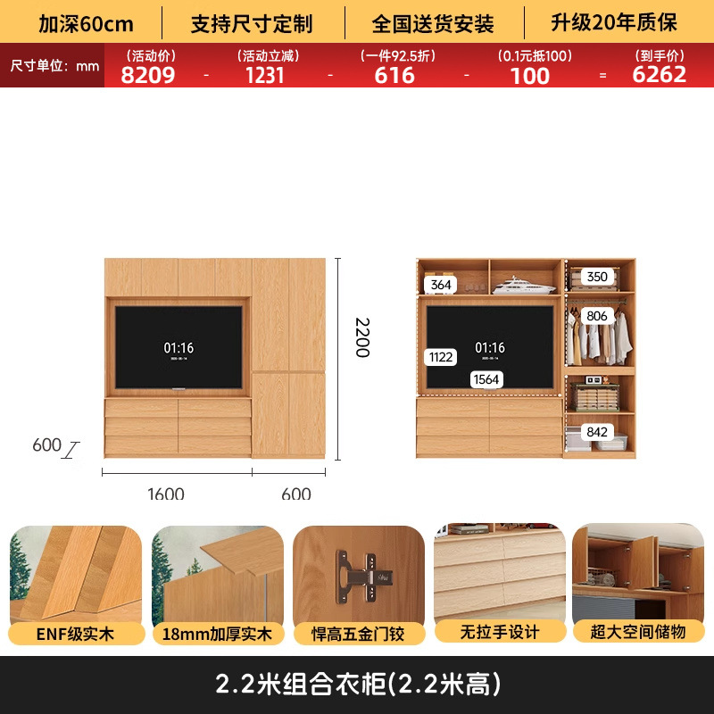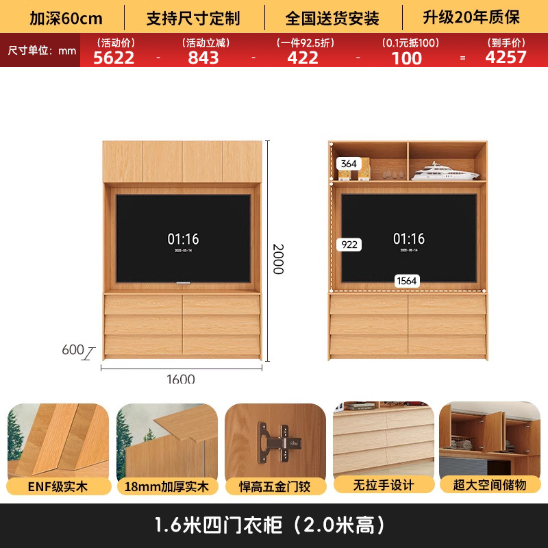 • 1.6*2.2(4도어 옷장)에 TV를 수납할 수 있습니다.