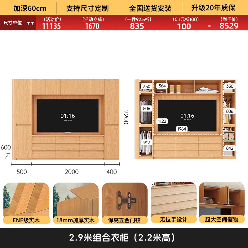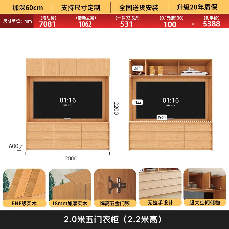 • 2.0*2.2(5도어 옷장)에 TV를 수납할 수 있습니다.