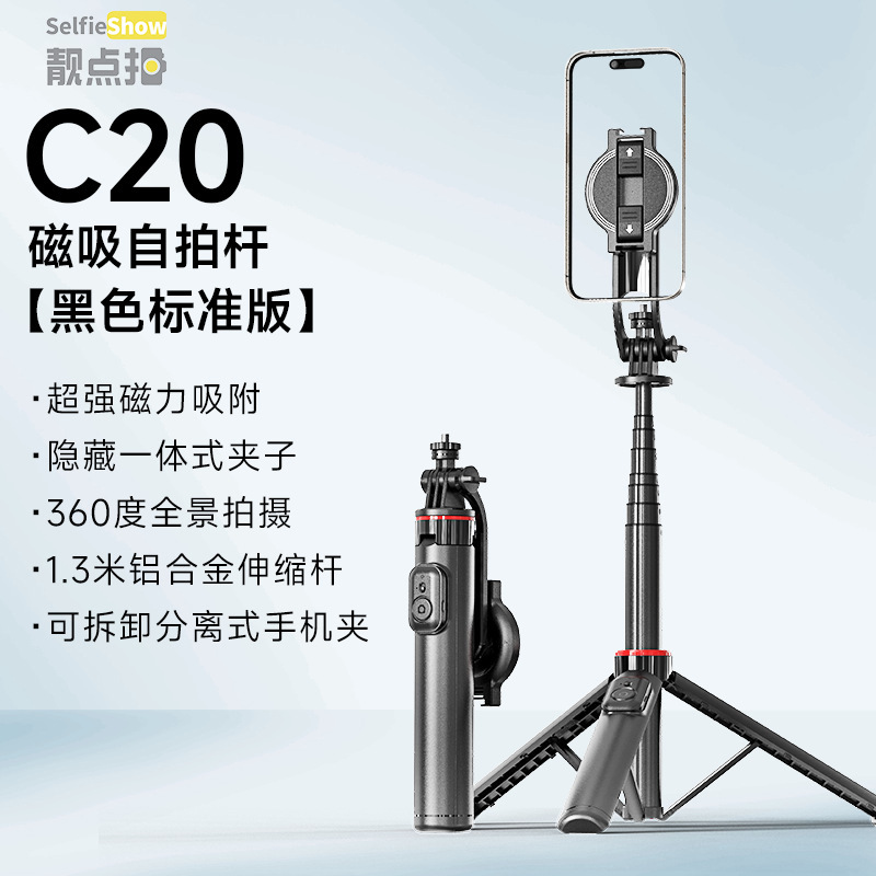 • 【C20-Black- 1.3m 】알루미늄 합금 샤프트 + 안정적인 삼각대 + 블루투스 리모컨 + 자석 클립
