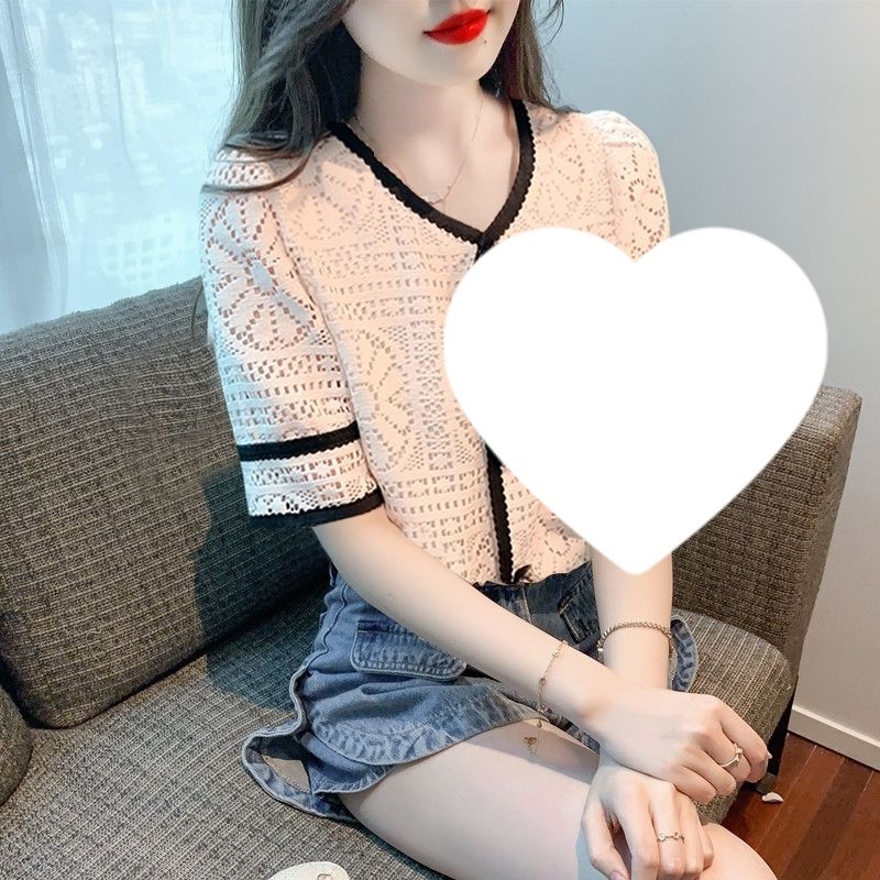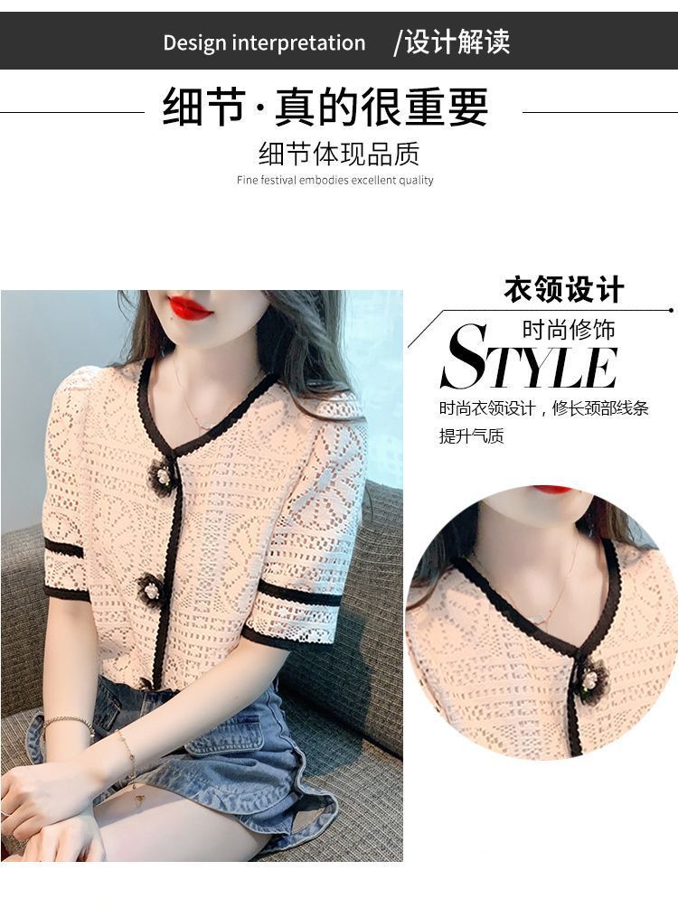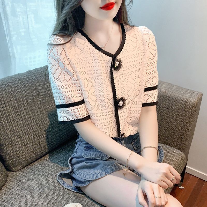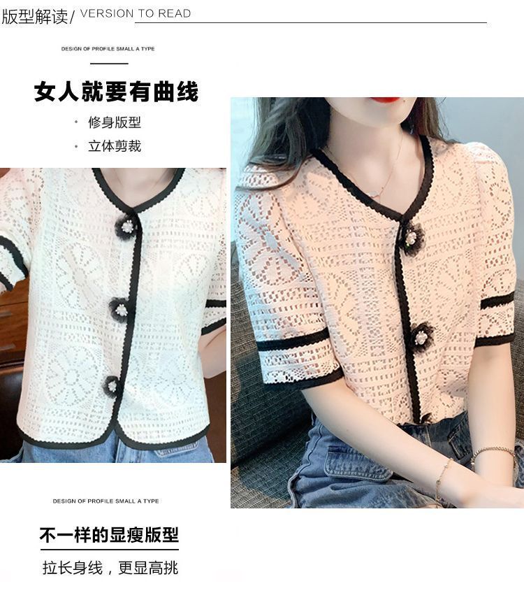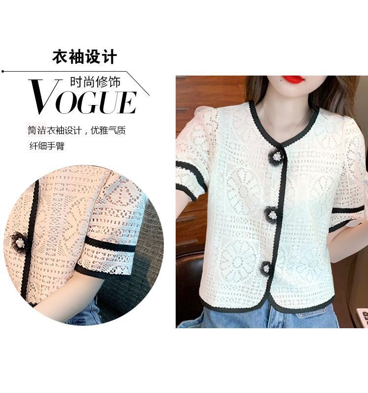 여성을위한 세련된 v 넥 카디건 반팔 쉬폰 셔츠 여름 2024 새로운 여름 디자인 크로 셰 뜨개질 중공 연령 감소 셔츠스토어 가기